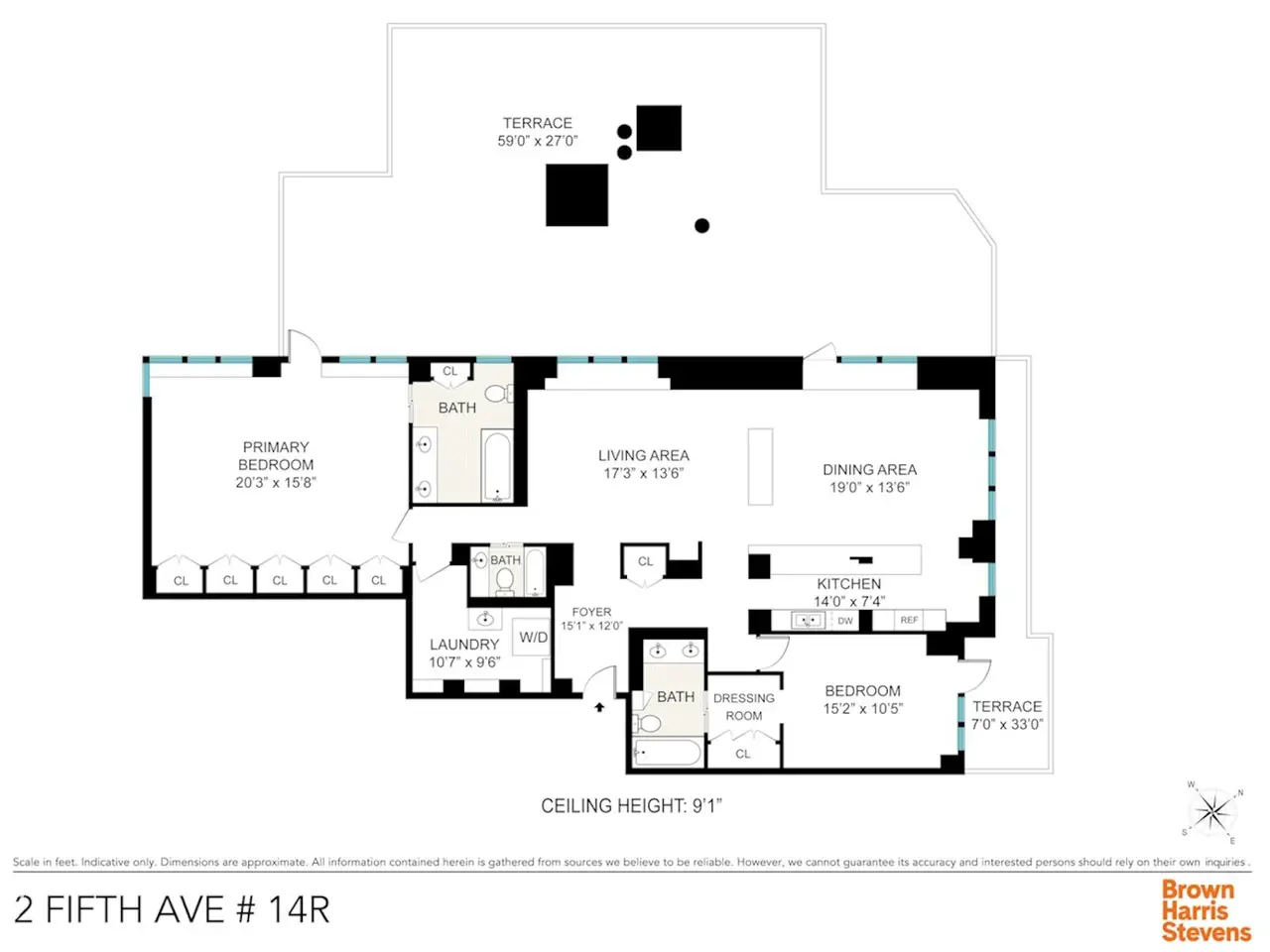 Trophy Terrace at 2 Fifth! Sleek and renovated to perfection, this spectacular Greenwich Village 3 bedroom/3 bath (see alternate floorplan) with unobstructed views, over 9" ceilings, and more than 1,250 square feet of private terraces is the pinnacle of luxury living. Custom retractable glass doors in the living/dining area create a seamless indoor/outdoor experience leading to your majestic terrace. Dramatic open vistas in 3 directions and outdoor space for personal serenity, or cocktails, hors d'oeuvres and dinner is truly rarefied air. A retractable projection TV, built-in Sonos audio, and remote electric solar shades, provides the perfect entertainment combination. Poggenpohl cabinets, top-of-the-line appliances, Caesarstone countertops, water filtration and a built-in coffee station makes this kitchen a cook's favorite. The primary bedroom is over 20' long with Poliform leather-wrapped closets and built-in desk. The en suite bathroom has double sinks, a soaking tub with rainfall shower, and heated towel rack and floors. The second bedroom has its own private terrace and en suite bathroom with steam shower and dressing area. Lutron lighting, Savant smart home system, built-in humidifying system, and all new windows are the perfect must haves. A third full bathroom and generous separate laundry room complete this move-in ready Gold Coast experience. Two Fifth Avenue is a full-service white-glove building in the Gold Coast of Greenwich Village. There is a gym, adult lounge, children's playroom, private library, storage bins, bike room and on-site dry cleaner. Pied-a-terre, pets and co-purchasing are all allowed with board approval. A garage and the circular driveway add to the long list of amenities making this building one of the finest around. Located in one of the most desirable locations in all of New York City; close to fabulous restaurants, shopping and of course, iconic Washington Square Park.