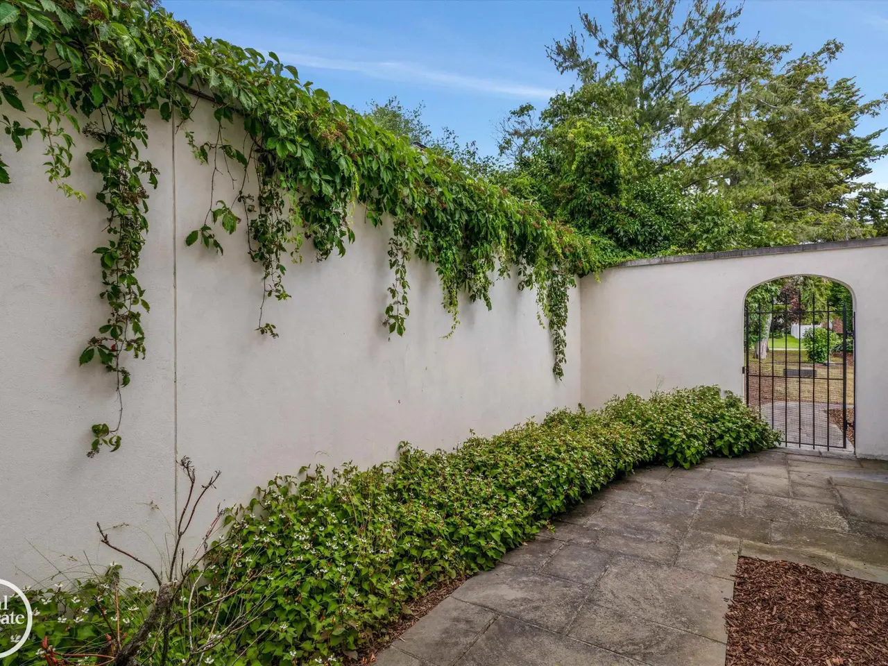 - French doors to walled garden oasis Bluestone patio from sunroom/den