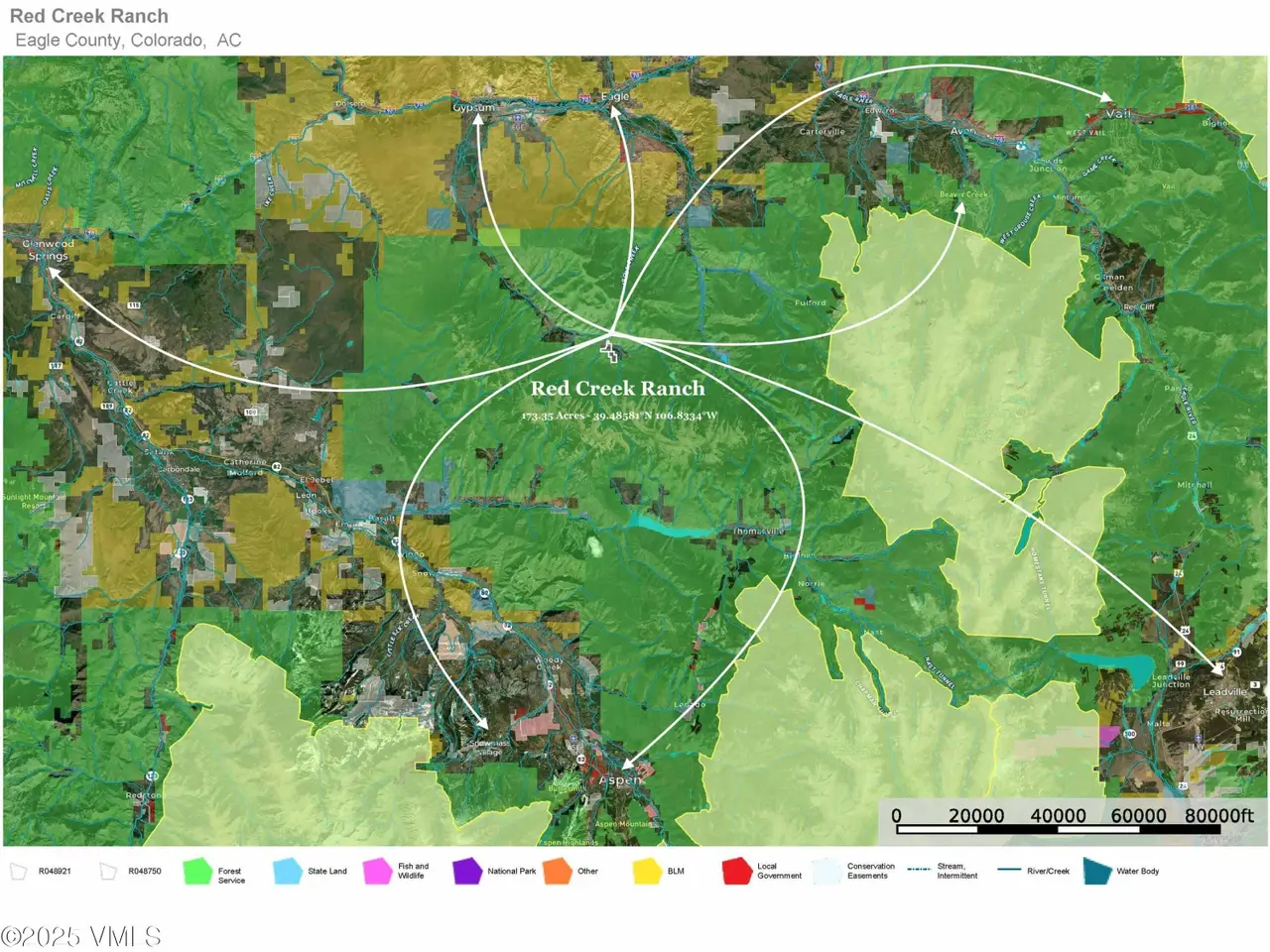 The Red Creek Ranch (RCR) is conveniently located between Colorado's Vail and Aspen ski resorts. The 173-acre property borders - and is virtually surrounded by - the White River National Forest. 'Live Water' flows through the CCR from Red Creek and Gypsum Creek. The elevation of the ranch ranges from 8,400' to 9,160' and supports a wide range of Colorado's diverse flora [riparian creeks, aspen groves, pine forests, sagebrush hills, open pastures] and fauna [deer, elk, moose, bear, coyote, fox]. The property is in Game Management Unit (GMU) 44 and offers direct access to thousands of acres of hunting and hundreds of miles of USFS off-road-vehicle-approved (ORV) roads leading to Sylvan Lake, Ruedi Reservoir, and beyond. Located 52 miles from Vail, 47 miles from Beaver Creek, 17 miles from the Vail Valley Jet Center, and 80.4 miles from Aspen, the Campbell Creek Ranch offers privacy, accessibility, and is the starting point of the ideal Colorado mountain getaway. The gentle topography also offers abundant options to build your 'cabin in the woods'. The Red Creek Ranch is adjacent to the 'available-for-sale' Campbell Creek Ranch [71.6 acres] and recently sold Red Creek Trail Ranch [65 acres]. Red Creek Ranch GPS Coordinates are 39.48581 degrees N 106.8334 degrees W. A custom interactive map of the ranch and surrounding area is available upon request.