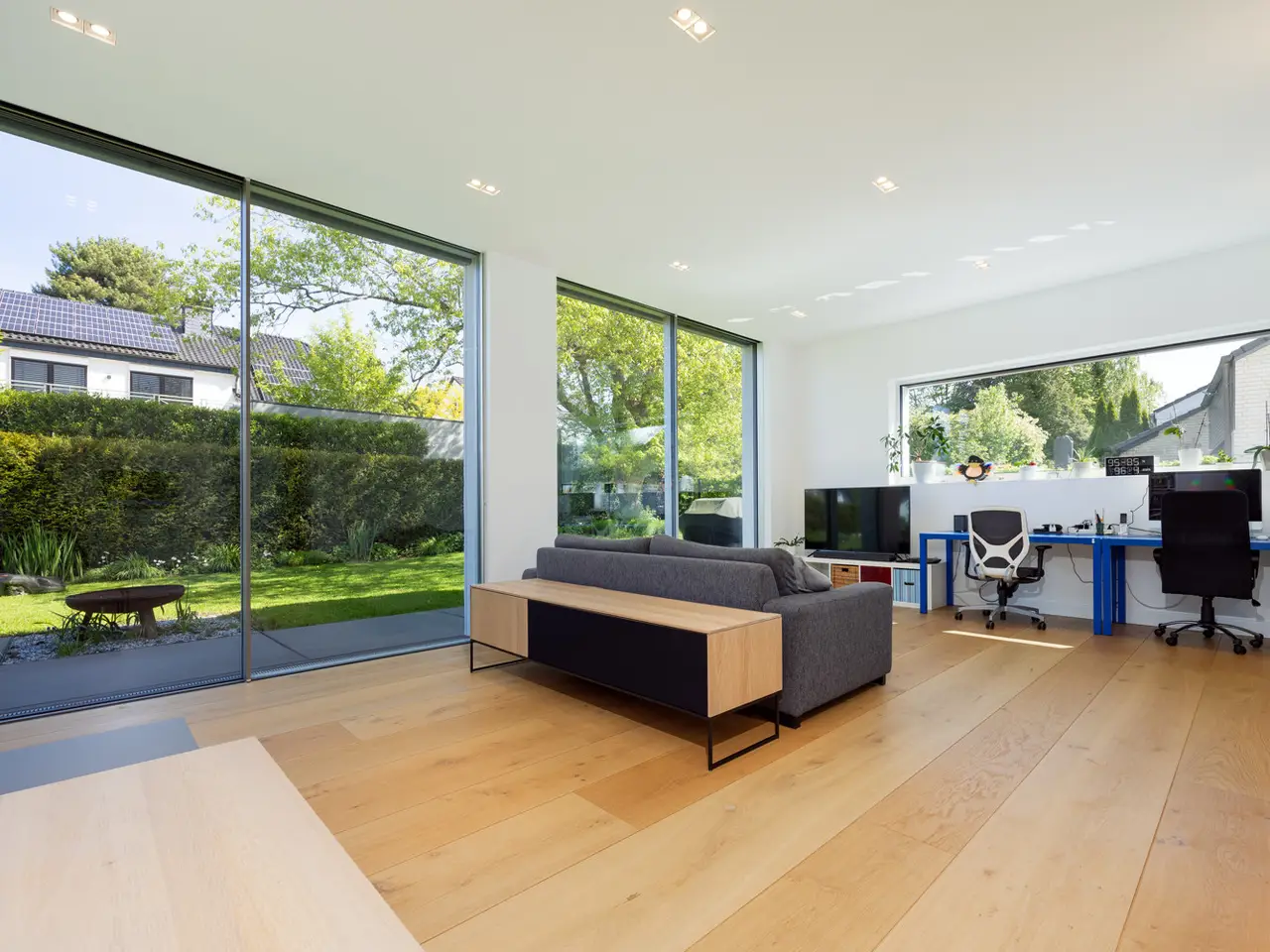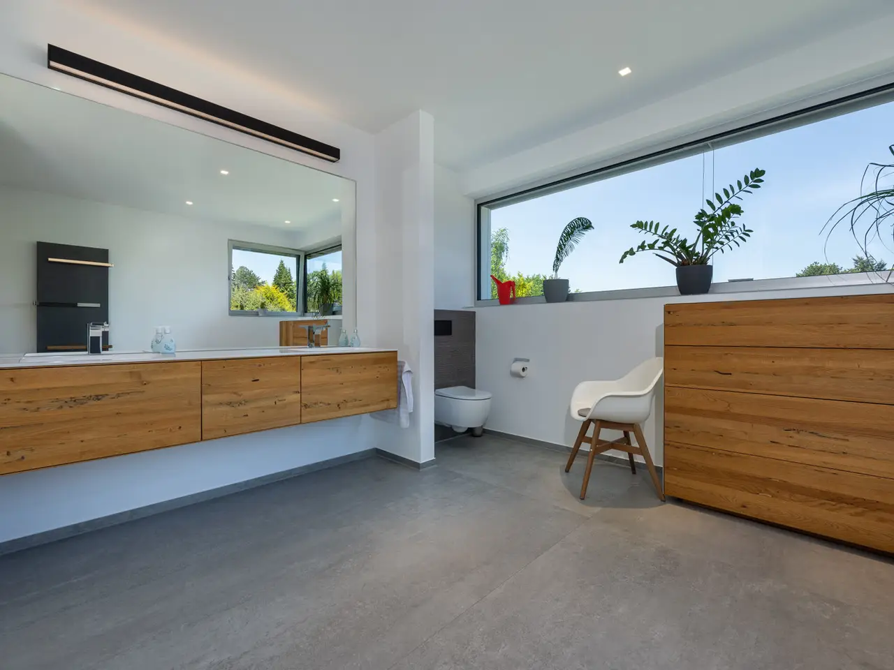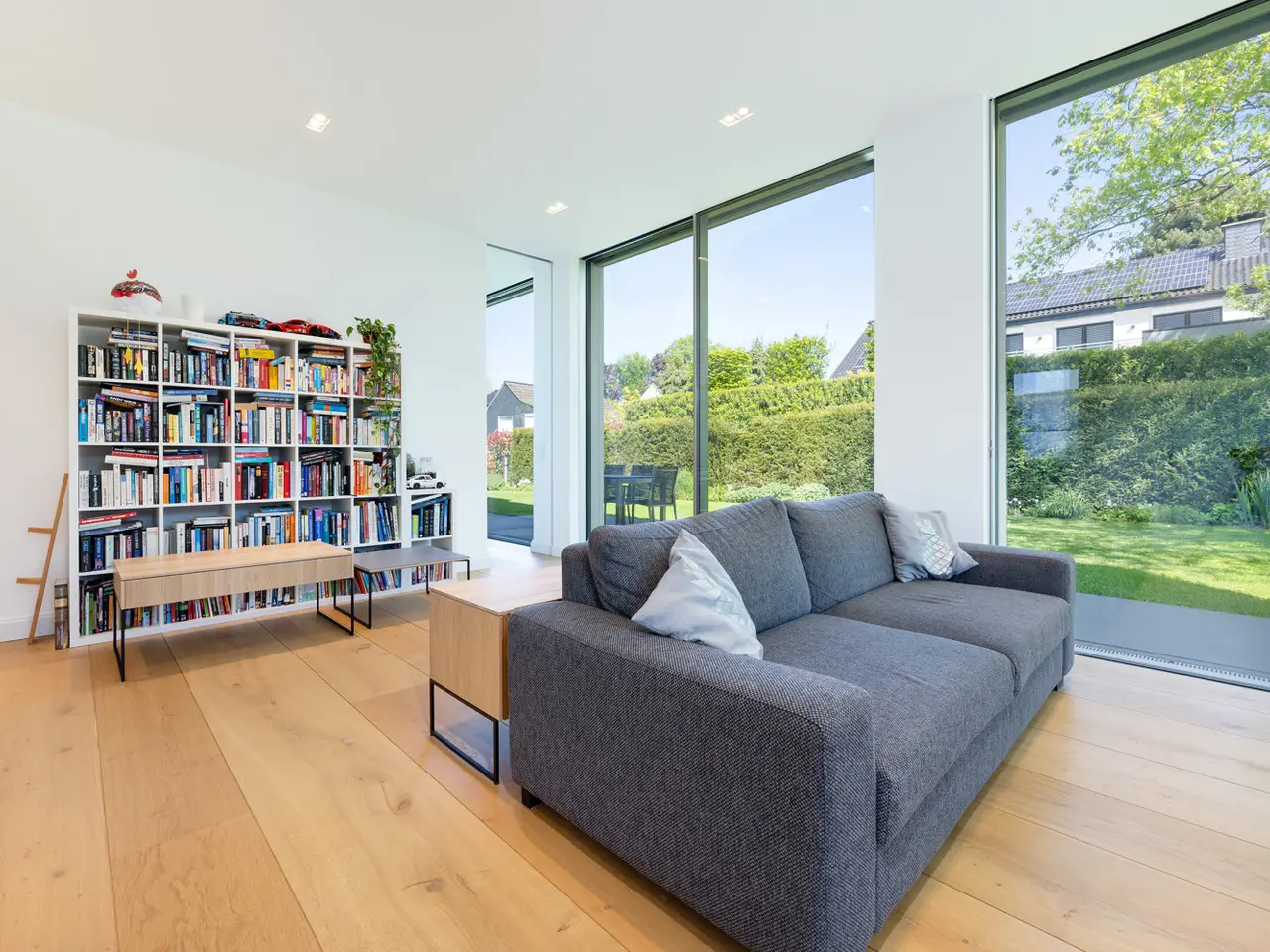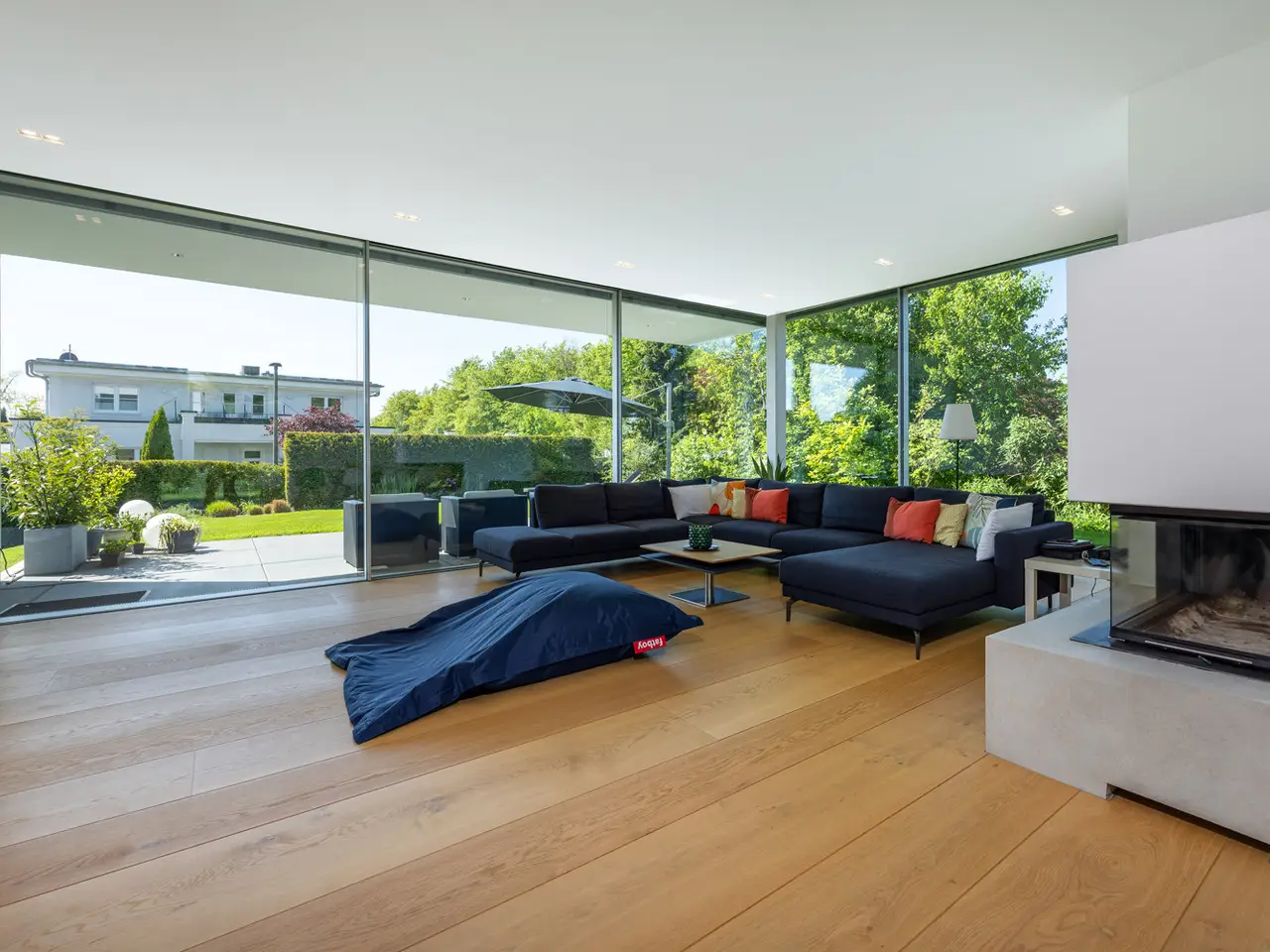 This modern villa, including a large granny apartment, completed in 2019, is situated on a plot of approx. 1,088 m² and offers a living space of around 380 m². This as-new property with its exceptional design and high-quality fixtures and fittings impresses with its generous room layout and technical refinements. The light-flooded first floor with a room height of 3.00 meters impresses with floor-to-ceiling Sky Frame windows, some equipped with electric drives and complemented by electric blinds in a Venetian blind design. Floor-to-ceiling sliding doors on the first floor and floor-to-ceiling doors on the upper floor ensure an extraordinary sense of space as well as perfect lines of sight and light. There are eight spacious rooms in the villa, including five bedrooms. The three stylishly furnished bathrooms offer maximum comfort and have been designed with extra-long and wide tiles. The living/dining area is divided by an elegant fireplace, which can be seen from three sides through glass surfaces, creating a pleasant atmosphere. High-quality oak floorboards, five meters long and extra wide, underline the elegant ambience of the house. The modern Bulthaup kitchen is equipped with high-quality appliances and offers plenty of space for culinary development. Another gastronomic highlight is the in-house wine cellar. The villa's climate-friendly energy concept is supported by a geothermal heat pump, a photovoltaic system and underfloor heating. A central ventilation system ensures a pleasant indoor climate. The property also has a smart KNX bus system for convenient control of the building services. An outstanding feature of this villa is the heated underground garage with six parking spaces and three additional outdoor parking spaces. A separate apartment with two rooms, fitted kitchen and bathroom is available for guests or staff and can be accessed via a separate entrance. The property meets the highest standards of living quality and energy efficiency and is ideal for families or discerning individualists who value exclusive living. The residential location offers good connections and a quiet but central residential area. Please contact us for further information or to arrange a viewing appointment to see this unique residential offer for yourself.
