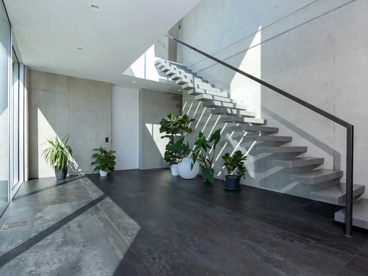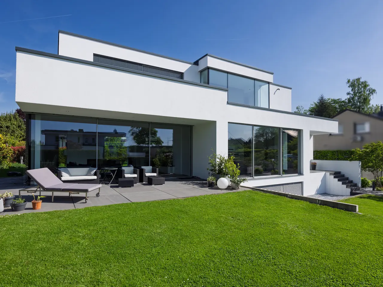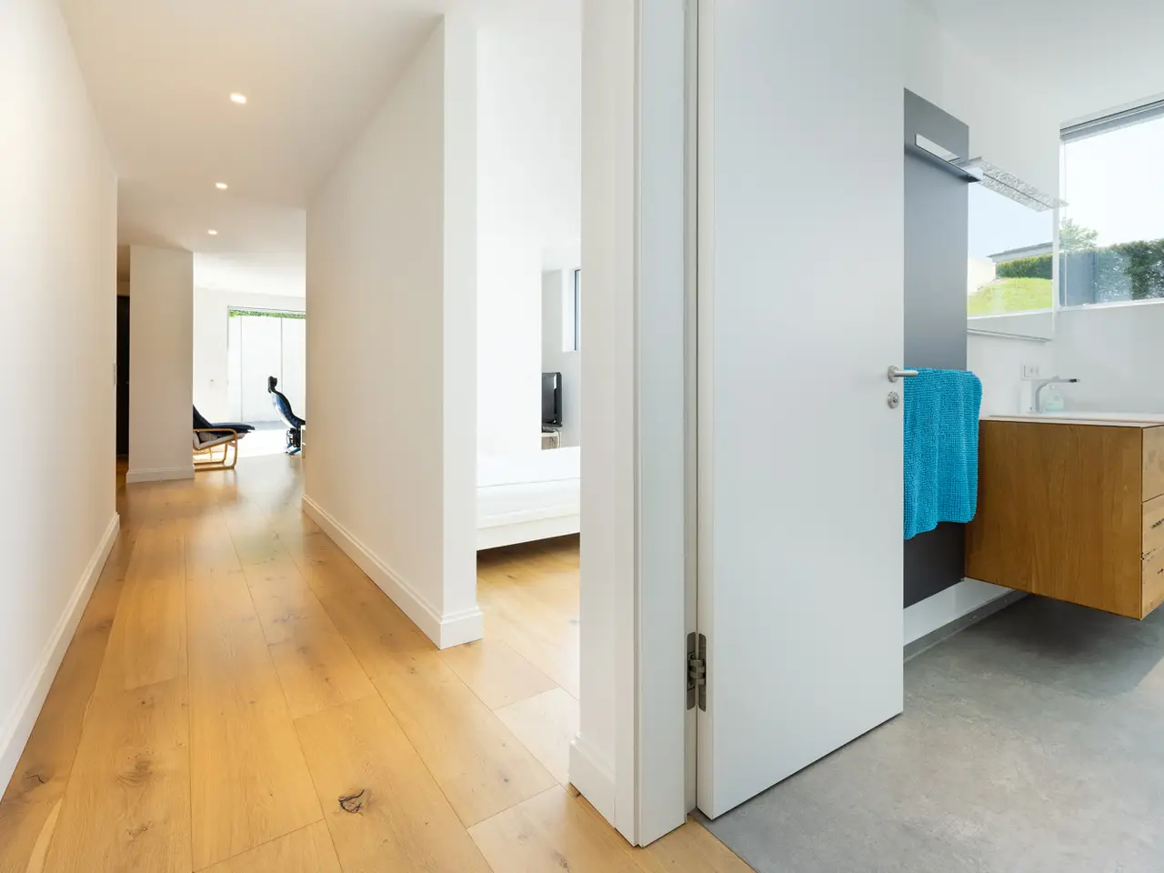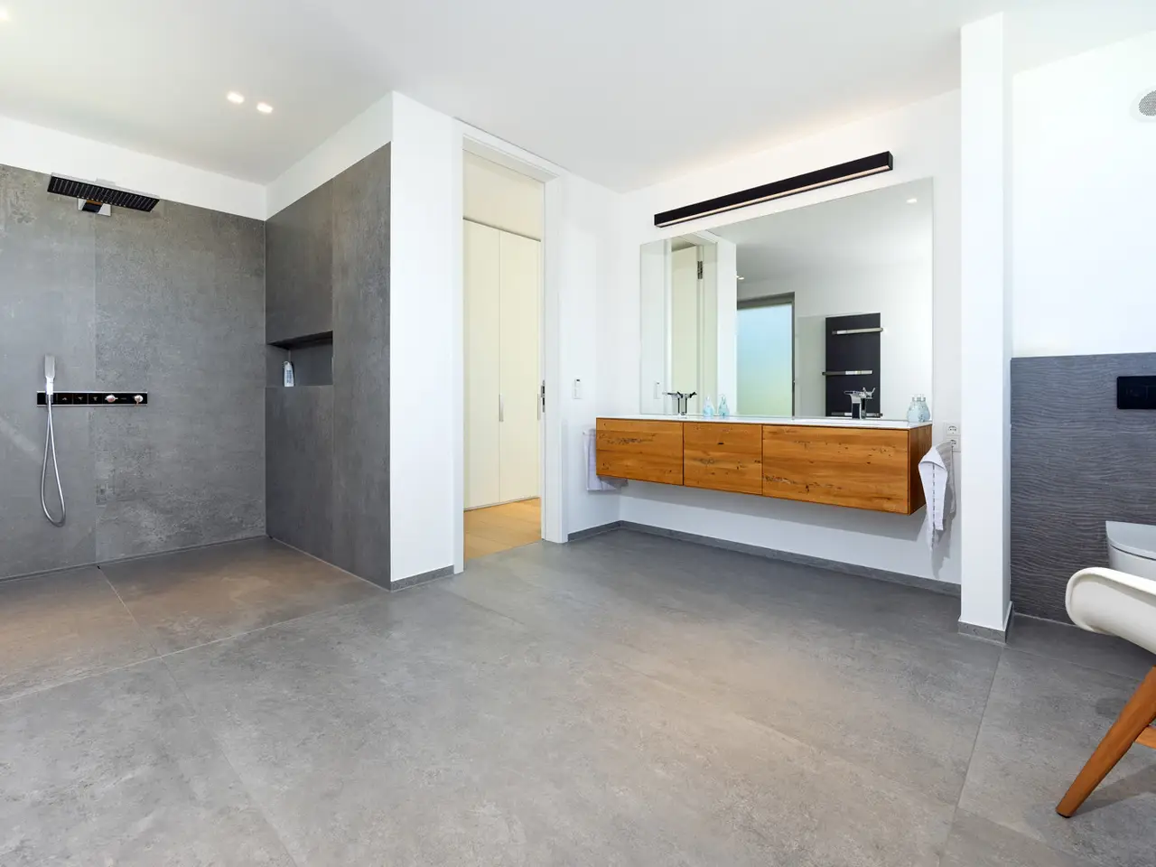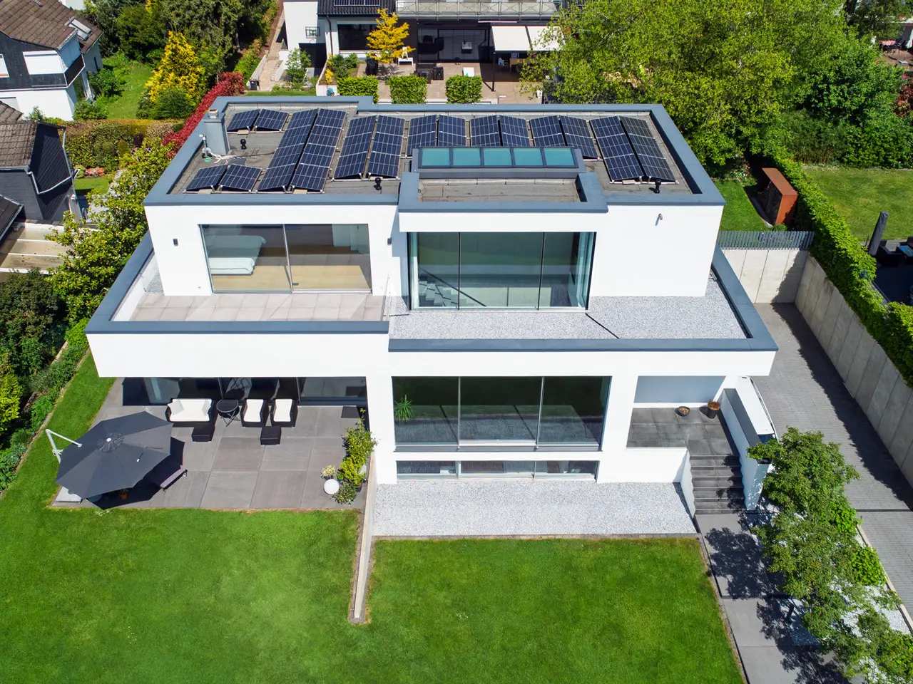 This modern villa, including a large granny apartment, completed in 2019, is situated on a plot of approx. 1,088 m² and offers a living space of around 380 m². This as-new property with its exceptional design and high-quality fixtures and fittings impresses with its generous room layout and technical refinements. The light-flooded first floor with a room height of 3.00 meters impresses with floor-to-ceiling Sky Frame windows, some equipped with electric drives and complemented by electric blinds in a Venetian blind design. Floor-to-ceiling sliding doors on the first floor and floor-to-ceiling doors on the upper floor ensure an extraordinary sense of space as well as perfect lines of sight and light. There are eight spacious rooms in the villa, including five bedrooms. The three stylishly furnished bathrooms offer maximum comfort and have been designed with extra-long and wide tiles. The living/dining area is divided by an elegant fireplace, which can be seen from three sides through glass surfaces, creating a pleasant atmosphere. High-quality oak floorboards, five meters long and extra wide, underline the elegant ambience of the house. The modern Bulthaup kitchen is equipped with high-quality appliances and offers plenty of space for culinary development. Another gastronomic highlight is the in-house wine cellar. The villa's climate-friendly energy concept is supported by a geothermal heat pump, a photovoltaic system and underfloor heating. A central ventilation system ensures a pleasant indoor climate. The property also has a smart KNX bus system for convenient control of the building services. An outstanding feature of this villa is the heated underground garage with six parking spaces and three additional outdoor parking spaces. A separate apartment with two rooms, fitted kitchen and bathroom is available for guests or staff and can be accessed via a separate entrance. The property meets the highest standards of living quality and energy efficiency and is ideal for families or discerning individualists who value exclusive living. The residential location offers good connections and a quiet but central residential area. Please contact us for further information or to arrange a viewing appointment to see this unique residential offer for yourself.