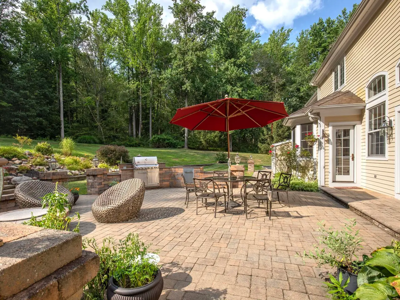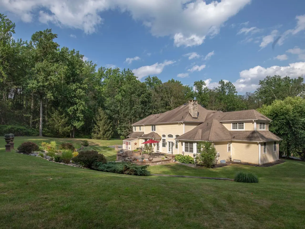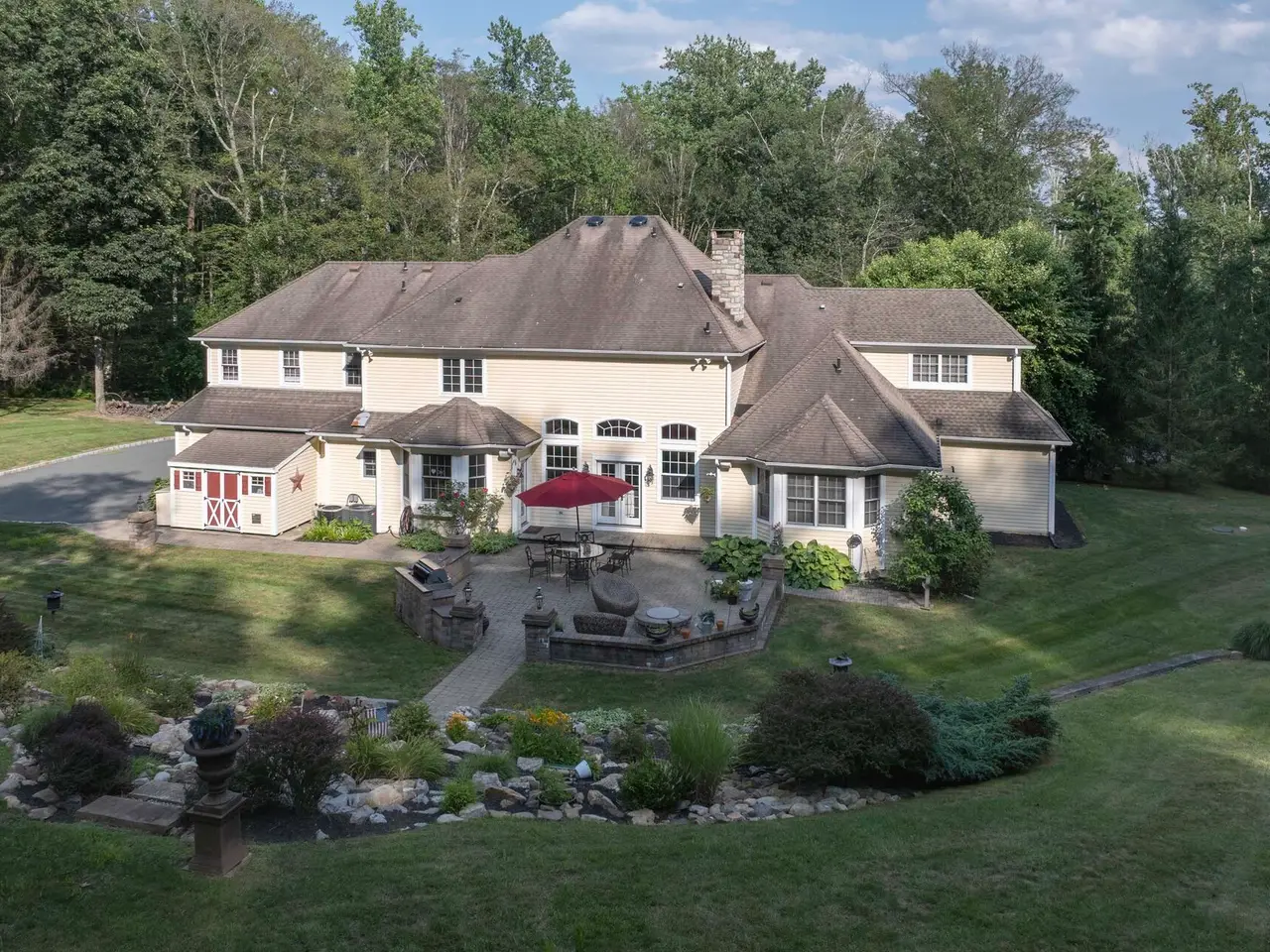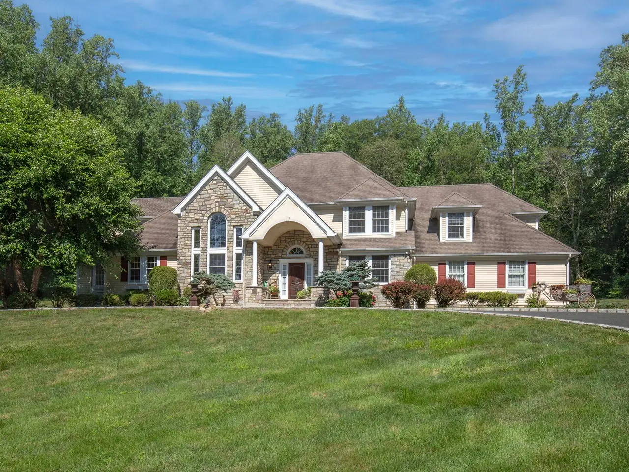 Elegant Custom Colonial in Harding Township Welcome to a stately custom Colonial nestled atop a gentle rise in sought-after Harding Township, known for its top-rated schools and close proximity to major commuting routes. With timeless architecture and a thoughtfully designed layout, this five-bedroom, four-and-a-half-bath residence combines luxury and functionality. A sophisticated interior designed with soaring ceilings and exquisite millwork lend character to every room. The elegant formal entrance foyer reveals sightlines into stylish living and dining rooms. At the heart of the home is a gourmet eat-in kitchen outfitted with premium appliances, custom cabinetry, an expansive pantry and a generous island. Opening from the kitchen is a two-story family room where the focal point is a floor-to-ceiling stone fireplace flanked by custom cabinetry. A convenient service bar with sink and beverage refrigerator is an added convenience. Walls of windows and French doors connect both the kitchen and family room to an entertainment-friendly patio and park-like yard. Another highlight is a spacious first-floor primary suite featuring a spa-like bath with radiant heat floors for ultimate comfort. Upstairs, four oversized bedrooms include two en-suite layouts and two bedrooms sharing a hall bath. The lower level provides even more gathering areas with a bar, media and recreation spaces as well as ample storage options. Step outside to beautifully landscaped gardens and a walled paver patio, where the built-in grill and custom fire pit create a perfect backdrop for al-fresco dining and warm weather enjoyment. This colonial is a rare offering in a highly desirable Morris County community, combining refined living spaces and everyday ease. Don't miss the opportunity to make it yours.
