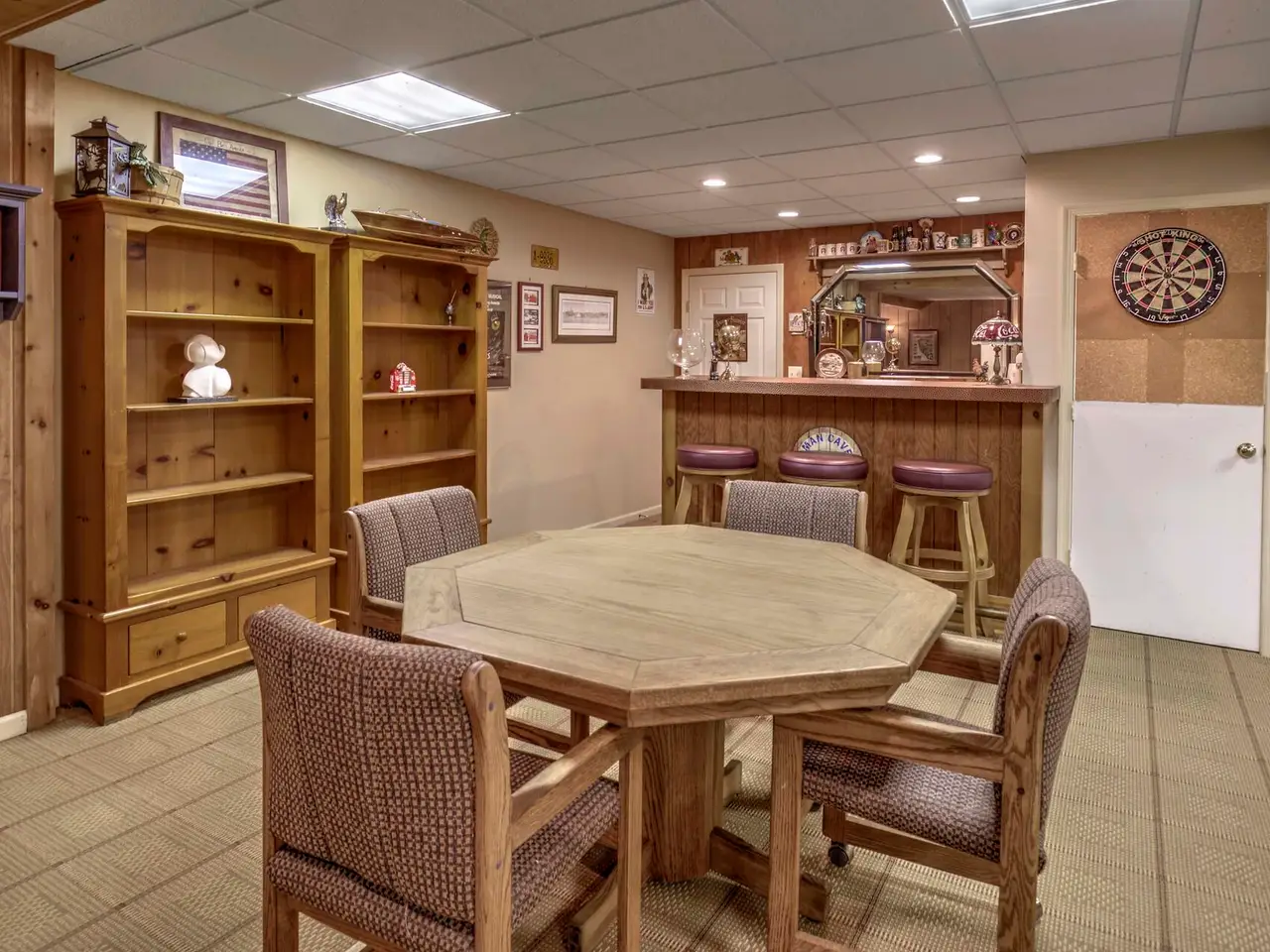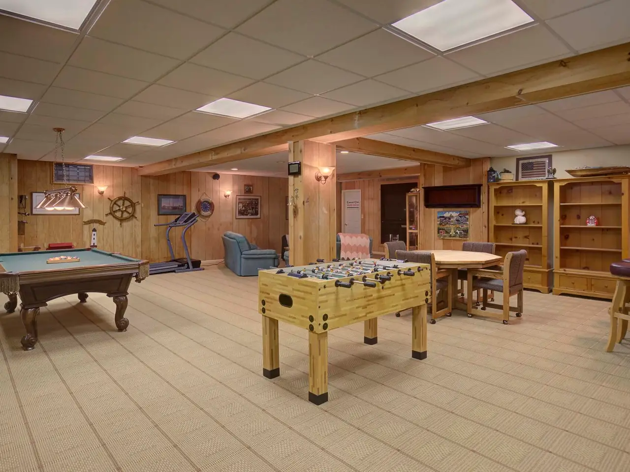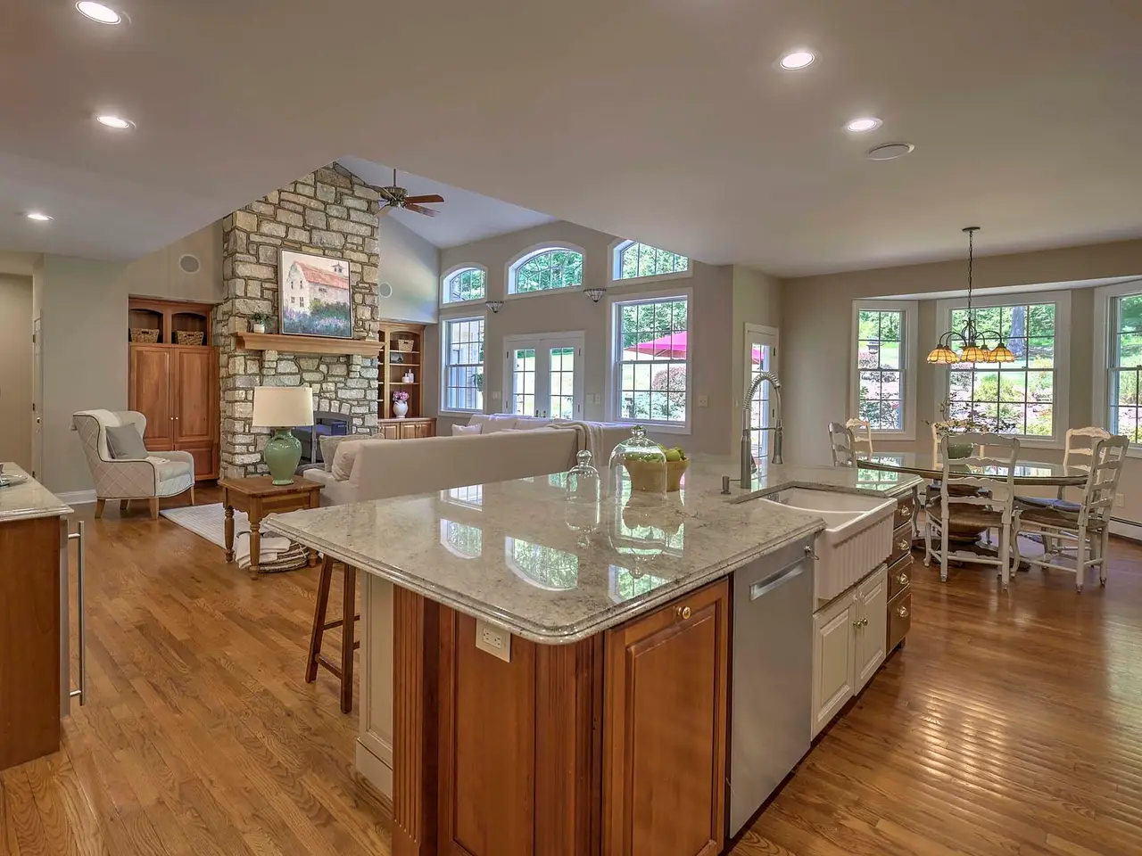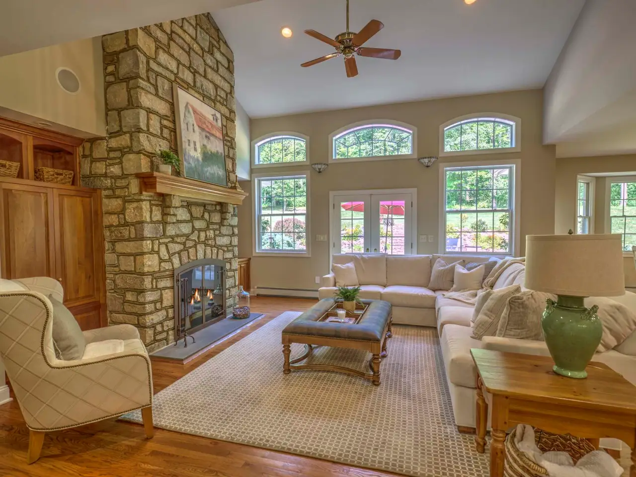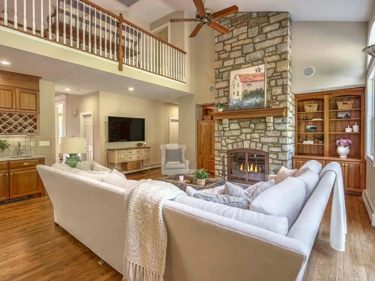 • Floor-to-ceiling stone fireplace and custom built-ins