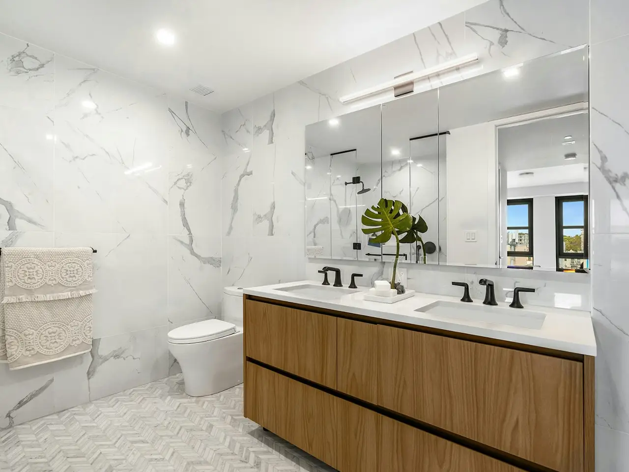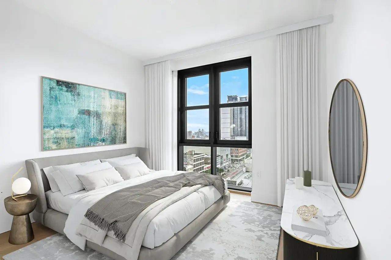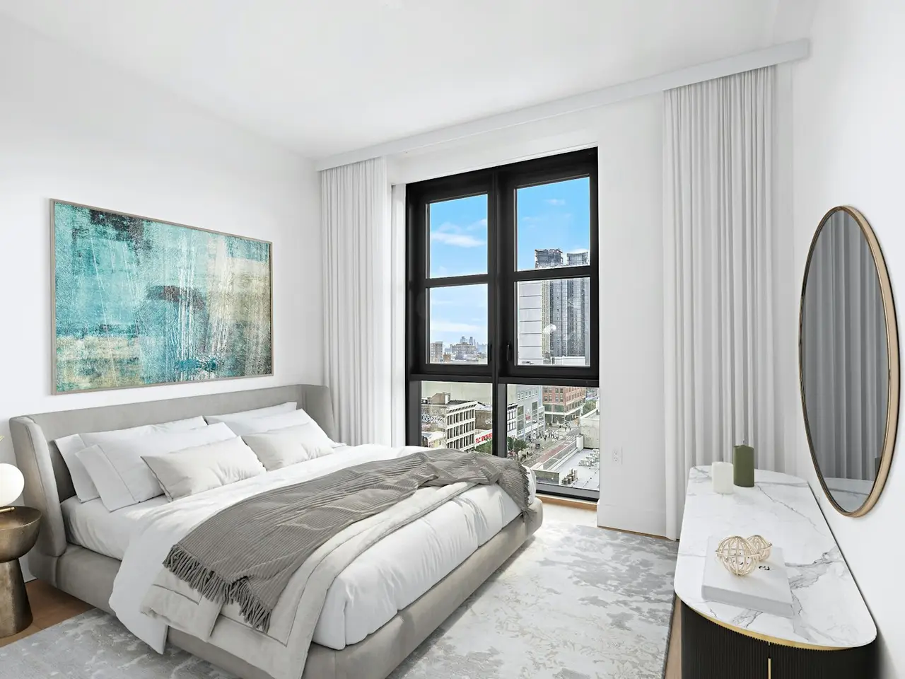 Final Two Homes Remain - Immediate Closings This immaculate south/east facing 7th floor two bedroom two bath boasts an expansive 15 x 22 living room space with giant floor to ceiling windows which allow for maximum light. The luxurious 16 x 10 open chefs kitchen is for kitchen lovers with tons of storage with a large south facing window which bring in the rays of sun and views of midtown and beyond. It is a one of a kind apt that has massive scale rooms to live in and create the space you dream of. There is no limiting spaces here. A smart design for a home. Every surface and fitting at Eleven Hancock was selected for its refined design and matchless quality. Italian crafted kitchens by Cesar were expertly designed in complimentary tones with immaculate attention to detail. A state of the art Miele appliance suite concealed behind handsome millwork while durable Calacatta quartz lines the kitchen's countertop and backsplash. Bathrooms consist of clean, sleek design in a classic white and warm gray palette with feature matte black Kohler fixtures and accessories. The master bathroom includes a glorious rain showerhead, walls lined in large format Calacatta tile and natural stone floor in a herringbone pattern. Eleven Hancock sets the gleaming new standard for condominium living in Harlem. The eye-catching cantilevered design by Isaac and Stern Architects masterfully combines glass, steel and brick into an iconic structure highlighted by horizontal zinc and rust colored bands. Eleven Hancock provides over 6,000 sq. ft. of indoor and outdoor amenities unrivaled by any other address in Harlem. Residents enter into the 24/7 attended lobby via a private garden walkway located along Hancock Place. Additional amenities and conveniences include a high-tech fitness center featuring Peloton bikes, a sizeable children's playroom, rooftop lounge with BBQs, and an exquisitely appointed resident's lounge that connects to the 3,500 sq. ft. landscaped terrace. Eleven Hancock is located in the center of Harlem's vibrant music, arts and culinary scene, just one block from Morningside Park and a few blocks from the legendary Apollo Theater, Columbia University and the bourgeoning Factory District. Eleven Hancock is just three minutes from the 125th Street station where the A, C, B and D subway lines will get you to Midtown in just ten minutes. The complete offering terms are in an offering plan available from Sponsor. CD 18-0393 Sponsor: CVRE 125th Street, LLC, 174 Fifth Avenue, Suite 200, New York, NY 10010. Equal Housing Opportunity.
