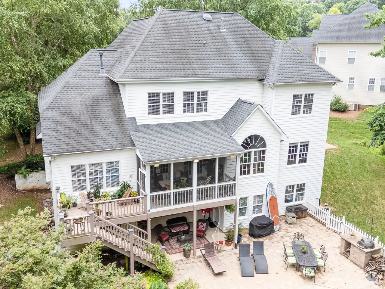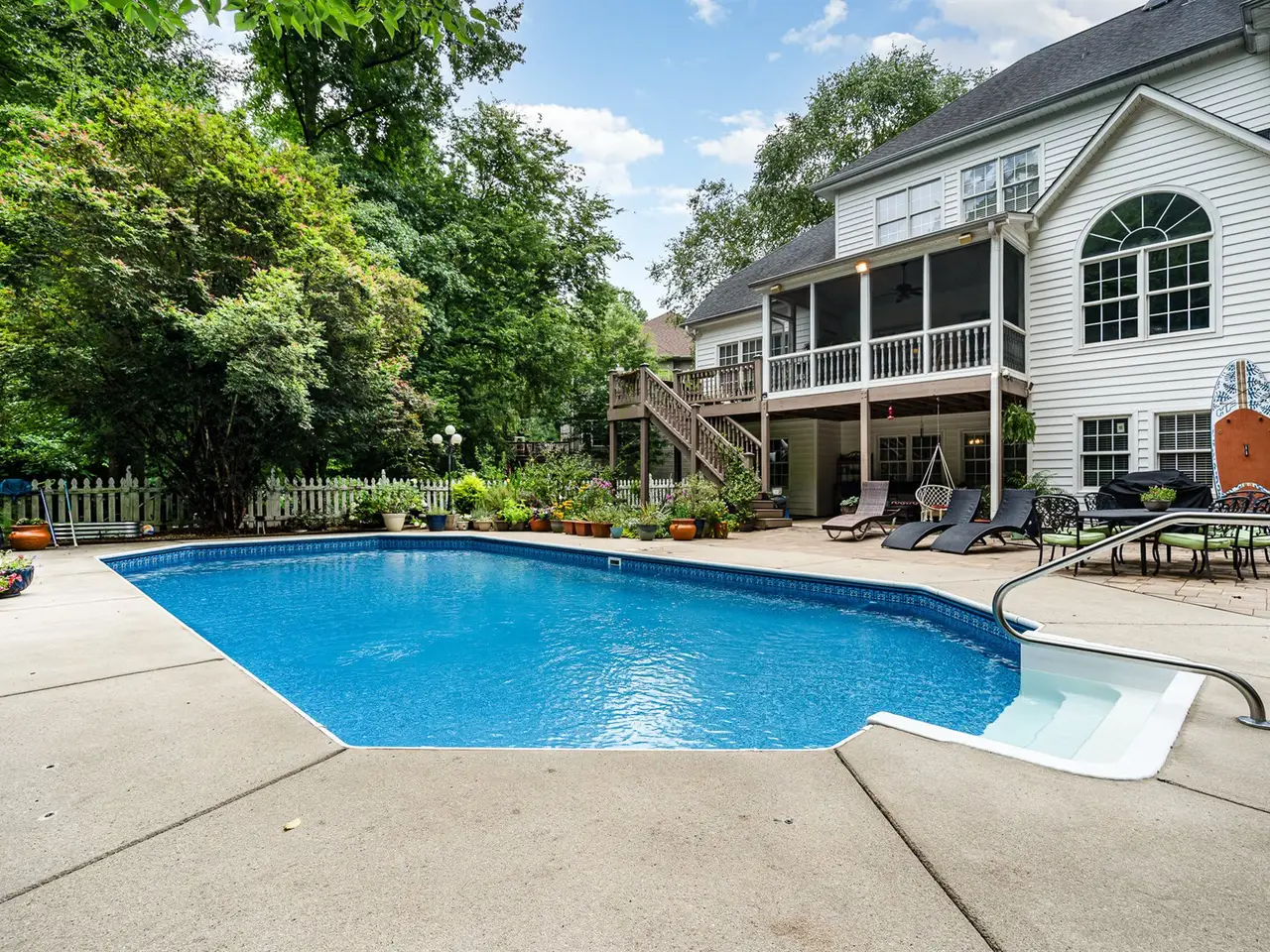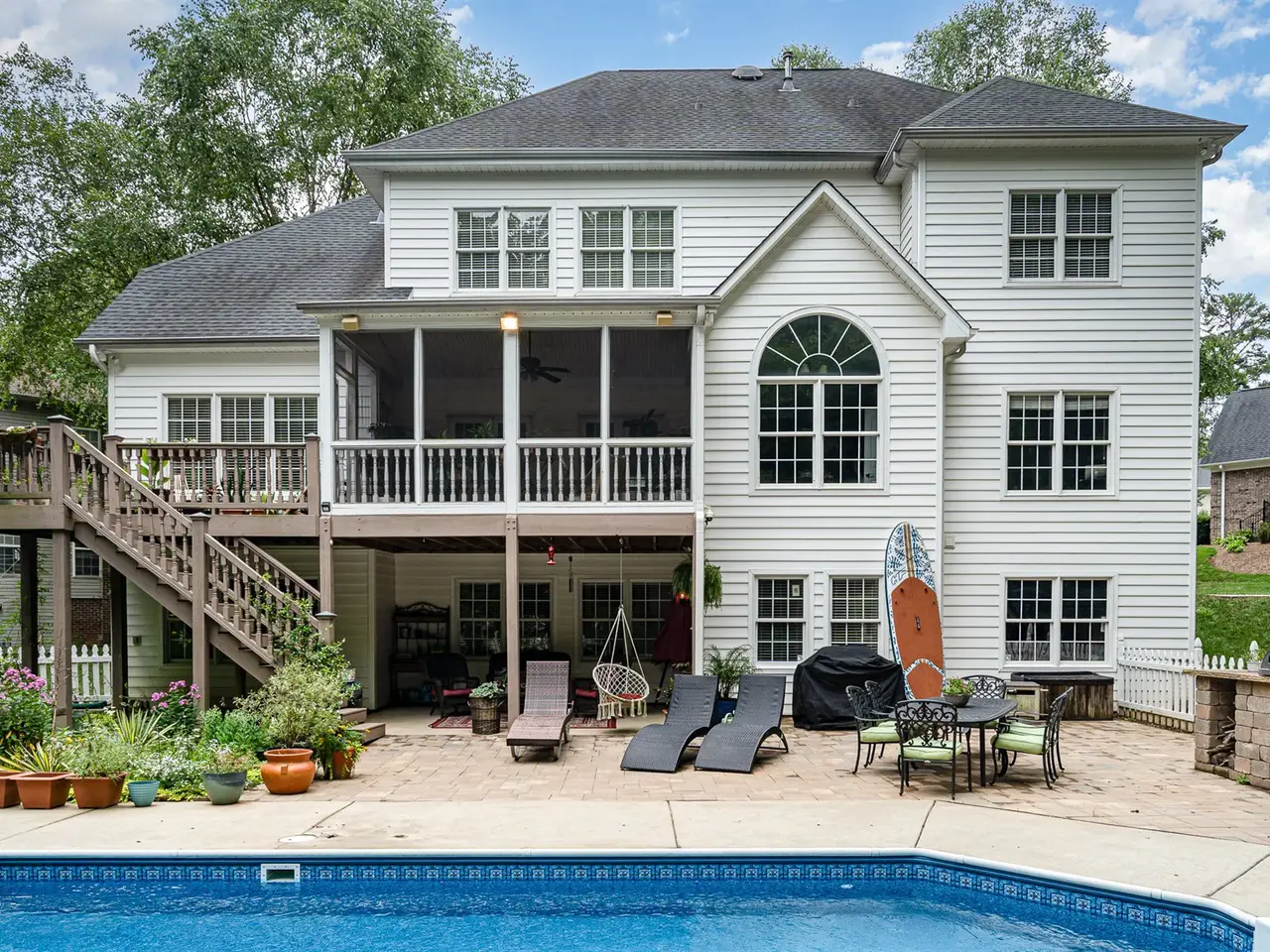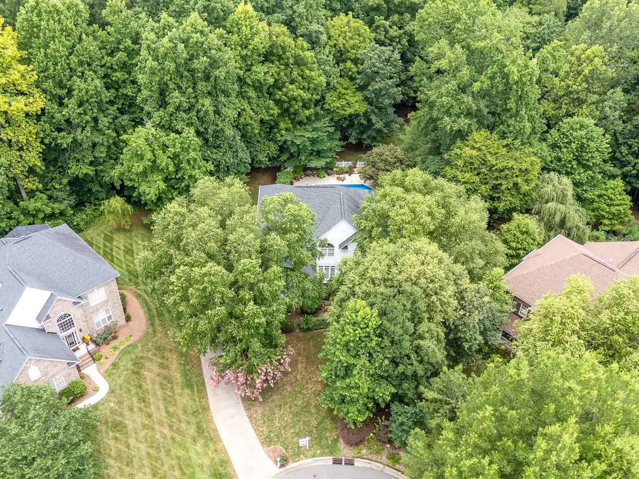 Beautiful Windsor Forest cul-de-sac basement home on a private, wooded .67-acre lot with in-ground pool (new liner) in Harrisburg. Main level offers a dining room, large great room, and a chef's kitchen with granite counters, island, tile backsplash, and stainless appliances. Primary suite and guest suite with full bath on main. Upstairs features 3 bedrooms plus a large bonus/optional 6th bedroom and updated dual vanity Jack-and-Jill bath. The full basement is ideal for entertaining with rec space, **2nd kitchen, full bath, workshop, and storage. Enjoy the screened porch overlooking the treed yard and pool. Crown molding throughout main living areas. Convenient to shops, restaurants, and highways while maintaining privacy. This spacious, well-appointed home offers flexibility for multigenerational living, work-from-home needs, and entertaining inside and out. Upstairs HVAC 2020, Downstairs 2021. Don't miss this exceptional Harrisburg home and schools!!
