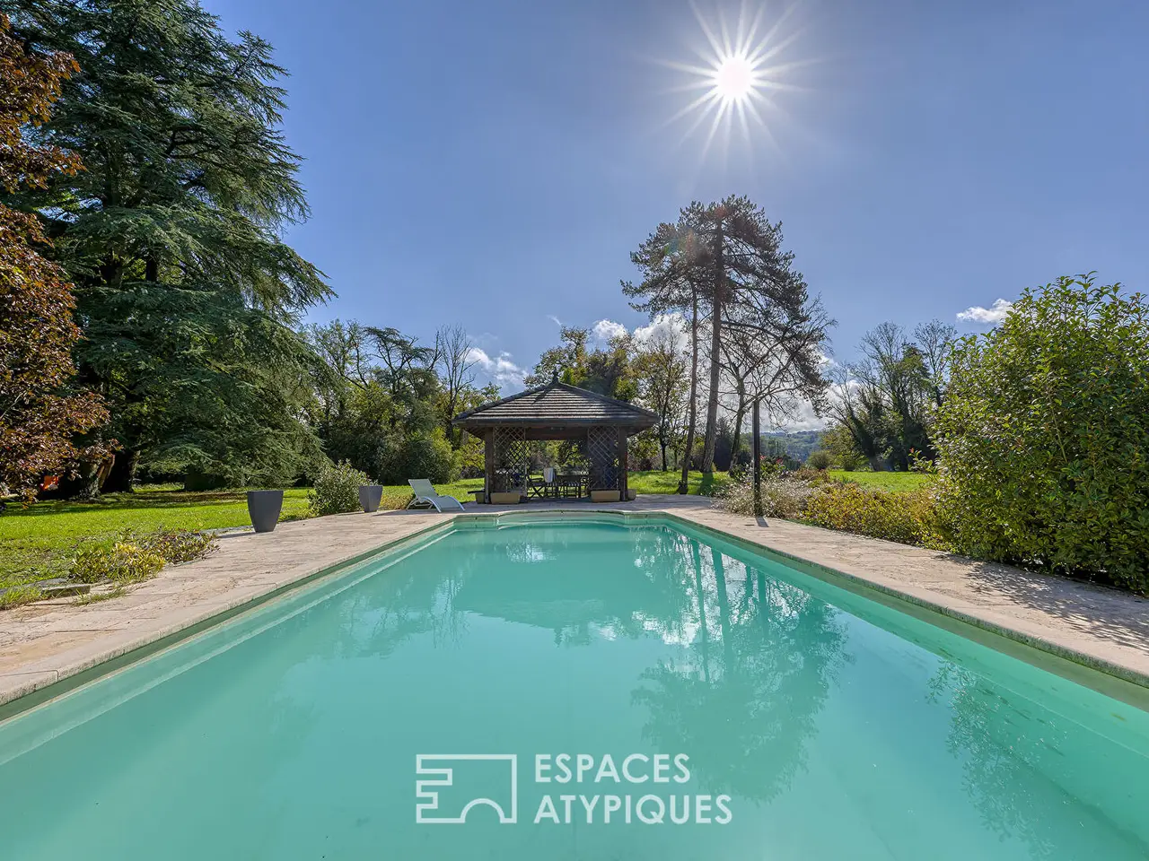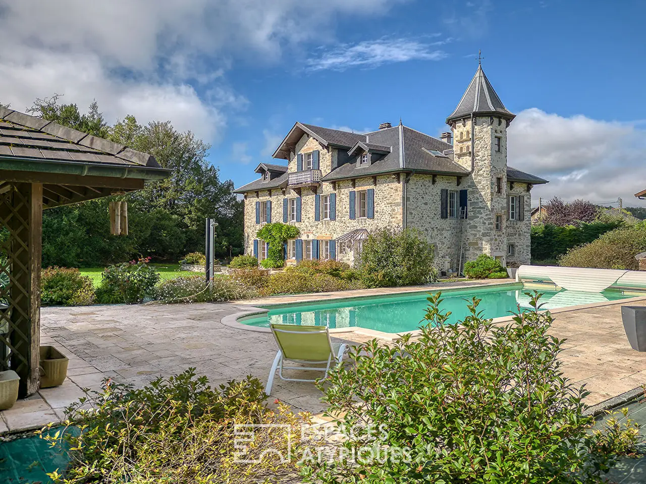 Nestled in a privileged environment in the commune of Hauteville-sur-Fier, just 20 minutes from Annecy, this characterful 18th-century property seduces with its character, its generous volumes, and its vast wooded park of over 2.3 hectares.With a usable surface area of approximately 403 sqm (including 246 sqm of living space), this residence offers rare potential thanks to its convertible attic space of 157 sqm.From the entrance, the charm operates. The ground floor accommodates a vast hall leading to a bright living room of 28 sqm, an office, a beautiful and convivial dining room, as well as a separate kitchen.A boiler room completes this level.On the 1st floor, five spacious bedrooms share two bathrooms. On the 2nd floor, the convertible attic space offers beautiful development prospects. The exteriors are not lacking in charm.Outside, the wooded park offers various living and relaxation areas: shaded terraces, a swimming pool with a pergola, a large courtyard, as well as a carport for two cars and a garden shed.Lovers of unique places will be seduced by this elegant property with great potential in a privileged living environment.Ideally located, the property is only 14 km from the Épagny shopping center, 18 km from Annecy and 50 km from Geneva International Airport.Property tax: EUR2,176ENERGY CLASS: C / CLIMATE CLASS: CEstimated average annual energy expenditure for standard use: between EUR2,952 and EUR3,994.Information on the risks to which this property is exposed is available on the Georisques website for the areas concerned: www.georisques.gouv.fr.REF. 2020EAAdditional information* 8 rooms* 5 bedrooms* 1 bathroom* 1 bathroom* Outdoor space : 23540 SQM* Property tax : 2 176 €Energy Performance CertificatePrimary energy consumptionc : 157 kWh/m2.yearHigh performance housing*A*B*157kWh/m2.year21*kg CO2/m2.yearC*D*E*F*GExtremely poor housing performance* Of which greenhouse gas emissionsc : 21 kg CO2/m2.yearLow CO2 emissions*A*B*21kg CO2/m2.yearC*D*E*F*GVery high CO2 emissionsEstimated average annual energy costs for standard use, indexed to specific years 2021, 2022, 2023 : between 2952 € and 3994 € Subscription IncludedAgency feesThe fees include VAT and are payable by the vendorMediatorMediation Franchise-Consommateurswww.mediation-franchise.com29 Boulevard de Courcelles 75008 ParisInformation on the risks to which this property is exposed is available on the Geohazards website : www.georisques.gouv.fr