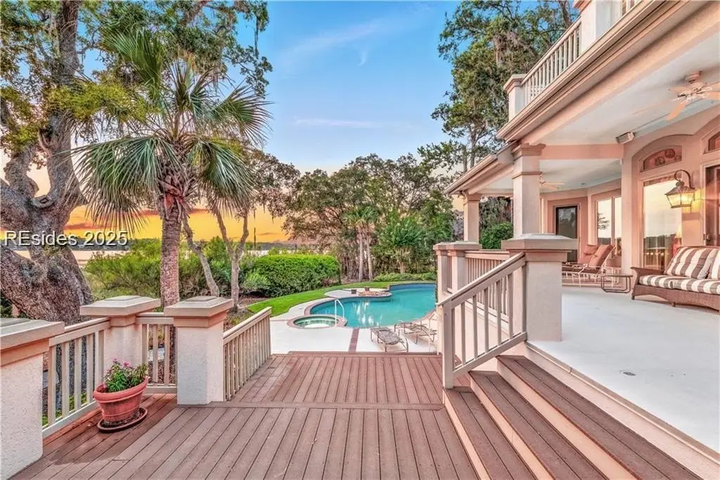 Discover timeless elegance in this exceptional Long Cove residence—first time on the market. Situated on one of the finest homesites in the community, this property overlooks Broad Creek, the marsh, and the 14th green of the Pete Dye Golf Course. The home features 5 spacious ensuite bedrooms, including a first-floor primary suite. Enjoy several living areas, a home office with detailed woodworking, and two upstairs bedrooms that open to a balcony & beautiful water view. Outdoor spaces shine with a screened porch, tiered decks, custom pool and amazing sunsets over the water. New roof (2023), 3-car garage, and just a short walk to the marina!