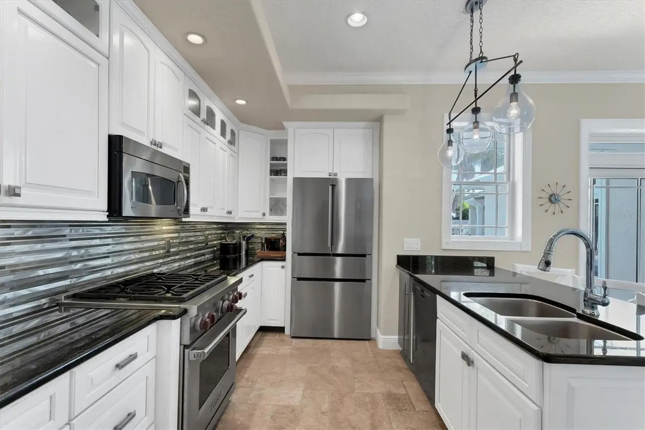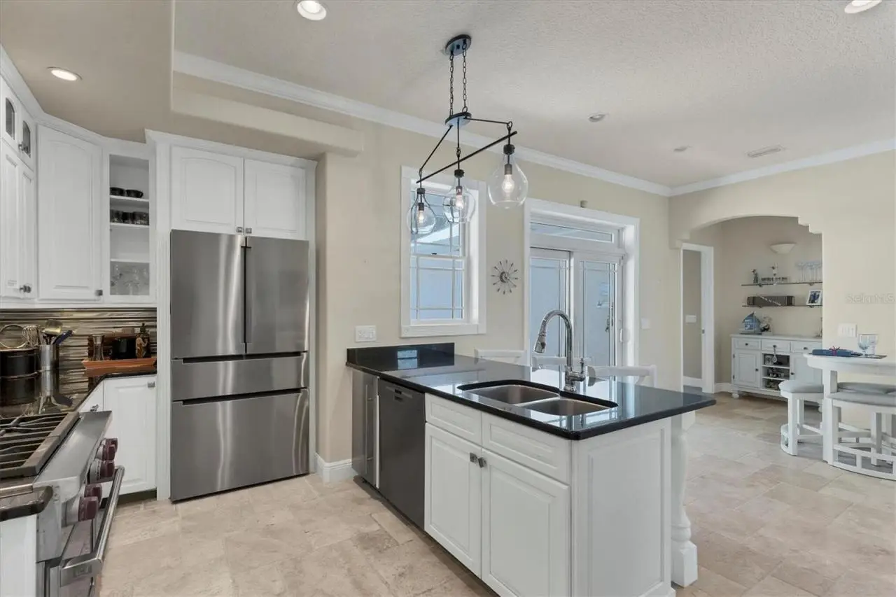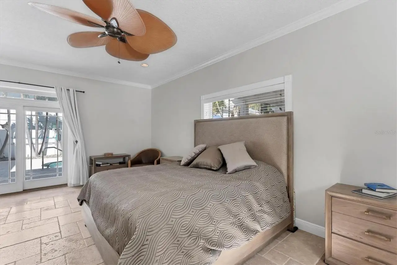 Location, location, location! This beautiful custom home in West Wind Shores is just across the street from the beach and minutes from Anna Maria Island. With an oasis-like backyard and swimming pool, this property offers the ultimate coastal lifestyle. Custom features abound, including high ceilings, arched entryways, travertine flooring, plantation shutters, 5-inch baseboards, recessed lighting, and large walk-in closets. As you enter through the front French doors, you're greeted by a cozy main living area complete with a gas fireplace. To the right, a versatile bonus space awaits, ideal for a dining area or hobby room. The thoughtfully designed split floor plan flows seamlessly, offering two primary bedrooms-one on each floor. The kitchen is a chef's delight, featuring granite countertops, custom cabinetry, newer Bosch appliances, including a Wolf gas stovetop with electric Wolf oven (rare on the island), a breakfast bar with pendant lighting, a glass-tiled backsplash, a wine refrigerator, and elegant travertine flooring. The downstairs primary suite overlooks the pool and offers ample space and luxurious details, including an oversized marble-tiled shower with a glass enclosure, dual sinks, extra storage, and a makeup/dressing table. Upstairs, the second primary suite boasts a large walk-in closet, an ensuite bath, and double doors leading to a loft area with large, picturesque windows that invite you to relax with a book in the afternoon light. The third bedroom is currently being used as an office, complete with built-in bookshelves and a Murphy bed for added flexibility. Sliding glass doors lead to a backyard oasis featuring palm trees, a pergola, a partially covered paver patio, and a completely fenced-in yard. The heated pool and outdoor kitchen, complete with a gas fireplace, create the perfect setting for entertaining. The space is wired for cable, allowing you to enjoy your favorite games while lounging or barbecuing. For pet lovers, there is a separate fenced area and a convenient storage shed. This custom home combines luxury, comfort, and an unbeatable location near the beach and Anna Maria Island. Convenient and complimentary trolley across the street. Walk across the street for sunset every night on the other side of a tall building complex. Don't miss your chance to own this coastal retreat
