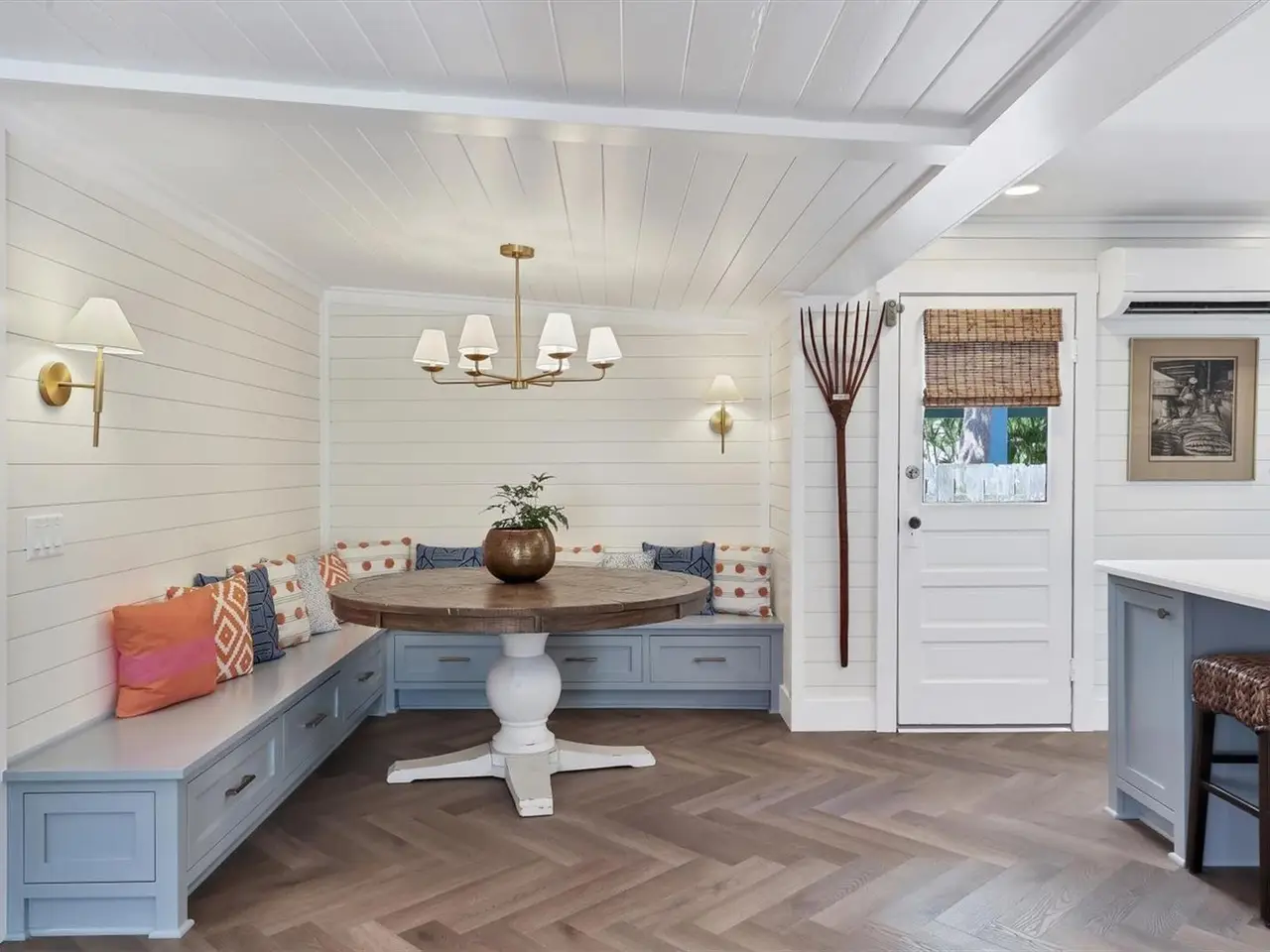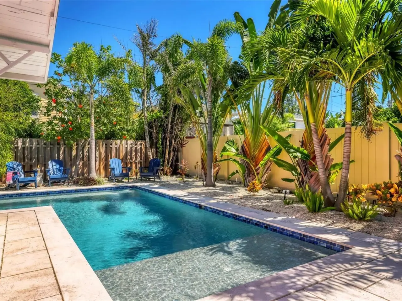 Step onto the spacious screened front porch, now featuring Timber Tech by Azek Porch Collection decking, framed by original Pecky Cypress siding, and enjoy the timeless charm of this lovingly restored 1940s 2 bed / 2 bath craftsman beach cottage just steps from the Gulf. This home blends Old Florida character with today’s comfort. Inside, new shiplap walls pair with Daltile’s Asher Bend luxury vinyl flooring in a herringbone pattern over a brand-new subfloor. This waterproof, scratch resistant surface combines the warmth of wood with the resilient vinyl, perfect for beachside living. The open kitchen boasts custom floor-to-ceiling cabinetry handcrafted in Pennsylvania, a built-in breakfast nook with matching benches, a Café Series appliance package in matte white, brushed bronze hardware, and Carrara. Emporio acrylic solid surface countertops for beauty and practicality. Both bathrooms feature spa-inspired tilework, one with a custom glass shower enclosure. The primary suite opens directly to the pool, while the guest bedroom provides its own private layout. A newly designed laundry suite adds everyday convenience with an Electrolux washer and dryer plus a high built-in countertop for organization. Outdoors, enjoy a fenced backyard oasis with an Agnelli-installed, custom-designed saltwater pool completed in 2022, surrounded by palm-lined landscaping for a private retreat. Behind the scenes are new plumbing and light fixtures throughout, spray foam insulation under the floors, new batt insulation in the walls, and carefully sourced finishes, all completed in 2025. With proven rental income managed by the owner and even stronger potential under professional management, the Pink Palm is an iconic island cottage reimagined for today.
