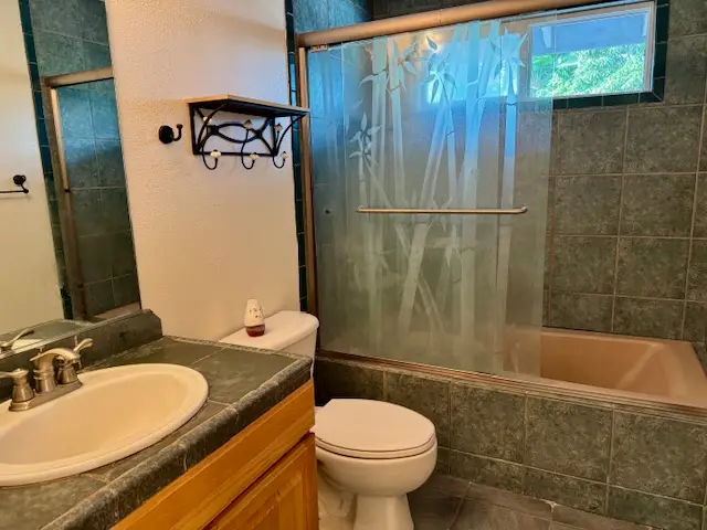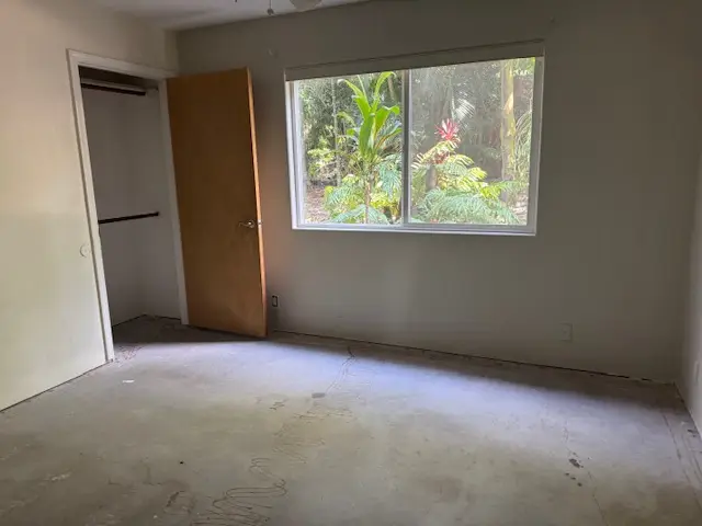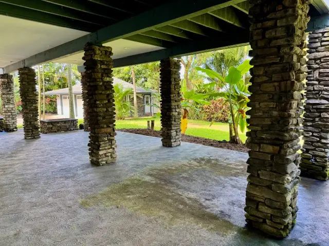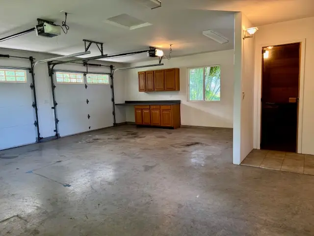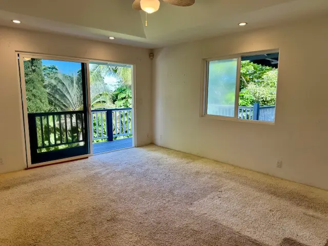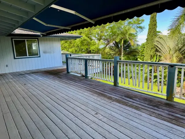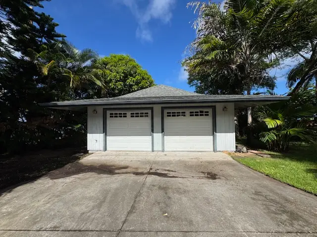 Separate area downstairs with door for privacy. Large lanai and deck areas. Upstairs kitchen and living room with an open layout. Detached two car garage, attached one car garage, and carport! Lots of room for parking. Easy to park and turn around.Ocean views from upstairs.So much potential!Located on a private flag lot.