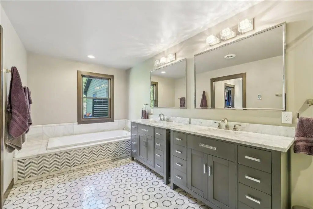 - Main level ensuite with double sinks, soaking tub, tiled shower
