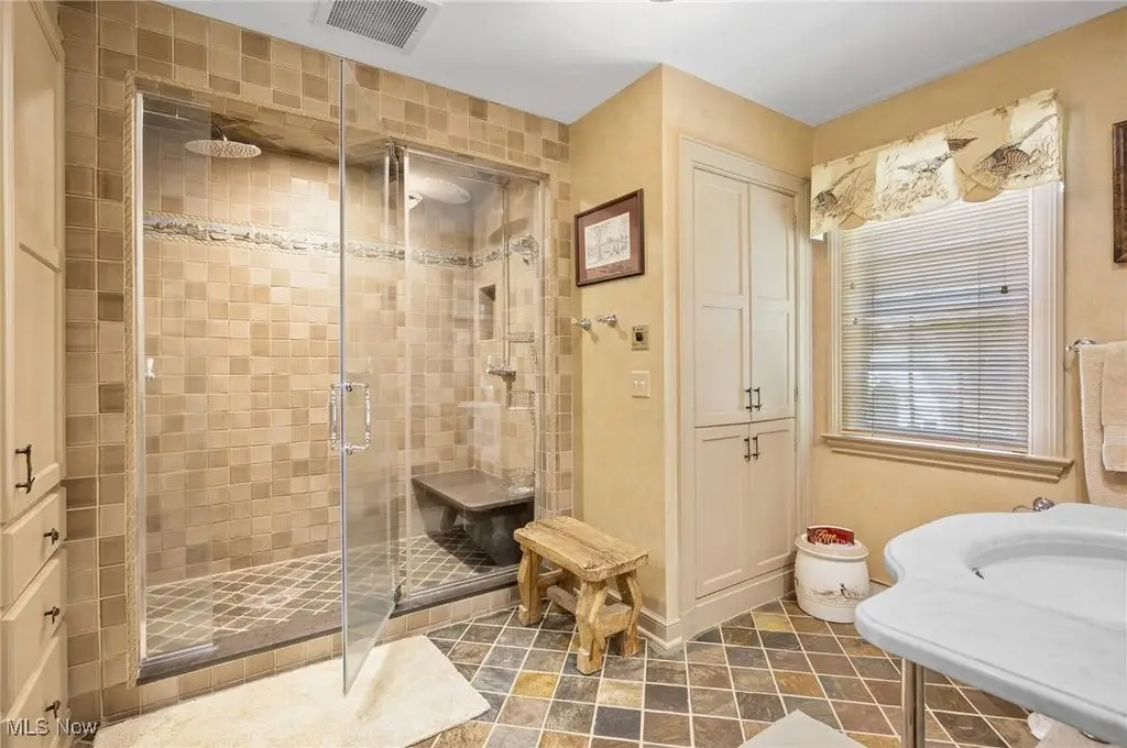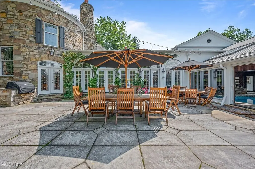 Set on 24 scenic acres of sweeping lawns & woodlands with 3 stocked fishponds, this magnificent English country estate, reimagined by renowned Cleveland architect Anthony Paskevich, offers an unparalleled living experience. A long, illuminated drive winds past original farmhouse & barn complex, leading through a tree-lined allee flanked by stunning gardens to the impressive main residence. A turreted entrance welcomes guests. The stone & clapboard exterior gives way to magnificent millwork, vaulted ceilings, arched doorways, oversized windows, and carefully selected stone & wood flooring. Designed for everyday living and grand entertaining, the generously sized gathering areas incl. a great room, formal dining room, family room, and solarium, all with fireplaces. A tranquil haven, the primary bedroom suite has dual baths and 4 additional suites incl. private baths. Enclosed by walls of glass, a spectacular pool pavilion opens to a stone patio overlooking breathtaking scenery and the exercise room, incl. sauna and steam room, epitomizes luxury & relaxation with a view. Approached by a brick courtyard, the custom-built, 1-bedroom guesthouse has an expansive brick terrace with geothermal heat, a fireplace and outdoor kitchen & pizza oven. With the richness & warmth of stone, brick, and wood, the bar room on the walk-out lower level exudes the charm of a traditional Scottish pub. The 2-car garage has an additional 1-bedroom, 1-bath guest suite on its upper level. Original farmhouse and one-room schoolhouse, moved to the property in the 1930s, are fully updated with modern amenities. The farmhouse has 3 bedrooms, 1.5 baths, wraparound porch, A/C and whole-house generator. The estate also has a fully restored, authentic barn complex - 4 frame buildings connected by a covered walkway: barn with 4 stalls & hayloft, greenhouse/studio, and detached 2-car and 4-car garages. Open fenced pastures with loafing sheds have ample space for horses, alpacas, or sheep to graze freely.