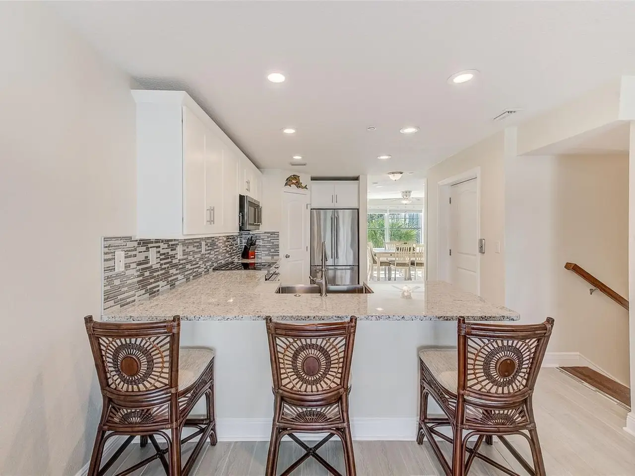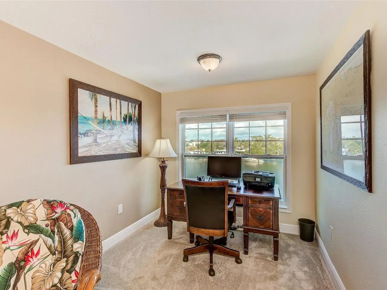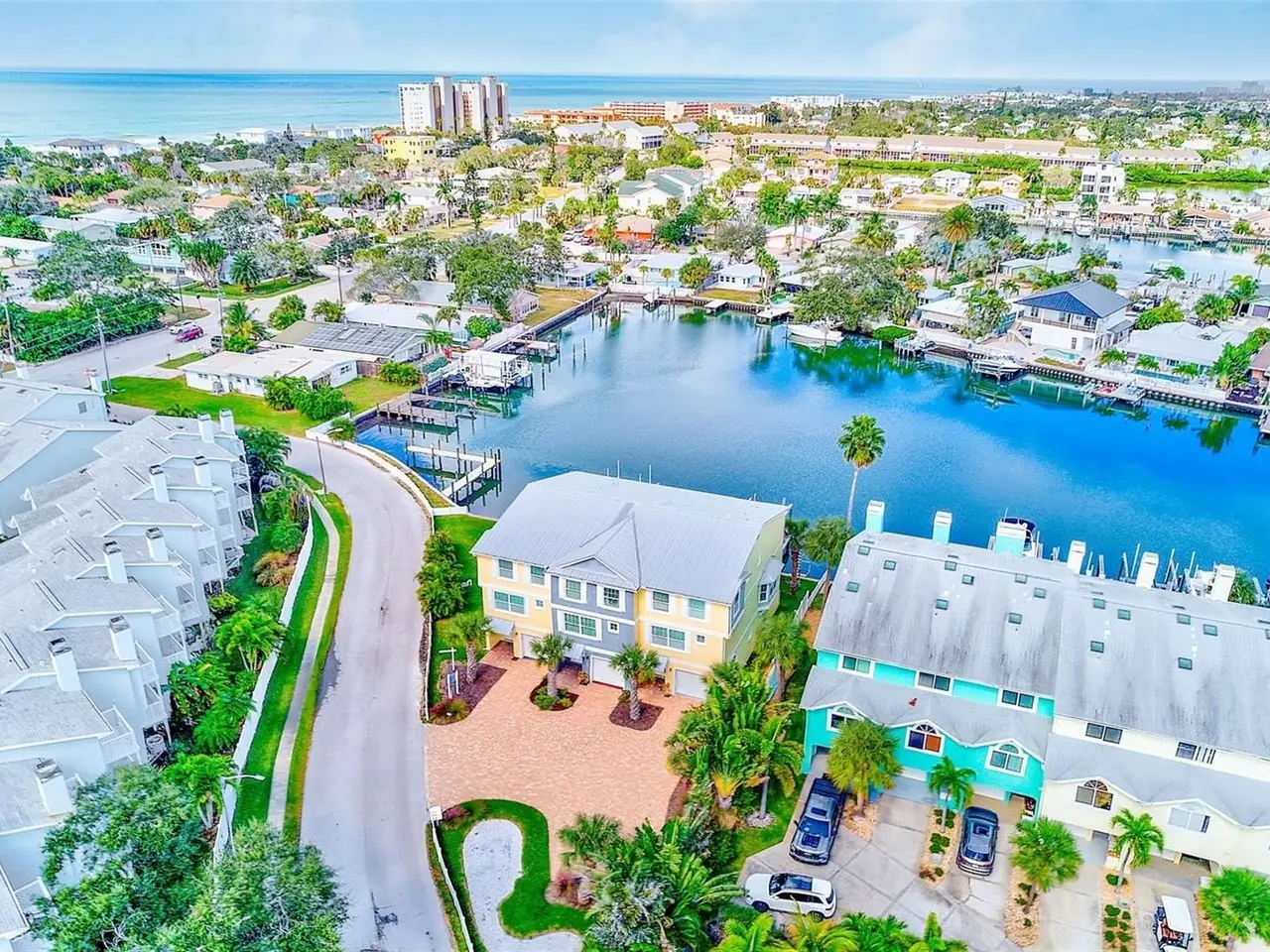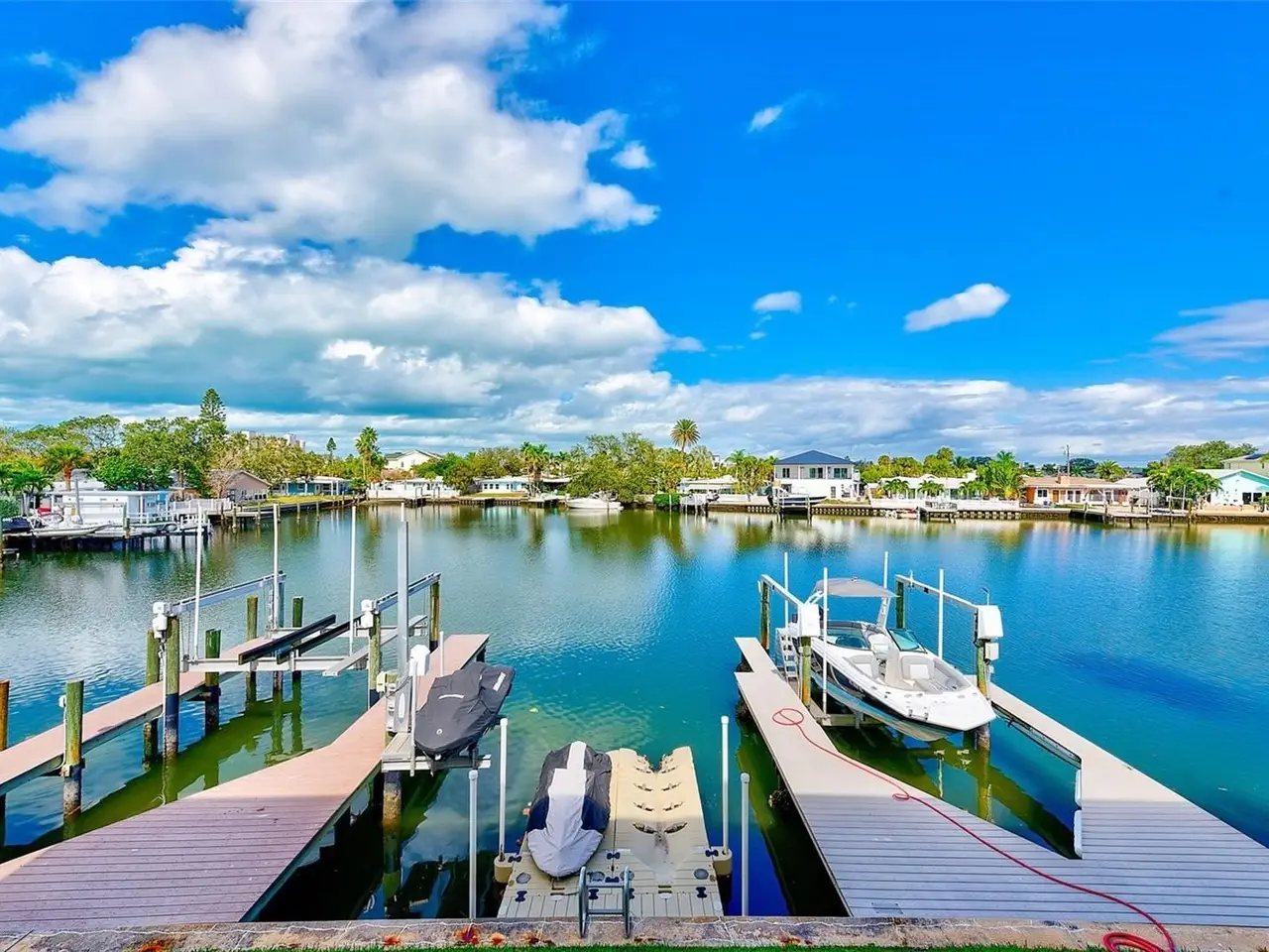 Stunning waterfront townhome just steps from the beach! Built in 2017 using all reinforced block construction. It is a boutique 3 unit condo association that is self managed. This building is also exempt under florida condo law from the mandate to have an SIRS ( structural integrity reserve study) done. This elegant three-story residence offers the best of coastal luxury, durability and easy maintenance. Enjoy effortless living with a private residential elevator that services all levels. All hurricane rated windows and slider. Nestled on a wide, deep sailboat canal, this home provides direct access to open water and embodies the Florida boating lifestyle. This location is 2-3 minutes to the intercoastal waterways by boat . The townhouse includes a deeded double-wide boat dock (30 AMP electric service and water connected) with a 16,000 lbs boat lift, a Jet ski swinger lift as well as a 2 spot floating jet ski dock. For security, there are ring cameras: one on the front door and one monitoring the backyard and the boat slip. Two Sea-Doo™ jet ski's are available for sale, as a separate purchase. Beautifully furnished with solid Tommy Bahama and other high-end pieces and is offered fully finished and move-in ready. Second floor, all neutral, large ceramic tiles and an open floor plan. A beautiful kitchen with granite countertops, Huge stainless steel farm sink, stainless steel KitchenAid™ appliances and a walk-in pantry. Large living room overlooking the water through a large balcony. This floor also has a large room that can be used as a formal dining, office or a fourth bedroom with a half a bath, with granite countertop, a solid wood vanity and a huge wall closet. This home is ideal as a full time residence or a comfortable, inviting beach retreat. Third floor has the primary bedroom with the primary bathroom ( on suite) with granite dual sinks, a stone floored large shower with a shelf and a shower seat. A frameless glass shower door makes this bathroom most elegant. Two guest bedrooms, beautifully furnished and each has a large wall closet, share a bathroom with a tub, floor to ceiling tiles and a built in shelf. The residential elevator is a huge convenience getting your groceries and items from your car to upstairs. Oak stairs from the beautiful entrance to the second floor. Lush carpet hugs your feet as you go to the third floor. Two car tandem garage with lots of room for storage and a workshop. Garage floors, just been all coated with a neutral light color epoxy coating. Just a few minutes walk to the sugar-sand beaches of Indian Rocks Beach, a walk to local shops and restaurants and 30 minute drive from 2 area airports. With this townhouse's location, build and condition you’ll enjoy the perfect blend of relaxed coastal charm and upscale comfort.