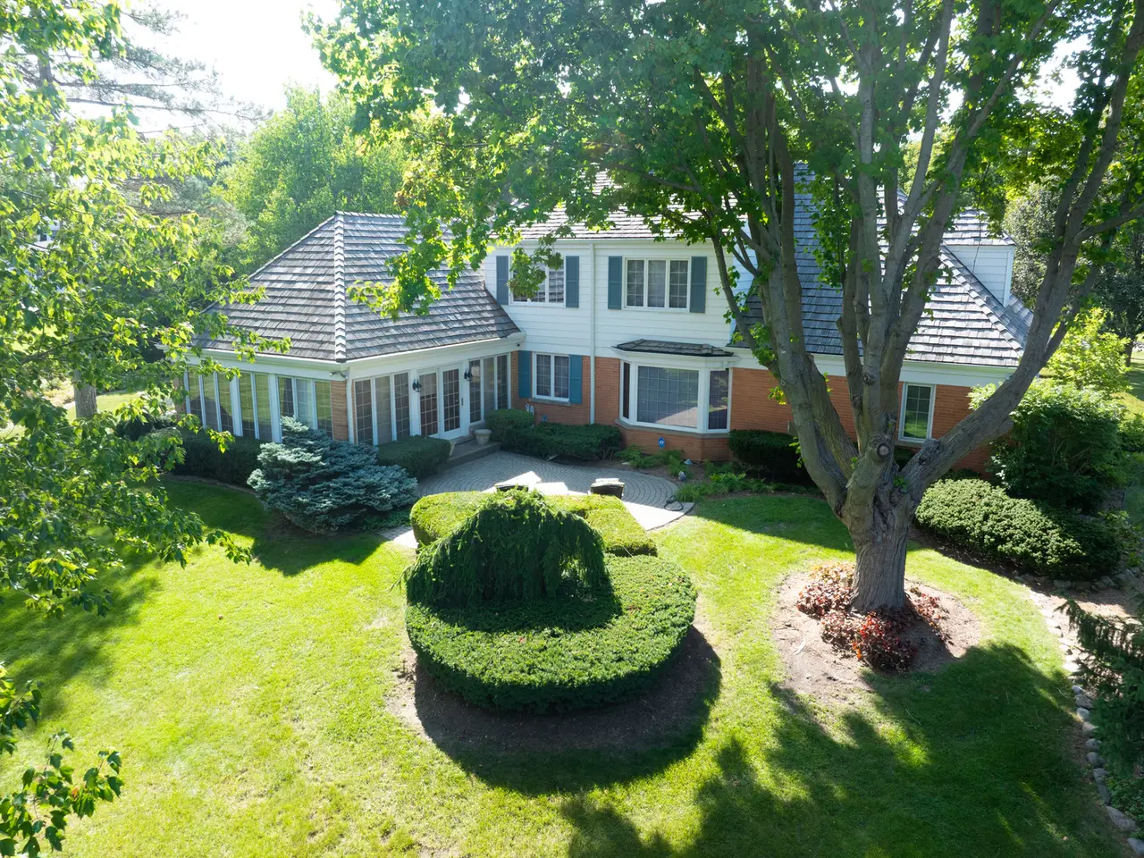 Location and Quality are the theme of this stunning French country style home! It was built in 1973 by Richard Kessler with a four season room addition by Robert Parker Coffin in 1983. The all brick home sits on a cul-de-sac in McIntosh of Inverness, on a most desirable lot of over 1 acre. The owners took pride in constructing and designing the home of their dreams and made sure that all of the crown moldings and baseboards had substantial size equal to the magnanimous style and size of the home. Enter into the marbled foyer and take in the beautiful views of the back yard through the formal living room. The first floor primary suite and study are to the left of the entry. The primary bathroom was recently remodeled by the acclaimed Abruzzo Kitchen and Bath company. A large walk in closet features built-in storage. The formal dining space is to the right of the entry. It has beautiful parquet floors, floor to ceiling windows and can seat 10 to 12 guests easily. The large kitchen has polished wood floors, updated stainless steel appliances, and a large eat in area with a beautiful window allowing natural light to flow through all day long. Adjacent to the kitchen is the laundry/mud room. The washer/dryer were purchased in 2024, and there are cabinets and two large closets for tons of storage. The cozy family room is perfect for entertaining with it's charming stone fireplace. A built-in wet bar with beverage refrigerator provides for a lively evening with friends and family. The shelves around the wet bar add character and a wonderful place to display your barware or books. As you walk up the beautiful, custom stairway you will find three large bedrooms with ample closets and extra large windows. There is one large bathroom and a walk-in attic. The four season room adds another WOW factor to this gorgeous home. Windows on all three sides bring the greenery of the outdoors inside. Both paver patios are accessed by sliding doors and each patio is professionally landscaped with mature trees providing privacy. The basement was recently upgraded and has a terrific recreation room with luxury vinyl flooring that can withstand any kind of play! There are cedar closets and plenty of storage in the back area of the basement. Amenities are as follows: 3 furnaces, 3 AC's and reverse osmosis water system. Hot water heater replaced in 2020 and the cedar shake roof was replaced in 2019. If LOCATION AND QUALITY are on your list, this home is for you!