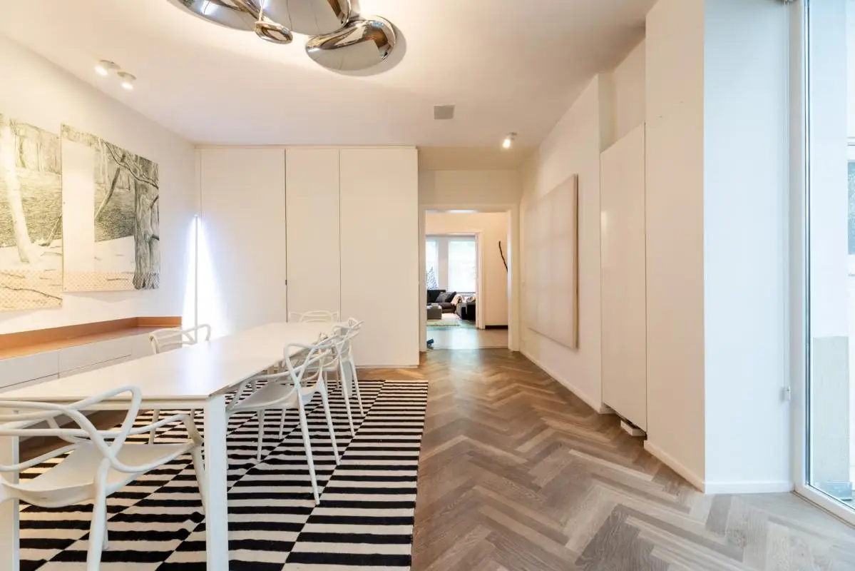 Facing the listed Abbaye de la Cambre site, this superb Art-Deco style flat of 233 m2 has been completely renovated with taste and character. Lovely reception rooms: large lounge with study area or TV room, fully-equipped kitchen and dining room opening onto a delightful patio, two en suite bedrooms including the master suite with dressing room and full bathroom. Lovely private garden. Adjoining, fully renovated 47 m² studio (PEB E-). Ample bespoke storage space, cellar and attractive parking space. PEB F