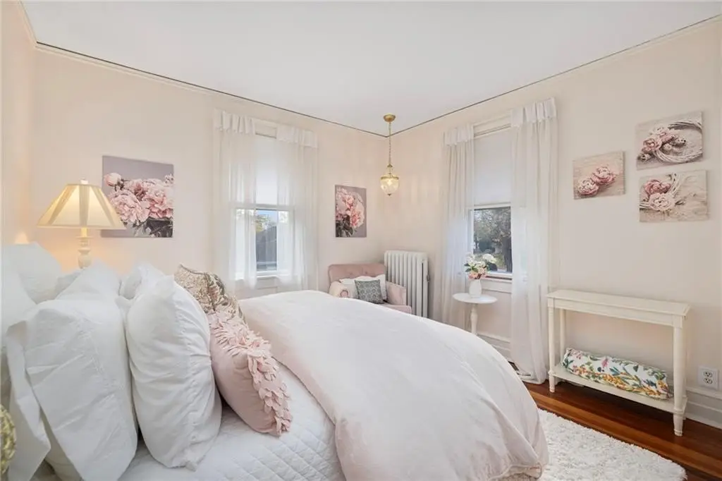 Historic Cottage in Shoreby Hill, with beautiful water views, all within a short distance of the marina, shops, dining, and more! This home is sited on a 21,000+ sq.ft. lot with an oversized detached garage with access from Standish Road. Step onto the welcoming front porch and enjoy sea breezes and boat watching, all with plenty of room to dine, dream, and relax. Once inside, the residence showcases classic architectural details. The generous living room offers warmth and character, featuring a large fireplace, built ins and numerous windows, perfect for entertaining. A small sitting room, kitchen, dining room, and half bath complete this level. Take the main wide staircase with beautiful stained glass up to the primary en suite. Two additional bedrooms and a bonus room all have water views. There is an additional bedroom, full bath, and second back staircase on this level. A third full bath with a smaller staircase leads to an unfinished attic space with potential for more expansion. Close to all Jamestown has to offer, including a short stroll to the seasonal ferry. This is a very special property in the center of beautiful Jamestown.