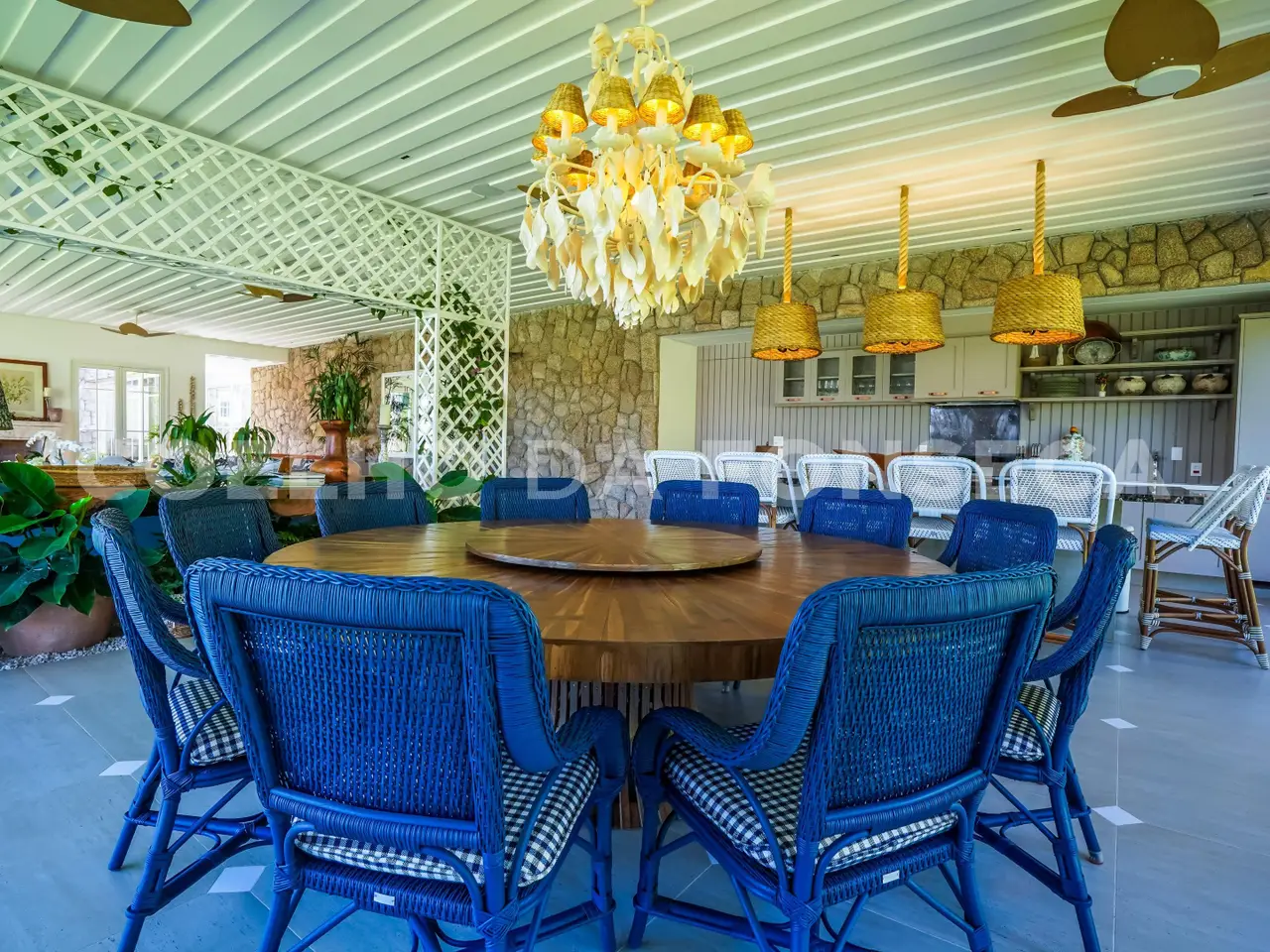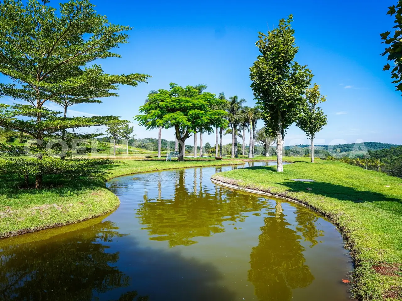 Where Nature Meets Sophistication. There are places that are not just homes, but settings for stories, unforgettable moments and a connection with what really matters. This house was born from this dream: a refuge amidst lush nature, where comfort, exclusivity and well-being come together. From the choice of the land - one of the most privileged in the condominium, elevated, with a long view and indescribable sunsets - to the smallest details of the landscaping and architecture, everything was thought out to provide a unique experience. More than 110 adult trees were carefully planted, creating a garden that blends in with the native forest, with a stream, waterfall and a lake that make the environment even more special. The grand 16x8 meter swimming pool, flanked by a raw travertine marble deck, becomes an invitation for moments of relaxation. Next to it, a pergola with space for snacks complements this perfect setting for entertaining friends and family. Inspired by classic European elegance with a contemporary touch of modern barn houses, it brings a timeless aesthetic. The soft off-white tones harmonize with the rustic stones, creating a welcoming and sophisticated atmosphere. Inside, the coziness comes to life with exclusive wicker and wood furniture, custom-designed with references to the Ralph Lauren Home style. The balcony connects the living room to the garden, providing a view worthy of a painting. The travertine marble fireplace, accompanied by sofas and armchairs for up to 16 people, creates a perfect space for moments of contemplation. Separated by a trellis with climbing plants, the gourmet dining room, pizza oven, barbecue and all the necessary equipment for unforgettable gastronomic experiences.
