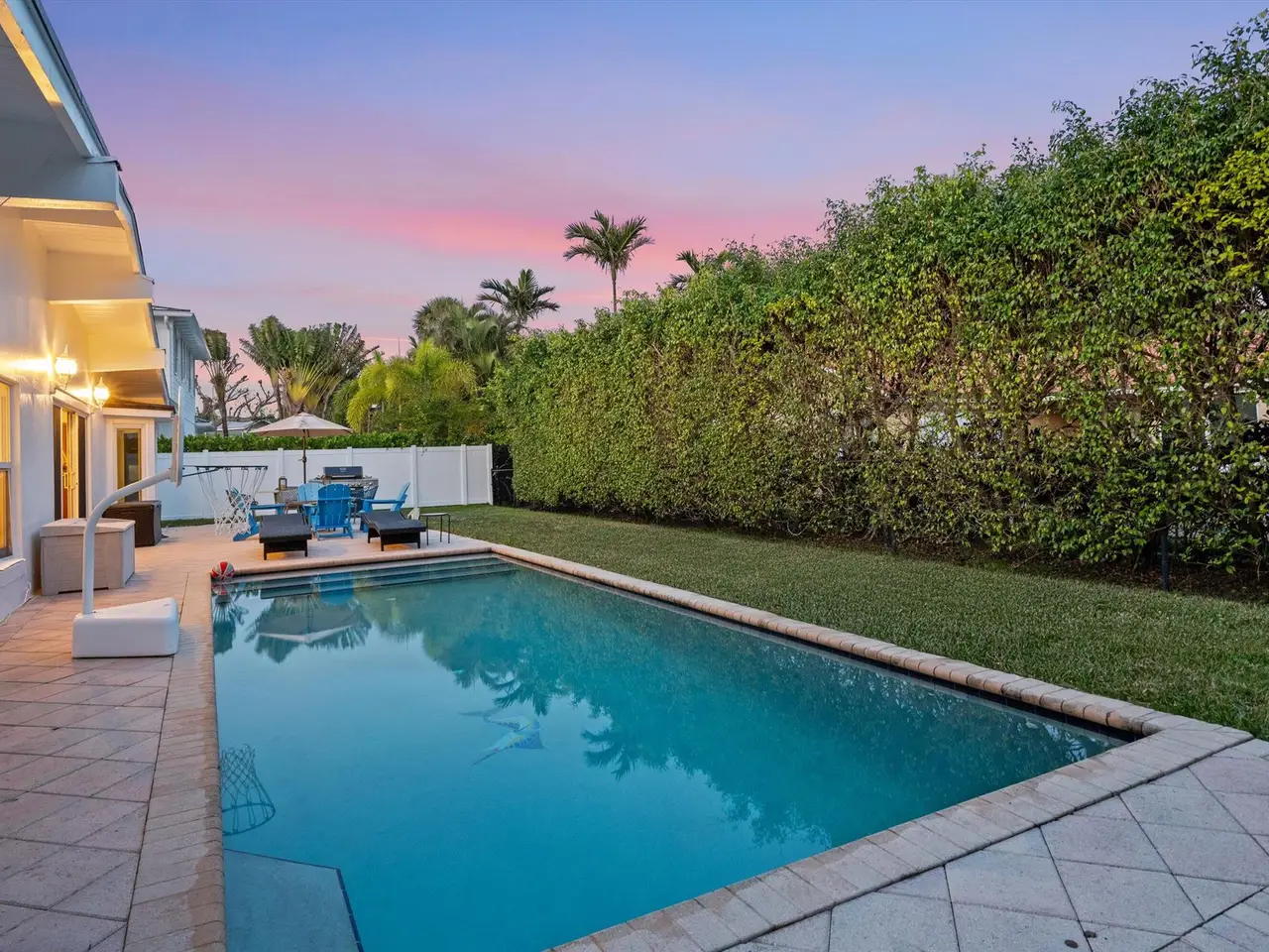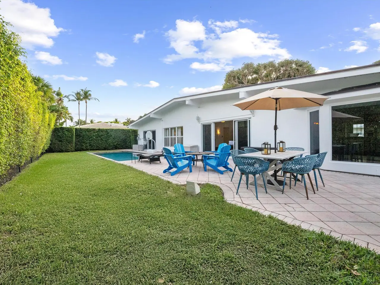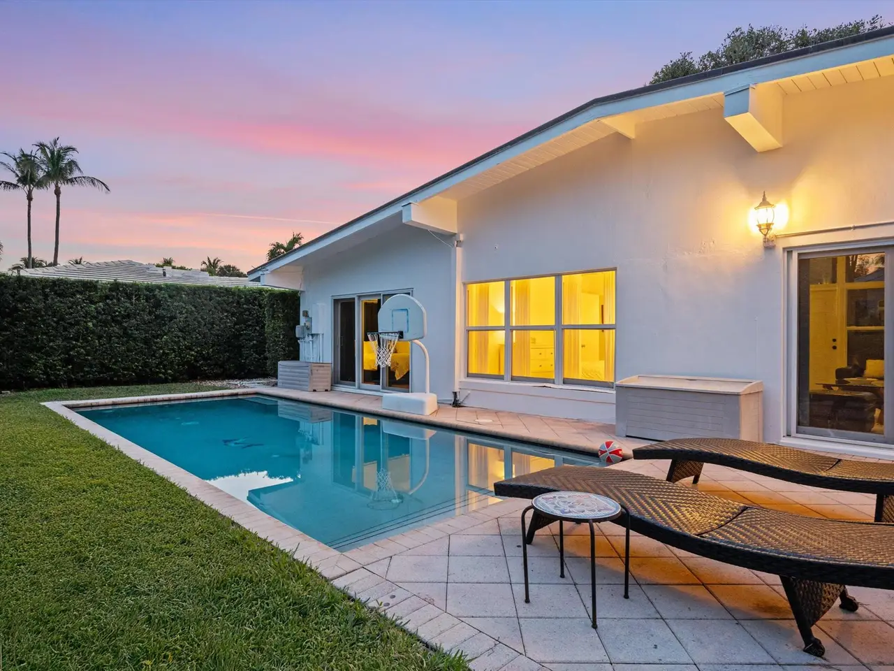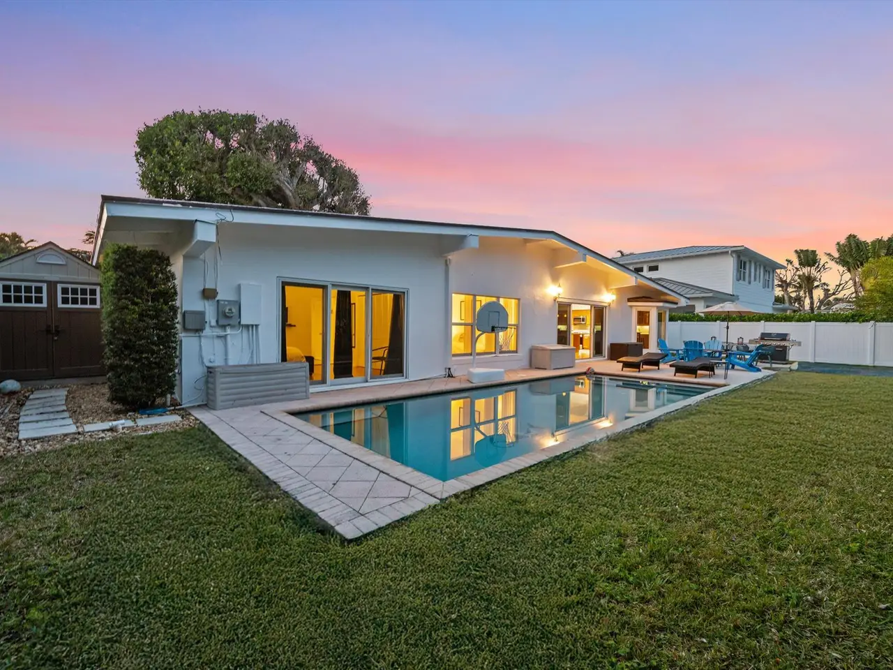 Just steps from the private, secured beaches of Jupiter Inlet Colony, this one-level Mid-Century coastal retreat sits on a prime interior lot, offering both charm and opportunity. Fully furnished and turnkey, this CBS-constructed home features 3 bedrooms, 2 baths, and an open floor plan where the kitchen seamlessly connects to the dining and living areas. With soaring volume ceilings, exposed beams, and all-impact windows and doors, the home is designed for both style and security. Outside, a lushly landscaped backyard oasis awaits, complete with a private pool enveloped by greenery. Offered at land value and sold as-is. This property presents a rare chance to build new or renovated in one of the most coveted beachside communities.