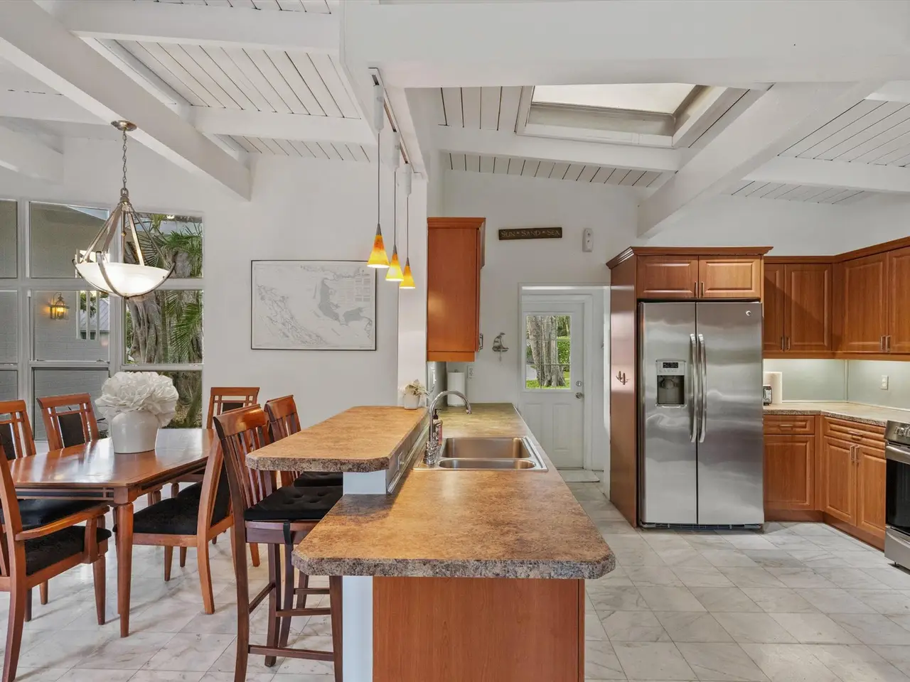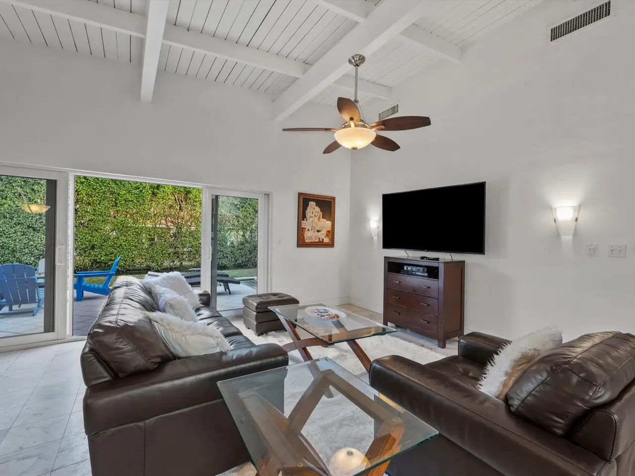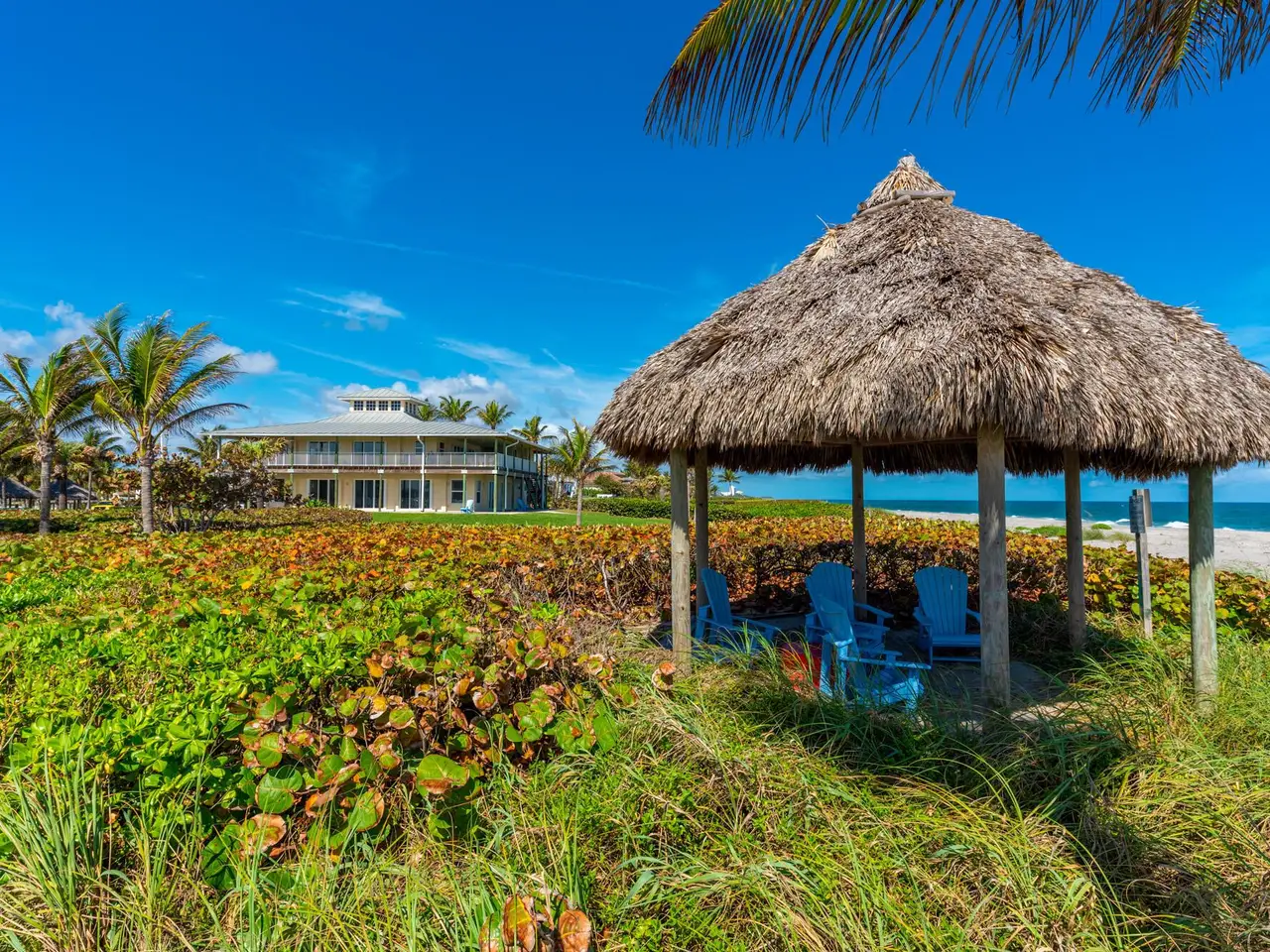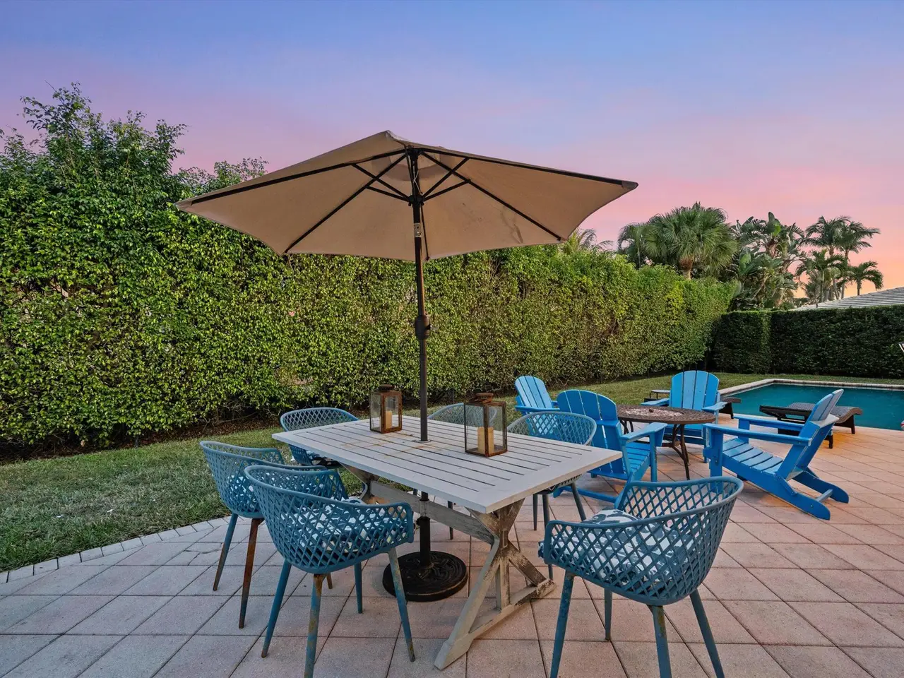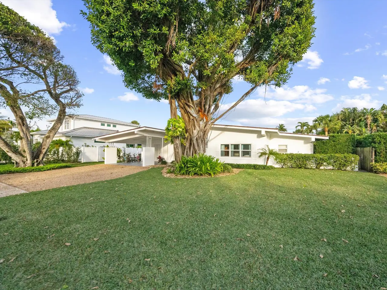 Just steps from the private, secured beaches of Jupiter Inlet Colony, this one-level Mid-Century coastal retreat sits on a prime interior lot, offering both charm and opportunity. Fully furnished and turnkey, this CBS-constructed home features 3 bedrooms, 2 baths, and an open floor plan where the kitchen seamlessly connects to the dining and living areas. With soaring volume ceilings, exposed beams, and all-impact windows and doors, the home is designed for both style and security. Outside, a lushly landscaped backyard oasis awaits, complete with a private pool enveloped by greenery. Offered at land value and sold as-is. This property presents a rare chance to build new or renovated in one of the most coveted beachside communities.