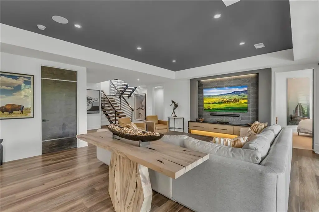 CONTEMPORARY AND LUXURY describes this Artisan designed home built by Casa Bella! A true masterpiece bringing in amazing architecture while touching all your senses! The 2 story water fall greets you at the entry along w/ dramatic ceiling, lighted walkway, leading to the great room w/ marble fireplace surround, back lit quartzite, floor to ceiling windows. The treed back drop is inviting & covered deck has new automatic screens. The Gourmet Kitchen has Carrera Marble island w/ waterfall edge, Frigidaire Refrigerator / Freezer, Cafe Induction Stove Top, Bosch Dishwasher, Cafe oven, Advantium microwace along w/ 2nd oven in the back pantry. Grill deck is a bonus feature right off the pantry. Perfectly positioned study w/ glass panels to bring in the light but nice and quiet for privacy. The Spa-like primary bath has marble floors, double headed shower w/ glass surround, soaking tub, large double vanity w/ plenty of cabinets. Primary bedroom includes built in headboard, king bed & side tables AND a beautiful view to the covered deck & backyard w/ fireplace for those chilly evenings. As you walk down the floating steel staircase w/ solid wood stairs, prepare to be WOW'd as the lower level is an Entertainer's Dream. Back wet bar w/ beverage frig & refrigerator drawer & ice/freezer drawer. The quartzite counter lit island is in perfect position for wine tastings next to the wine feature wall. The 3rd fireplace is the perfect conversation area while the media space is ample and comfortable. You can walk right out to the covered patio & enjoy the fire pit, lush fenced backyard and privacy. 3 bedrooms w/ 2 1/2 baths on the LL. The home gym is amazing space with storage tucked away. Pet Lovers will enjoy the Dog House. 8' deep chocolate modern interior solid wood doors w/ metal inlays, paved stone driveway, Fire & Water feature front and back, epoxy'd garage floor, remote blinds on front entry & sliding back door!