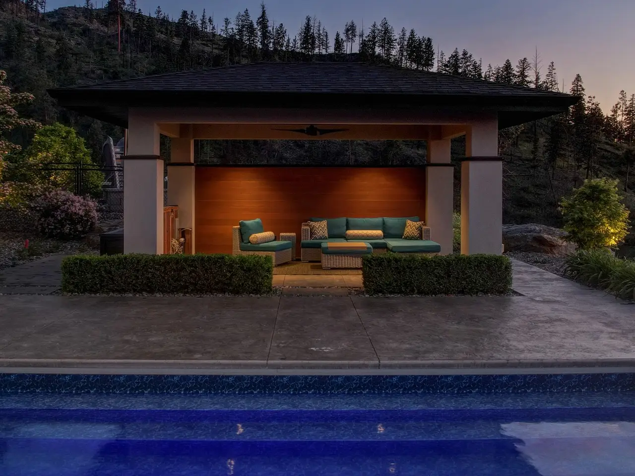 Listed by Unison Jane Hoffman Realty | THE MOST SPECTACULAR view from this rare 0.77 acre site offering unparalleled privacy and over 5400 sq.ft. of luxurious living. Stunning landscape design; the backyard stands as a tranquil retreat. Family & friends will enjoy the outdoor poolside kitchen/cabana. A fabulous pool with automatic cover. Upon entering, you’re greeted by awe-inspiring 14ft ceilings, creating a grand and expansive ambiance. Floor-to-ceiling windows capture breathtaking views, seamlessly blending the indoors with the outdoors. A custom-crafted gas fireplace in the living area serves as an aesthetically pleasing centerpiece. The open concept design effortlessly connects the living space to the gourmet kitchen. Walnut detailing is carried throughout and a stylish island perfectly complements the Westwood white cabinetry and tile backsplash, creating a bright and inviting atmosphere. Exquisite primary suite with custom wallpaper, an opulent ensuite, theatre room with bar area, flexible space created with exterior single car garage door in walk out basement that could be gym area, workshop or hobby/studio. Car enthusiasts will LOVE the 4-car garage and oversized level driveway. Located on a quiet cul-de-sac location, minutes to nearby hiking trails.