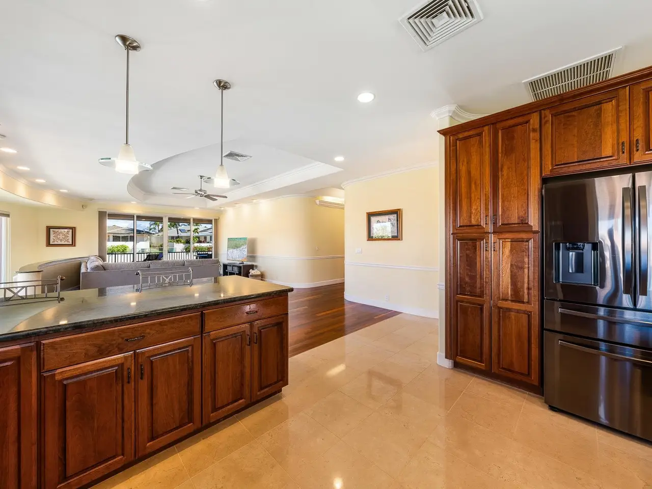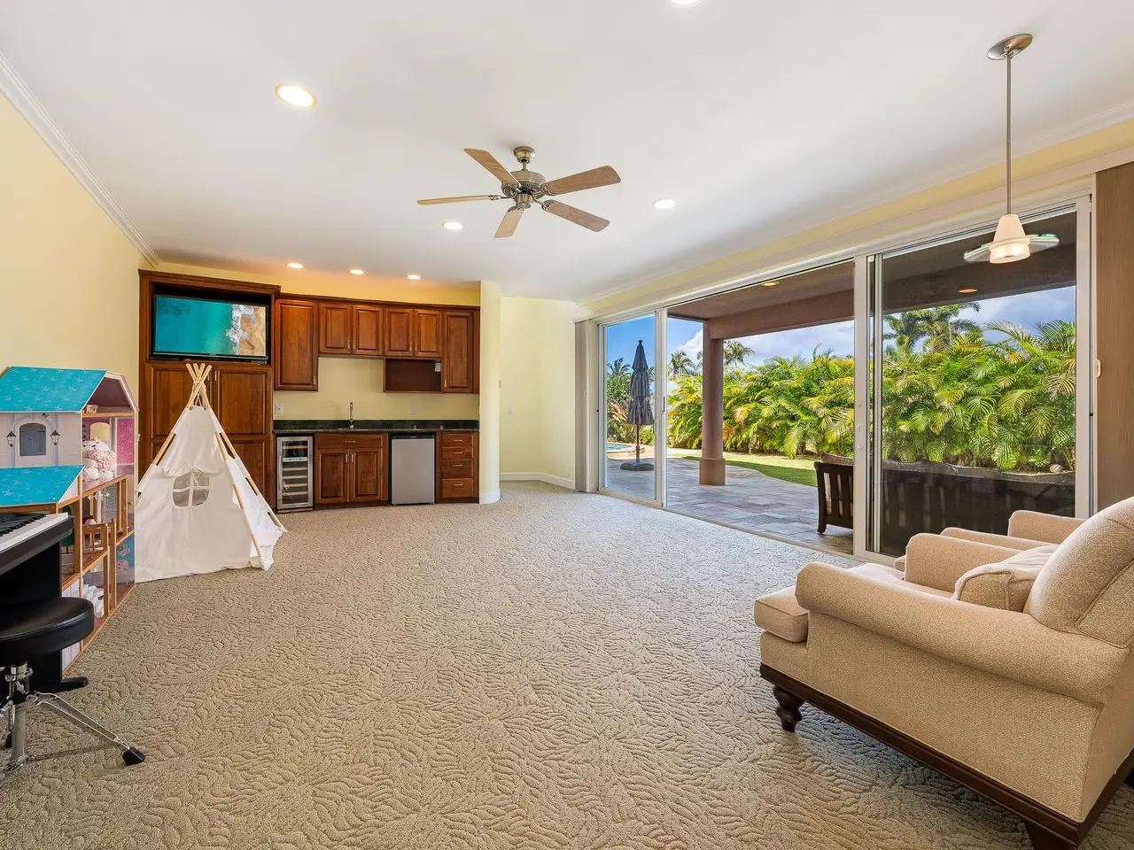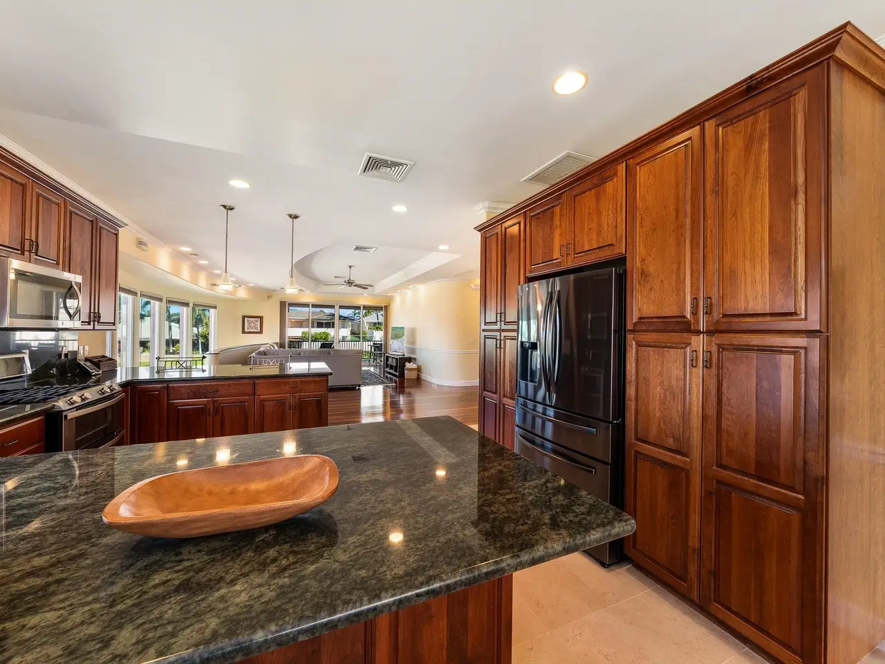 Located at the end of a peaceful cul-de-sac and bordering a lush greenbelt, this exceptionally designed 4 bedroom, 2.5 bathroom home in the prestigious Wailea Kialoa community offers privacy and ocean, sunset, and neighbor island views. The split-level layout provides effortless living with the main level featuring a gourmet chef’s kitchen, a formal dining room, a spacious living area, a luxurious primary suite, a bedroom that serves well as a private office, a powder room, and an attached garage—all designed for comfort and style. The lower level is an entertainer’s dream, with a large den that includes a wet bar, under-counter fridge, wine fridge, and easy access to the pool deck, BBQ area, and a serene private backyard. Luxuriously appointed throughout, the home showcases crème Vienna limestone and burled eucalyptus flooring, rare green granite countertops, and custom cherry cabinetry, highlighting the attention to detail and quality craftsmanship. A laundry room and ample storage areas add to the convenience of this warm and inviting home. The garage is equipped to store your golf clubs, surfboards, and recreational gear, ensuring you are always ready for Maui’s outdoor adventures. Both a PV solar system and a solar water system are in place, thereby reducing the ecological footprint of the property, while the private backyard offers ample space for a garden, creating a perfect blend of luxury and sustainability.