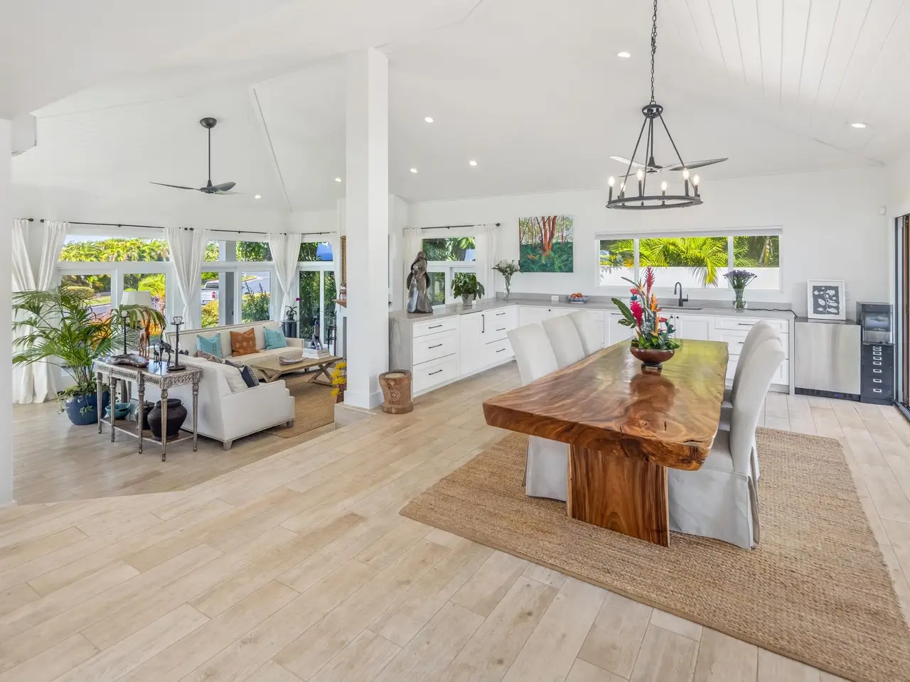 Presenting an extraordinary residence of rare refinement, anchored in the upscale residential community of Wailea Golf Estates. This elegant home reveals sweeping ocean panoramas and dramatic mountain backdrops, framed by open greenery and pristine fairways. The location offers a quiet, relaxed ambiance complemented by the upscale island lifestyle that Wailea is known for. Completely re-envisioned in 2022, the home now showcases a contemporary island aesthetic that radiates both warmth and an elevated style. The layout incorporates several inviting areas for relaxing and hosting, including two dedicated entertainment spaces: One inviting leisurely moments poolside, the other oriented to savor the soft colors of sunset from the beautifully refined kitchen and central living room. Lofty ceilings accentuated with rich Black Walnut beams lift the space upward, guiding your gaze toward the wide sweep of the Pacific. Floor-to-ceiling bi-fold doors fold away to unveil the outdoors, allowing the home to dissolve seamlessly into the landscape. Beyond the threshold, tropical foliage unfurls in layers of color and texture, surrounding a shimmering saltwater pool and spa that feels carved from a private island retreat. Outside, vibrant tropical landscaping, flourishing plants, and an exceptional saltwater pool and spa create a private resort-like escape. This premiere four-bedroom residence, with each suite offering its own private en suite bath, affords a level of comfort and discretion rarely found in Wailea. Its thoughtful configuration naturally supports multi-generational living, providing spacious, well-separated living spaces that allow owners and guests to come together with ease while still enjoying personal space. With whale season and the New Year right around the corner, the timing couldn’t be better: watch humpbacks put on a show and enjoy Maui’s best fireworks right from your own lanai. Set just minutes from Wailea’s pristine shores, championship fairways, designer shopping, and distinguished dining, this residence offers a way of living where sophistication, ease, and exclusivity converge.