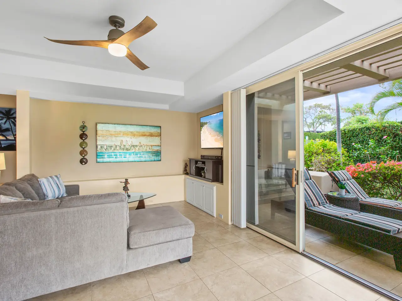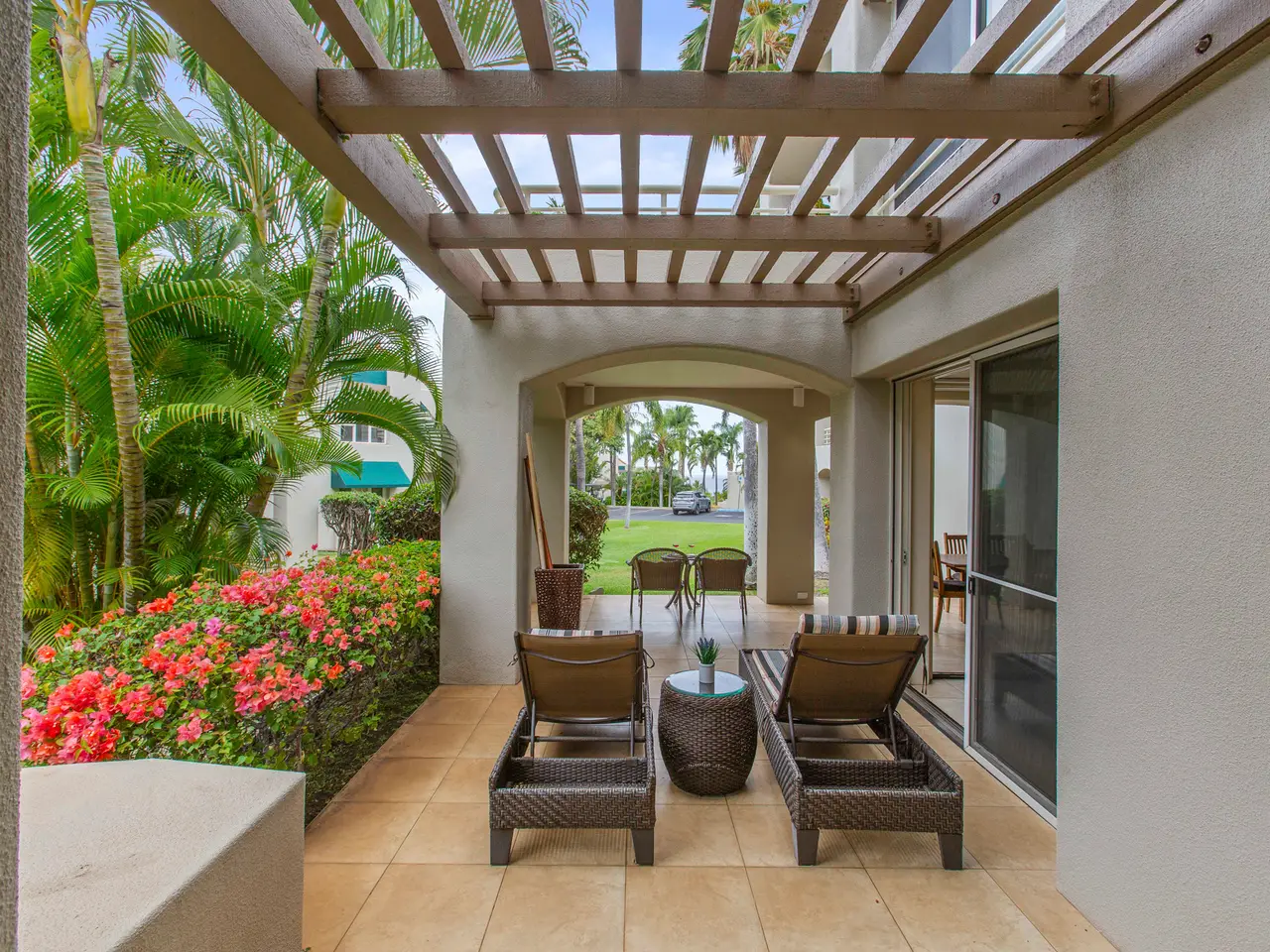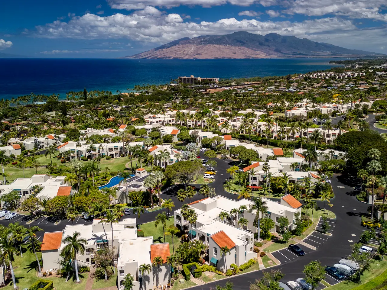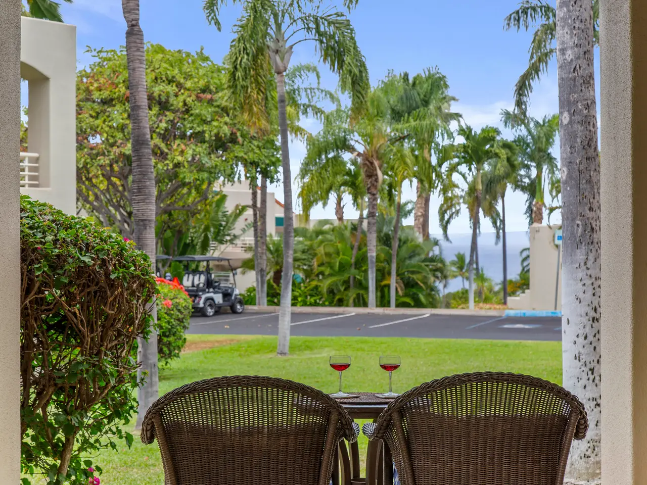 Nestled on the top row of The Palms at Wailea and tucked away from road noise, Palms 307 offers a peaceful slice of paradise—with a bit of ocean view... Whether you're looking for a vacation escape or an investment in Maui’s coveted resort community, this unit is clean, stylish, and move-in ready—offering comfort, value, and a touch of luxury. This light-filled unit welcomes you with an open floor plan and a spacious sunken living area that functions beautifully as a great room. The layout is ideal for relaxing or entertaining, with room to gather and a pullout sofa for practicality. Step out onto the private lanai and take in a peek of the ocean—just enough to remind you how close you are - and that you are living the island dream. The kitchen is well-equipped with granite counters, stainless steel appliances, and a brand-new refrigerator. The pass-through window to the lanai is perfect for serving pupus or a full island feast. The primary suite is a true retreat, featuring a king-sized bed, a new split a/c, and the attached bathroom with dual sinks, and a whirlpool tub. The guest bathroom is equally impressive, finished in travertine tile with a gorgeous walk-in shower. Surrounded by lush tropical landscaping, The Palms at Wailea is a beautifully maintained, low-density complex that's just a short stroll to the beach and world-class amenities. Spa, dining and island activities are all at your fingertips. Priced attractively compared to others in the complex, this unit is an invitation to live your Maui legacy—embrace the lifestyle, the warmth, and the aloha.