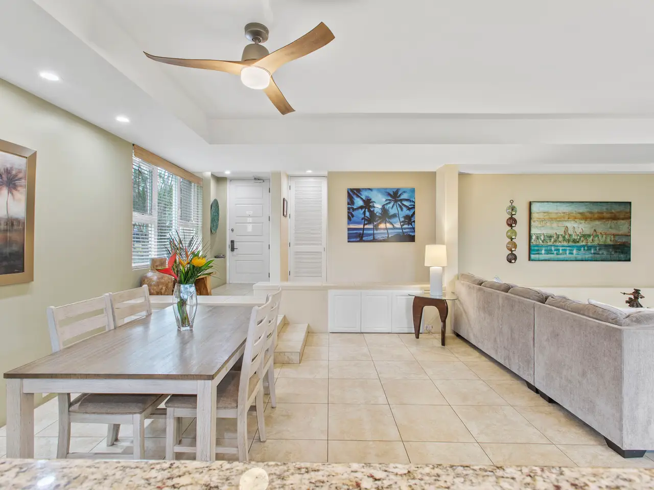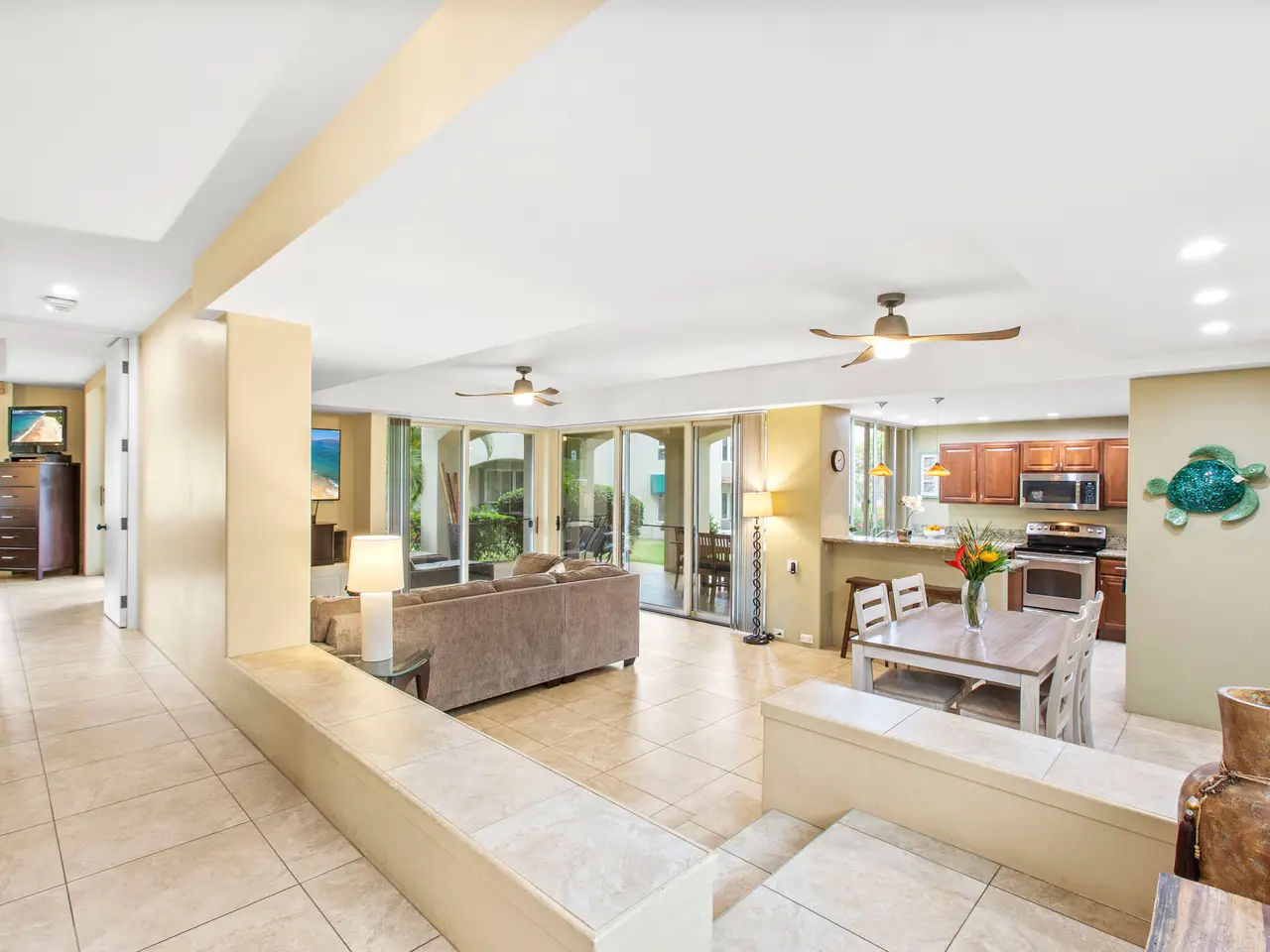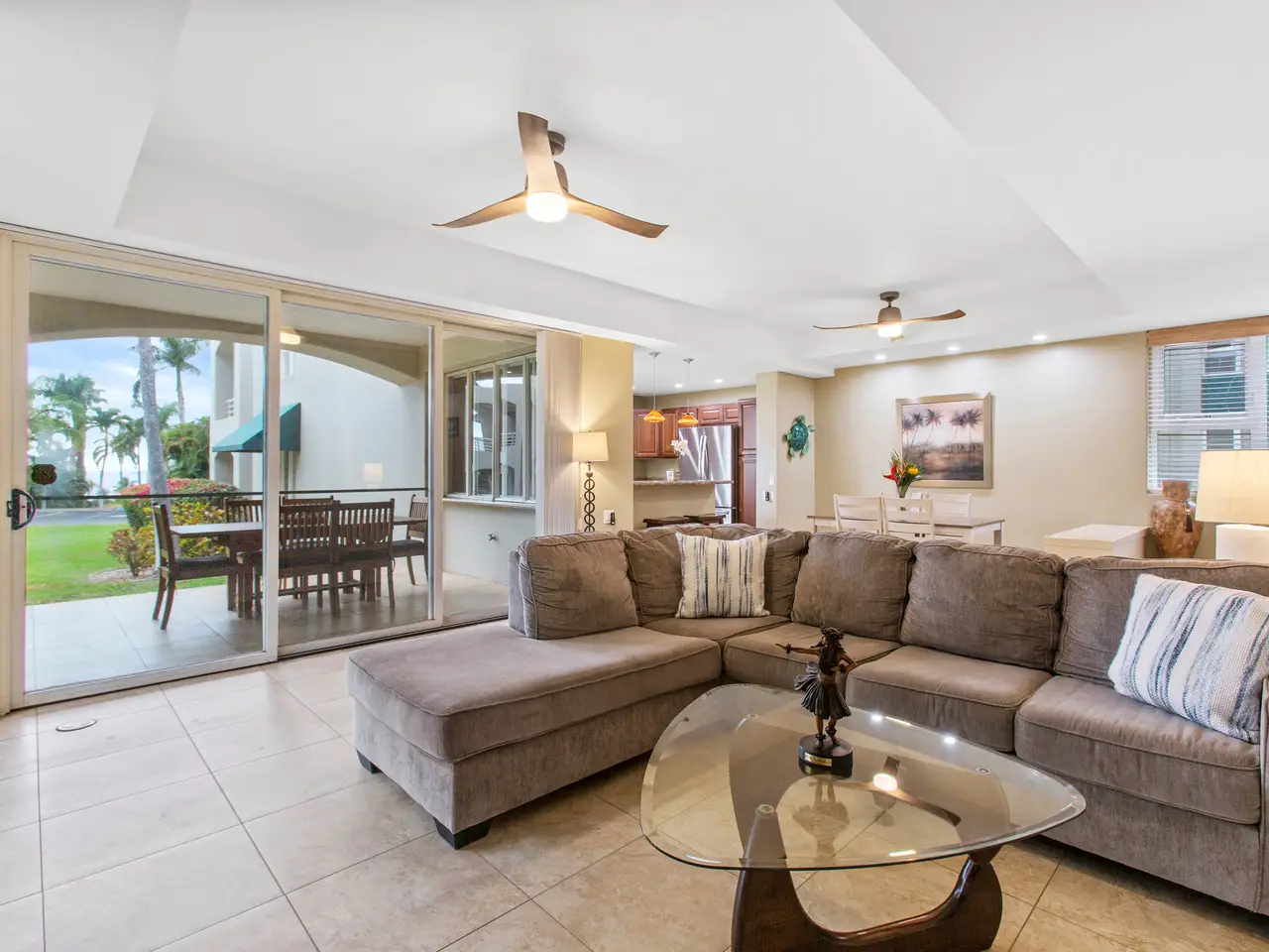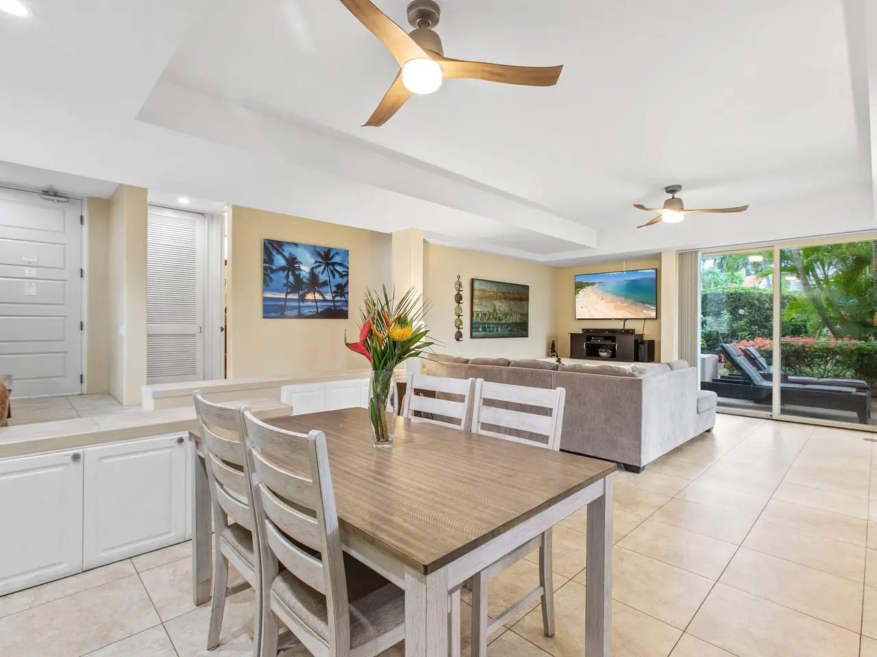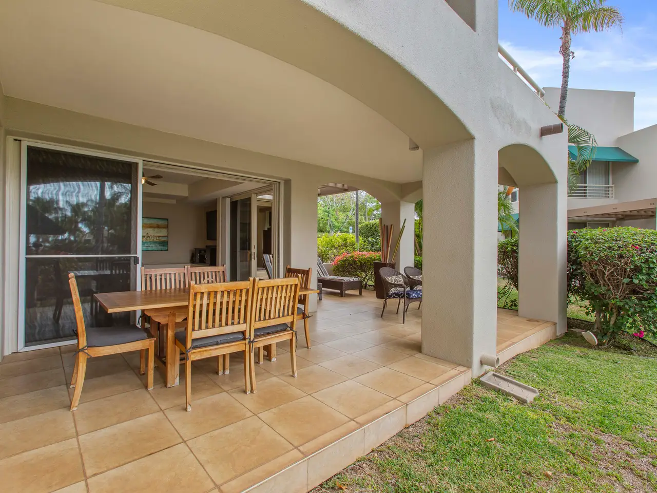 Nestled on the top row of The Palms at Wailea and tucked away from road noise, Palms 307 offers a peaceful slice of paradise—with a bit of ocean view... Whether you're looking for a vacation escape or an investment in Maui’s coveted resort community, this unit is clean, stylish, and move-in ready—offering comfort, value, and a touch of luxury. This light-filled unit welcomes you with an open floor plan and a spacious sunken living area that functions beautifully as a great room. The layout is ideal for relaxing or entertaining, with room to gather and a pullout sofa for practicality. Step out onto the private lanai and take in a peek of the ocean—just enough to remind you how close you are - and that you are living the island dream. The kitchen is well-equipped with granite counters, stainless steel appliances, and a brand-new refrigerator. The pass-through window to the lanai is perfect for serving pupus or a full island feast. The primary suite is a true retreat, featuring a king-sized bed, a new split a/c, and the attached bathroom with dual sinks, and a whirlpool tub. The guest bathroom is equally impressive, finished in travertine tile with a gorgeous walk-in shower. Surrounded by lush tropical landscaping, The Palms at Wailea is a beautifully maintained, low-density complex that's just a short stroll to the beach and world-class amenities. Spa, dining and island activities are all at your fingertips. Priced attractively compared to others in the complex, this unit is an invitation to live your Maui legacy—embrace the lifestyle, the warmth, and the aloha.