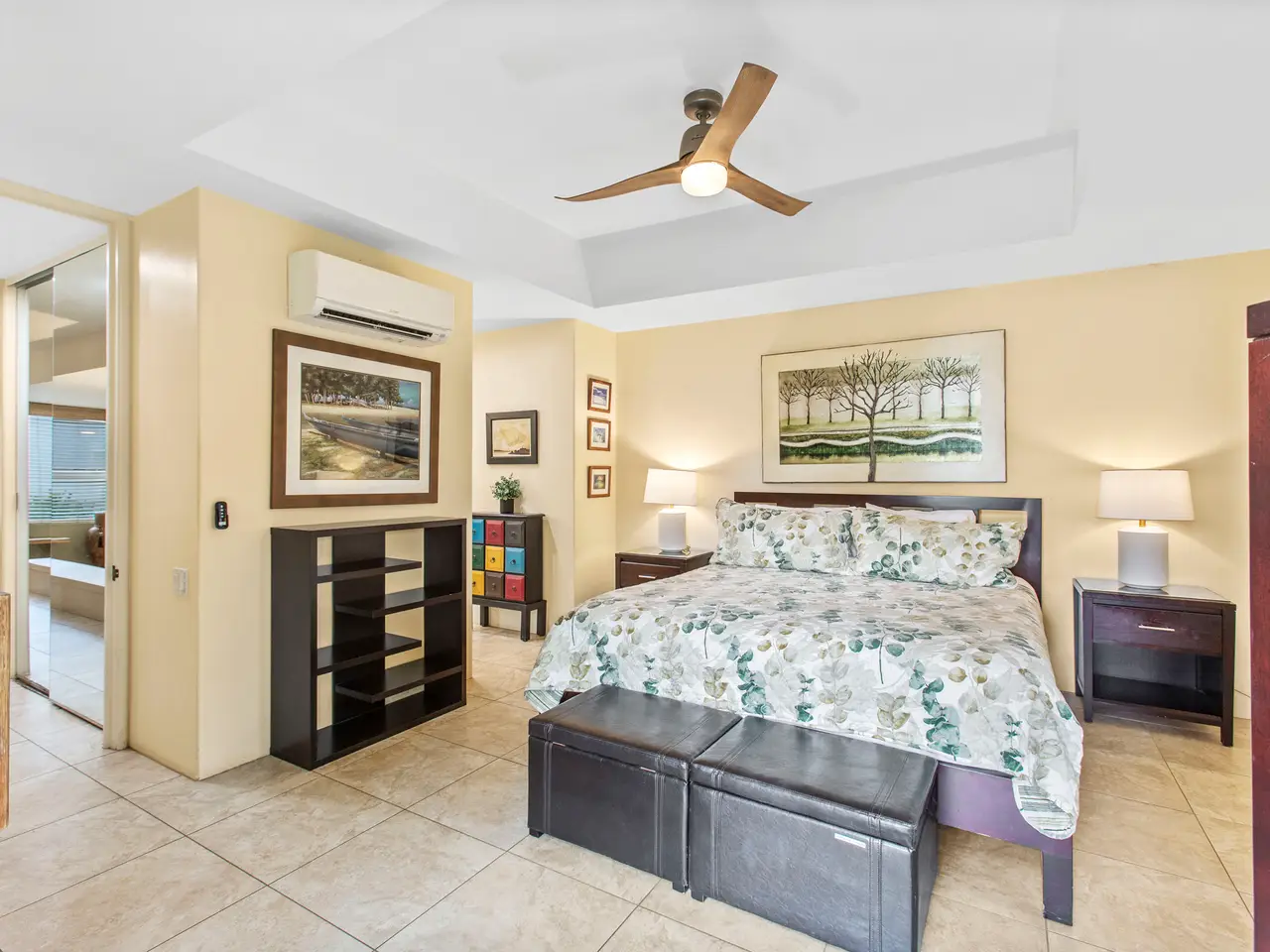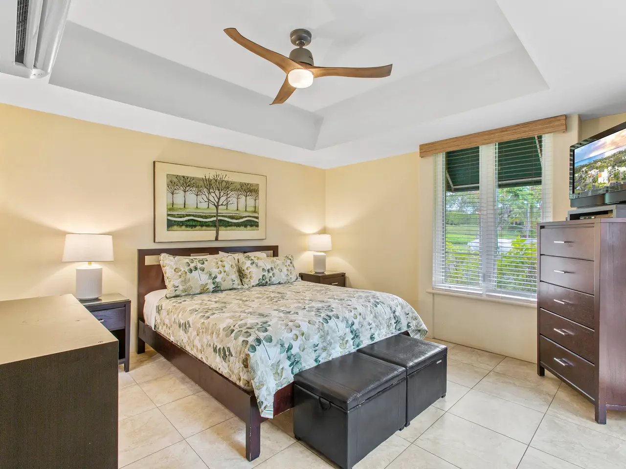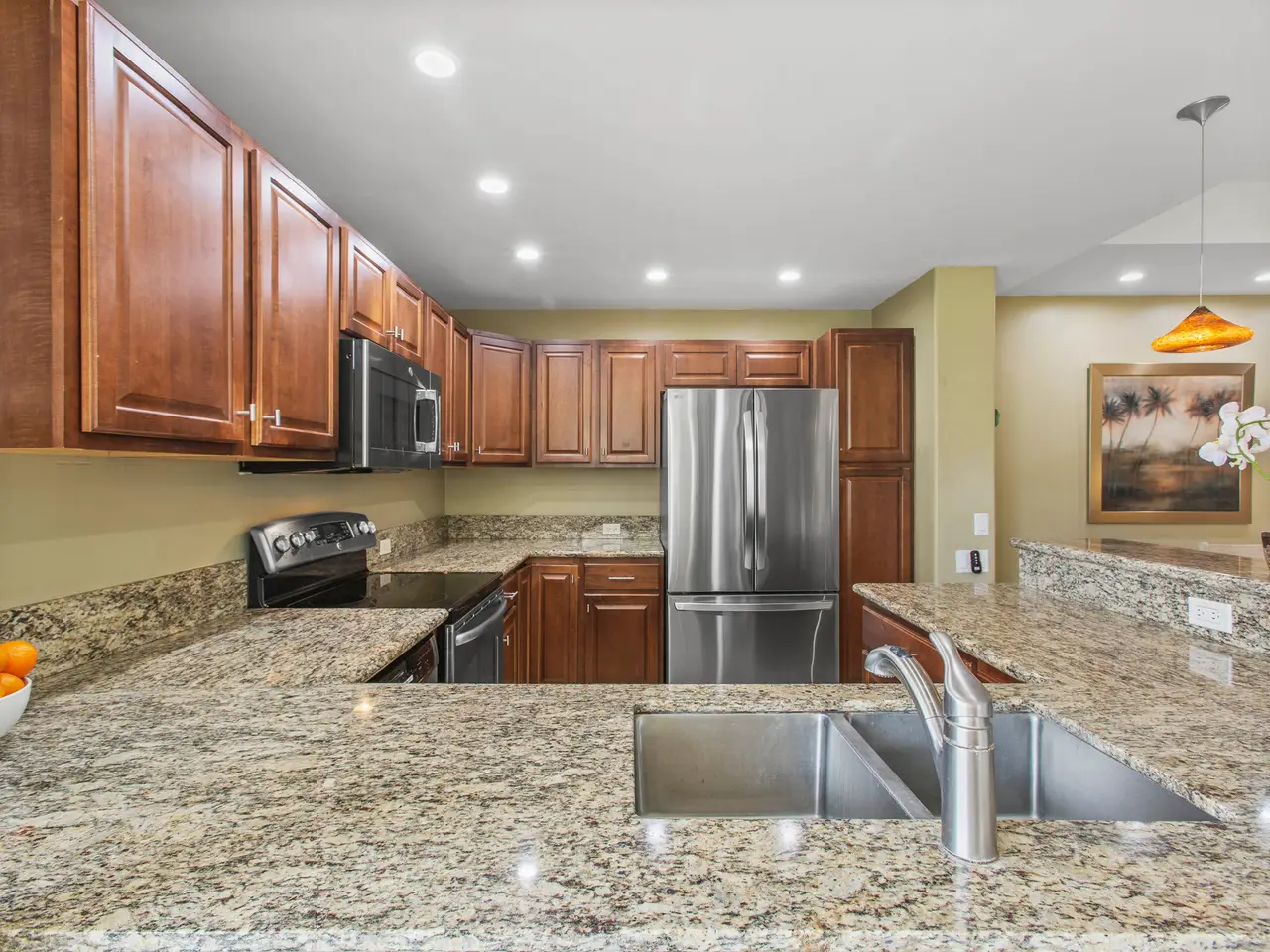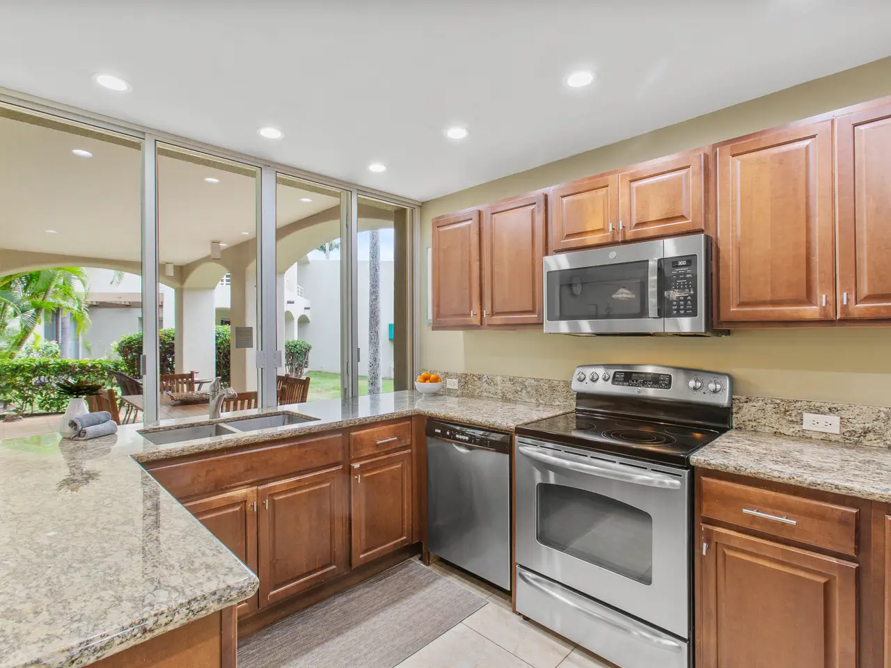 Nestled on the top row of The Palms at Wailea and tucked away from road noise, Palms 307 offers a peaceful slice of paradise—with a bit of ocean view... Whether you're looking for a vacation escape or an investment in Maui’s coveted resort community, this unit is clean, stylish, and move-in ready—offering comfort, value, and a touch of luxury. This light-filled unit welcomes you with an open floor plan and a spacious sunken living area that functions beautifully as a great room. The layout is ideal for relaxing or entertaining, with room to gather and a pullout sofa for practicality. Step out onto the private lanai and take in a peek of the ocean—just enough to remind you how close you are - and that you are living the island dream. The kitchen is well-equipped with granite counters, stainless steel appliances, and a brand-new refrigerator. The pass-through window to the lanai is perfect for serving pupus or a full island feast. The primary suite is a true retreat, featuring a king-sized bed, a new split a/c, and the attached bathroom with dual sinks, and a whirlpool tub. The guest bathroom is equally impressive, finished in travertine tile with a gorgeous walk-in shower. Surrounded by lush tropical landscaping, The Palms at Wailea is a beautifully maintained, low-density complex that's just a short stroll to the beach and world-class amenities. Spa, dining and island activities are all at your fingertips. Priced attractively compared to others in the complex, this unit is an invitation to live your Maui legacy—embrace the lifestyle, the warmth, and the aloha.