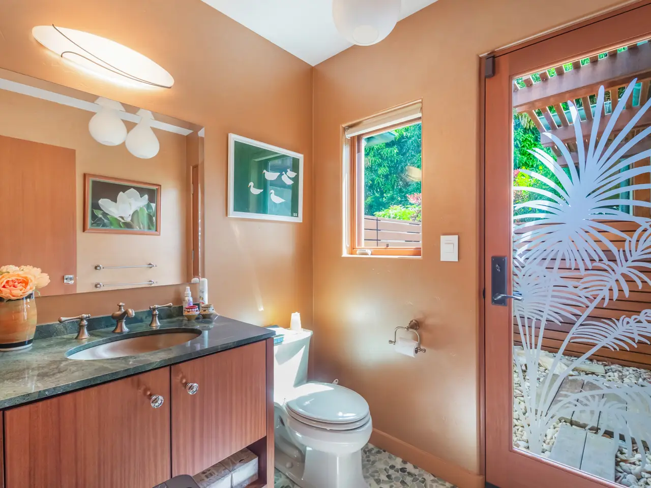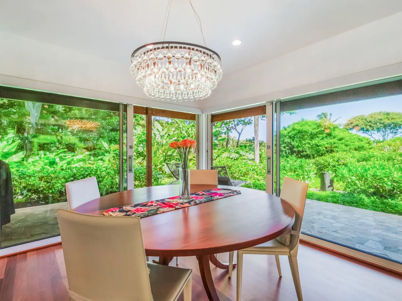 Set above one of Kauai’s most iconic stretches of coastline, this 1.3-acre property offers private, deeded access to coveted Secret Beach via a scenic footpath. Built just 10 years ago and meticulously maintained by its original owner, the 2,000 sqft residence is tucked into a lush botanical landscape with ocean views and a focus on indoor/outdoor living. Sapele wood flooring runs throughout, with tile and stone finishes in the bathrooms. A sculptural Sapele wood and glass floating staircase anchors the two-story layout. Upstairs, the main living space opens to an expansive lanai with sweeping ocean and sunset views. Multiple sliding doors and well-placed windows bring in natural light and steady trade winds, blending the interior spaces with the surrounding gardens. The home is fully air-conditioned and equipped with a whole-house water purification system, electric tankless water heater, and a 14-panel owned photovoltaic system. Additional highlights include a dedicated dance or exercise room, a tropical outdoor shower off the half bath, and copper gutters and trim. Infrastructure is in place to support future additions, including underground electrical for a potential pool. An attached garage and carport offer ample storage for all the gear needed to enjoy Kauai’s outdoor lifestyle. Select custom furnishings are included, and concept plans are available to expand the residence into a 3-bedroom, 3.5-bath estate. A private, well-executed retreat in one of the North Shore’s most sought-after locations—just minutes from Kilauea town, the historic lighthouse, world-class golf in Princeville, and a collection of Kauai’s finest beaches.