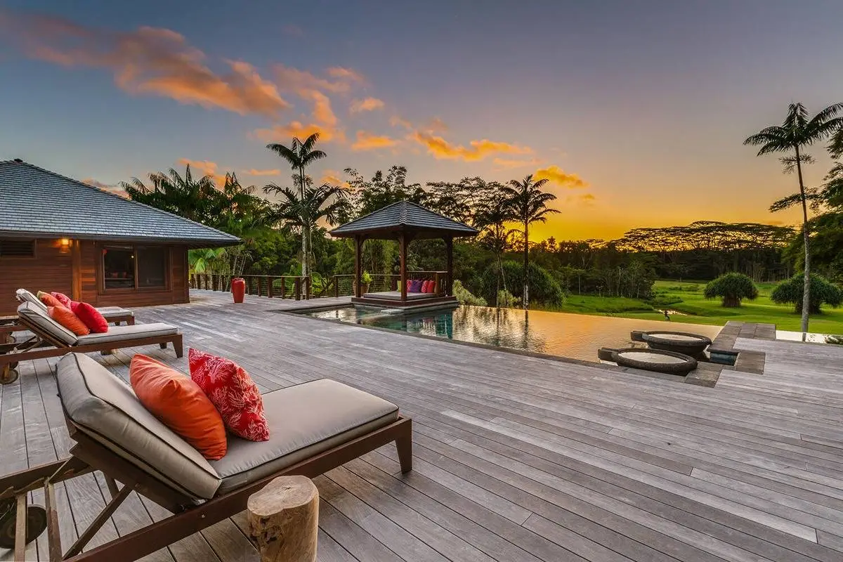 Tucked away in absolute seclusion, this expansive estate spans 3.5 acres and offers complete privacy and Bali-style luxury. With breathtaking views of Mt. Namahana as a picturesque backdrop, the 4502 sqft main residence offers four bedrooms and three and a half baths. The grand 1750 sqft great room, which includes a spacious gourmet kitchen, inviting living area, and elegant dining space, serves as the perfect venue for entertaining guests and large family gatherings. The separate bedroom suites are connected by open covered breezeways, leading to an outdoor living room-style lanai. Designed to embrace the tropical lifestyle, the residence offers extensive outdoor covered living areas and capitalizes on the refreshing tradewinds.Outside the great room, the infinity-edged salt-water pool and spa adorned with imported greenstone tiles create a captivating centerpiece, surrounded by over 3000 sqft of ipe decking and expansive outdoor covered living spaces. The spacious multi-purpose open living area downstairs is currently used as a gym. Additional features include an oversized two-car garage, air conditioning and a private detached "writer's cottage.” Distinguishing itself within the neighborhood, the house is meticulously framed with termite-resistant tropical hardwoods throughout. The home features a brand new cedar shake roof, complemented by copper gutters and rain chains. Lava stone accents adorn the exterior, while custom-carved stone art pieces are integrated into carefully selected areas of the home. Breathtaking tropical landscaping and water features complete the atmosphere. The short drive to Kilauea town offers numerous amenities and conveniences. World class golf is just a few minutes away in Princeville. Famed Hanalei Bay and countless breathtaking beaches and surf spots are also easily accessible from this ideal location on Kauai's North Shore. This is arguably one of the finest properties in Kalihiwai Ridge and the entire North Shore.