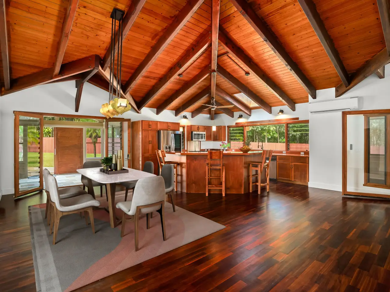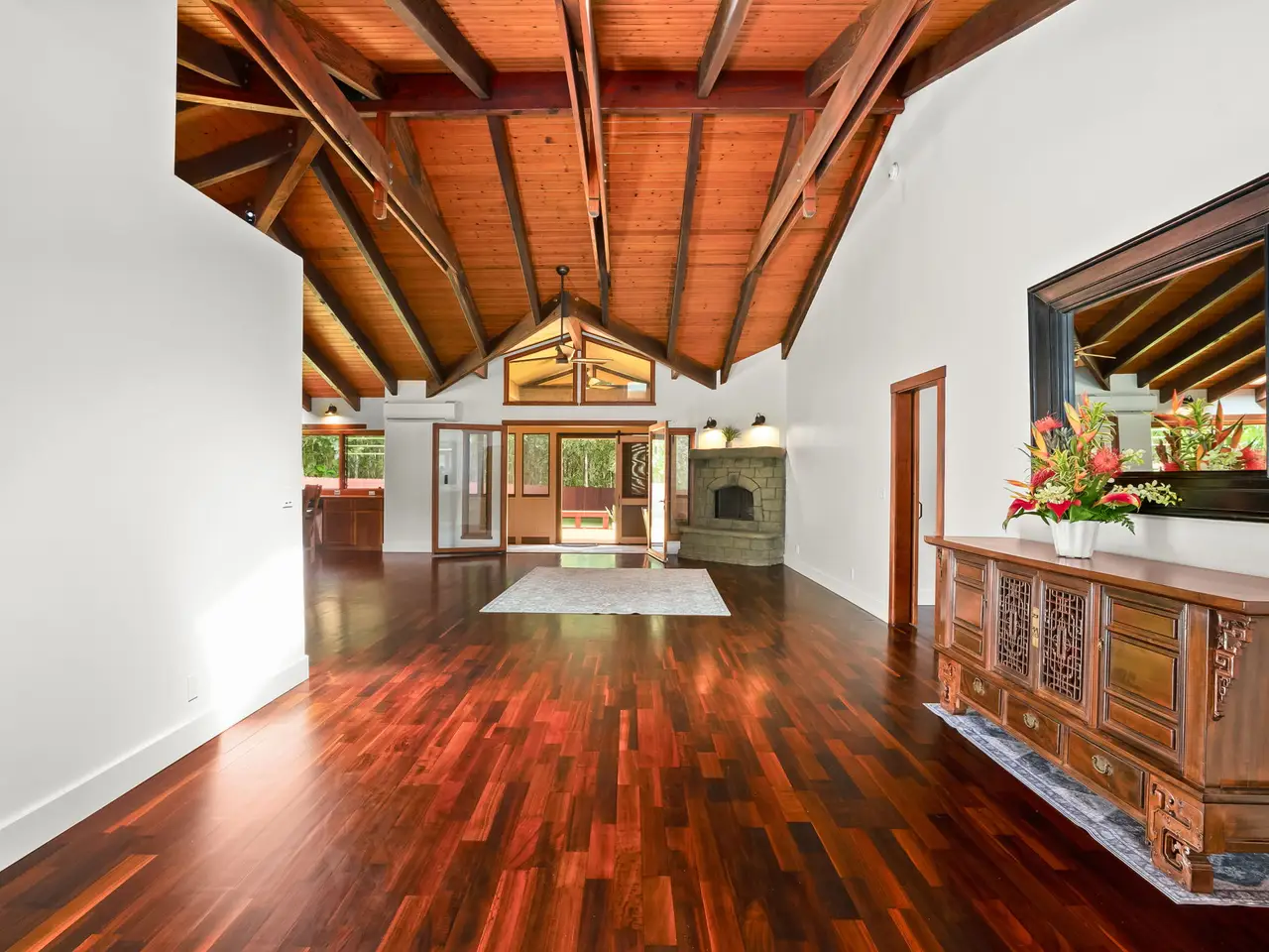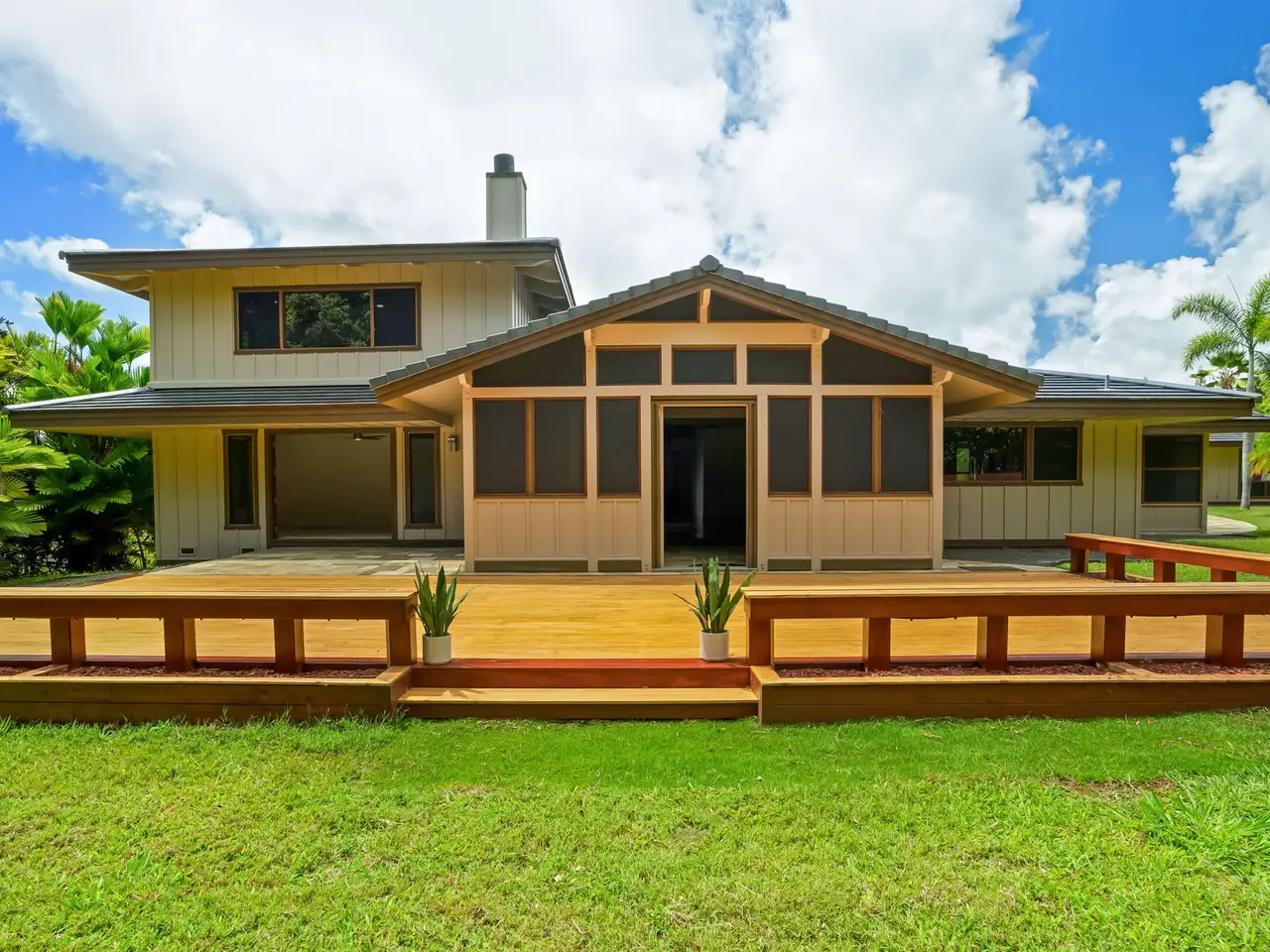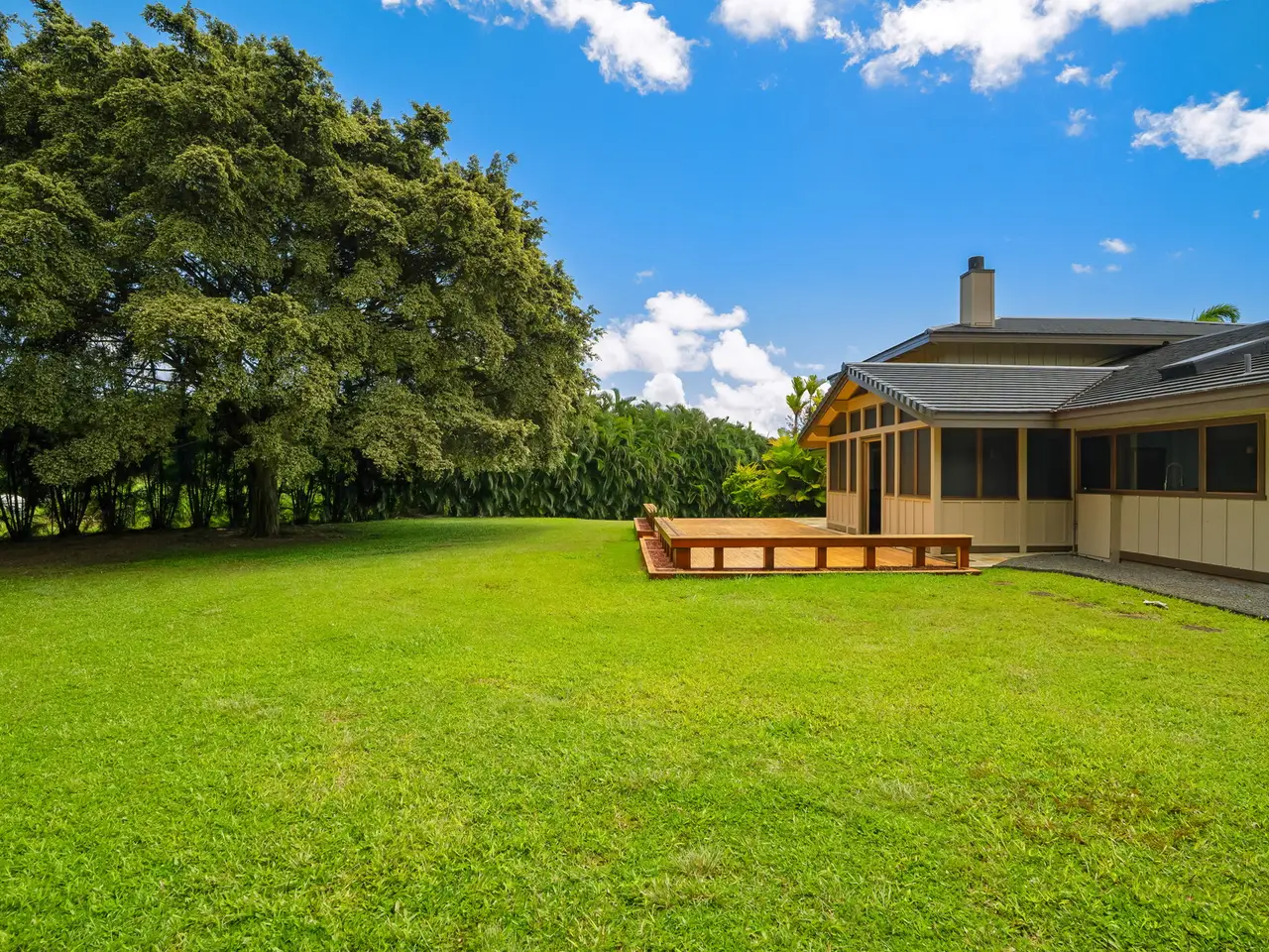 Situated down a gated drive, this estate property offers tranquility, privacy and serene views. The home features 4 bedrooms and 3.5 baths, consisting of 3,354 square feet with an open floor plan. All rooms are large and airy with fresh trade wind breezes throughout. The hardwood floors are imported, as are many of the home’s unique “work of art” features, including hammered copper sinks & bathtub, carved doors and the heavy-beamed 15 foot high ceilings. The cabinets throughout are custom made of teak. The upper level consists of a 910 Sq.Ft. primary suite with a sitting area connected to an adjoining room which can be used as an office, gym or studio. The dressing area and walk-in closet give easy access to the spacious primary bath. Luxuriate in the bath while enjoying the garden views or shower in a unique glass-doored shower and enjoy views of the mountains. The separate 728-square foot, oversized, 2-car garage has a half bath. The estate’s 3+ acres are entirely fenced. The grounds are surrounded on one side by acres of Teak and Mahogany trees and the perimeter is planted with bamboo, mock orange and arecia palms affording total privacy. Views of the mountains, a natural, spring-fed pond and a stream running through the property are just a few of the many amenities that enhance this beautiful setting. Harvest plenty of fresh fruit from the mature, exotic tropical orchard. Other notable features include: • New Split A/C Units • Brand New Tile Roof • Imported Hardwood Flooring • Freshly Painted Interior & Exterior • Screened-in Lanais (x 2) • Large walk-in Closet & Dressing Area • Separate Oversized Garage / Workshop • Gated Entry • Fully Fenced • New Rear Deck for Outdoor Entertaining • Open Floor Plan w/ Extra-Large Rooms • Custom Teak Cabinetry Throughout • Hammered Copper Sinks & Bathtub • Carved Hardwood Doors Come and discover this exceptional North Shore property...