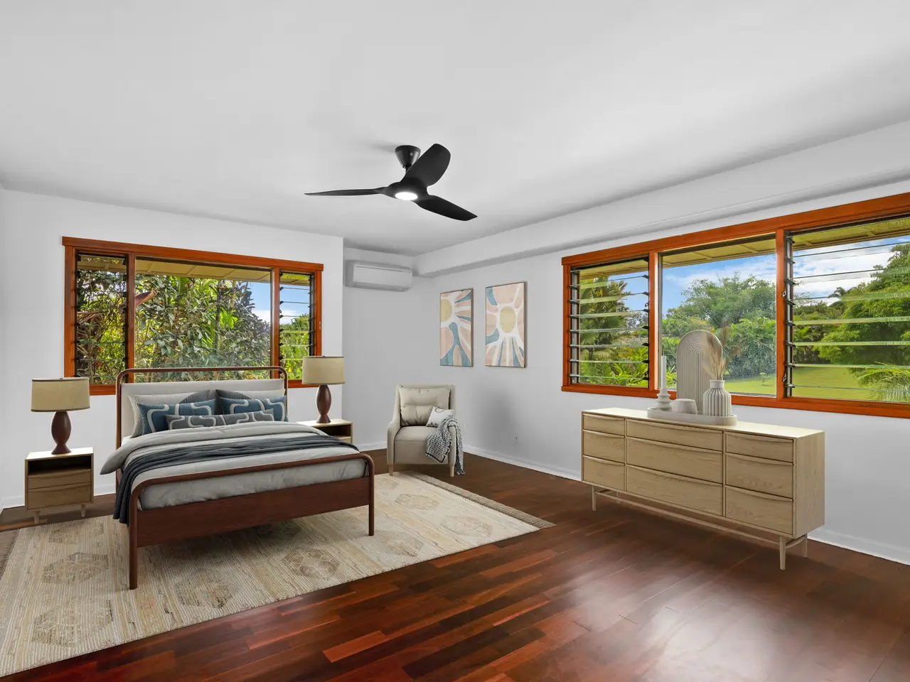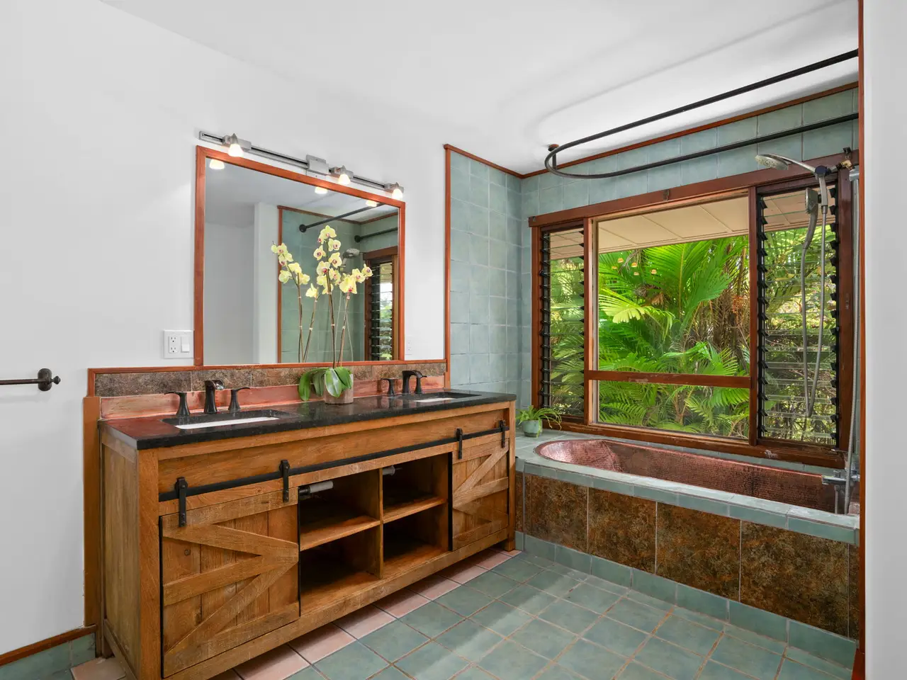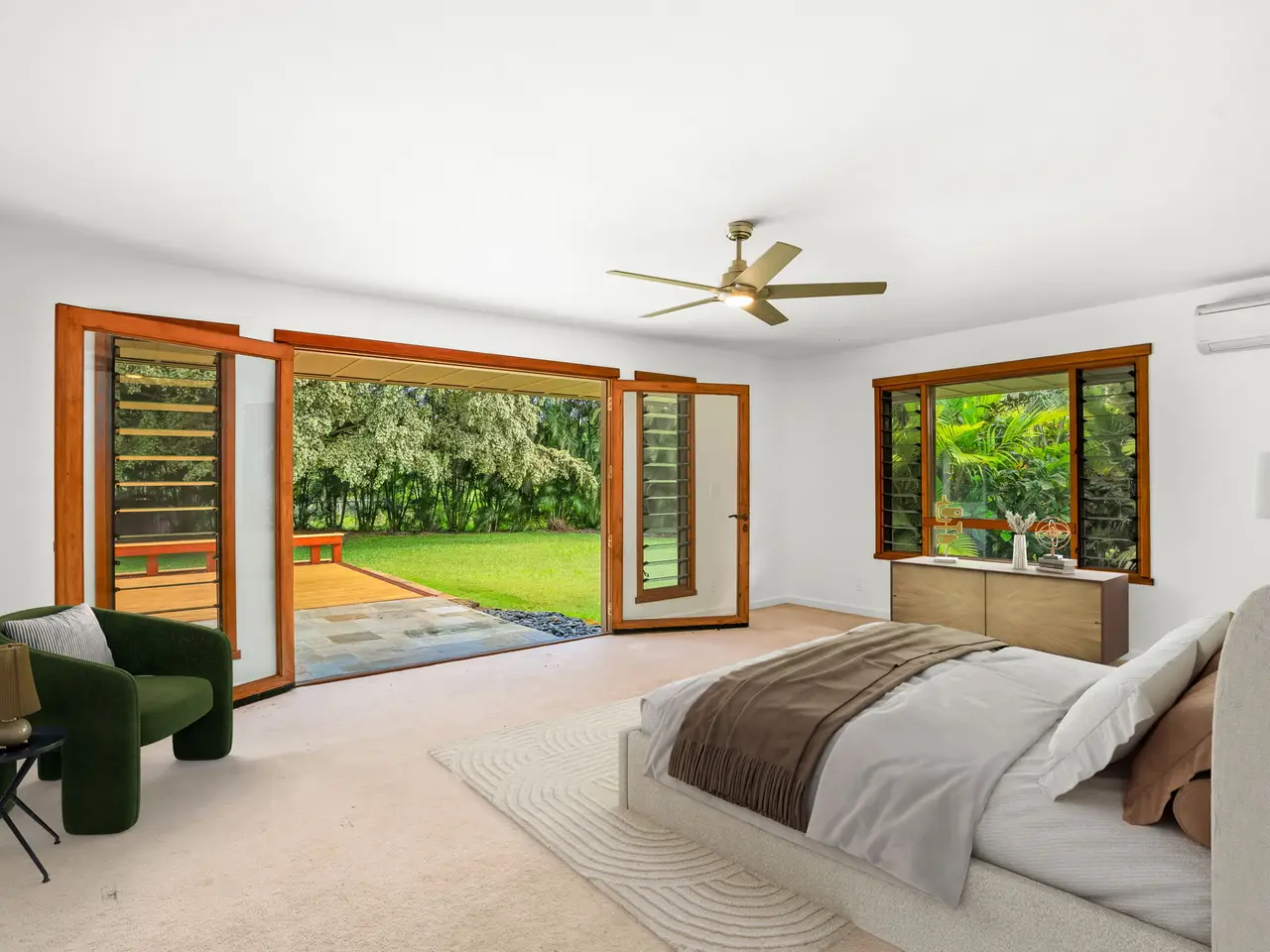 Situated down a gated drive, this estate property offers tranquility, privacy and serene views. The home features 4 bedrooms and 3.5 baths, consisting of 3,354 square feet with an open floor plan. All rooms are large and airy with fresh trade wind breezes throughout. The hardwood floors are imported, as are many of the home’s unique “work of art” features, including hammered copper sinks & bathtub, carved doors and the heavy-beamed 15 foot high ceilings. The cabinets throughout are custom made of teak. The upper level consists of a 910 Sq.Ft. primary suite with a sitting area connected to an adjoining room which can be used as an office, gym or studio. The dressing area and walk-in closet give easy access to the spacious primary bath. Luxuriate in the bath while enjoying the garden views or shower in a unique glass-doored shower and enjoy views of the mountains. The separate 728-square foot, oversized, 2-car garage has a half bath. The estate’s 3+ acres are entirely fenced. The grounds are surrounded on one side by acres of Teak and Mahogany trees and the perimeter is planted with bamboo, mock orange and arecia palms affording total privacy. Views of the mountains, a natural, spring-fed pond and a stream running through the property are just a few of the many amenities that enhance this beautiful setting. Harvest plenty of fresh fruit from the mature, exotic tropical orchard. Other notable features include: • New Split A/C Units • Brand New Tile Roof • Imported Hardwood Flooring • Freshly Painted Interior & Exterior • Screened-in Lanais (x 2) • Large walk-in Closet & Dressing Area • Separate Oversized Garage / Workshop • Gated Entry • Fully Fenced • New Rear Deck for Outdoor Entertaining • Open Floor Plan w/ Extra-Large Rooms • Custom Teak Cabinetry Throughout • Hammered Copper Sinks & Bathtub • Carved Hardwood Doors Come and discover this exceptional North Shore property...