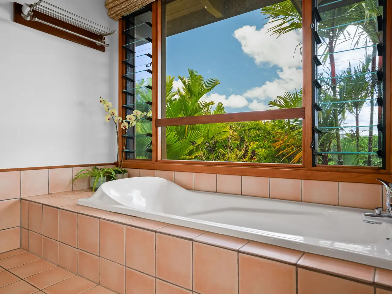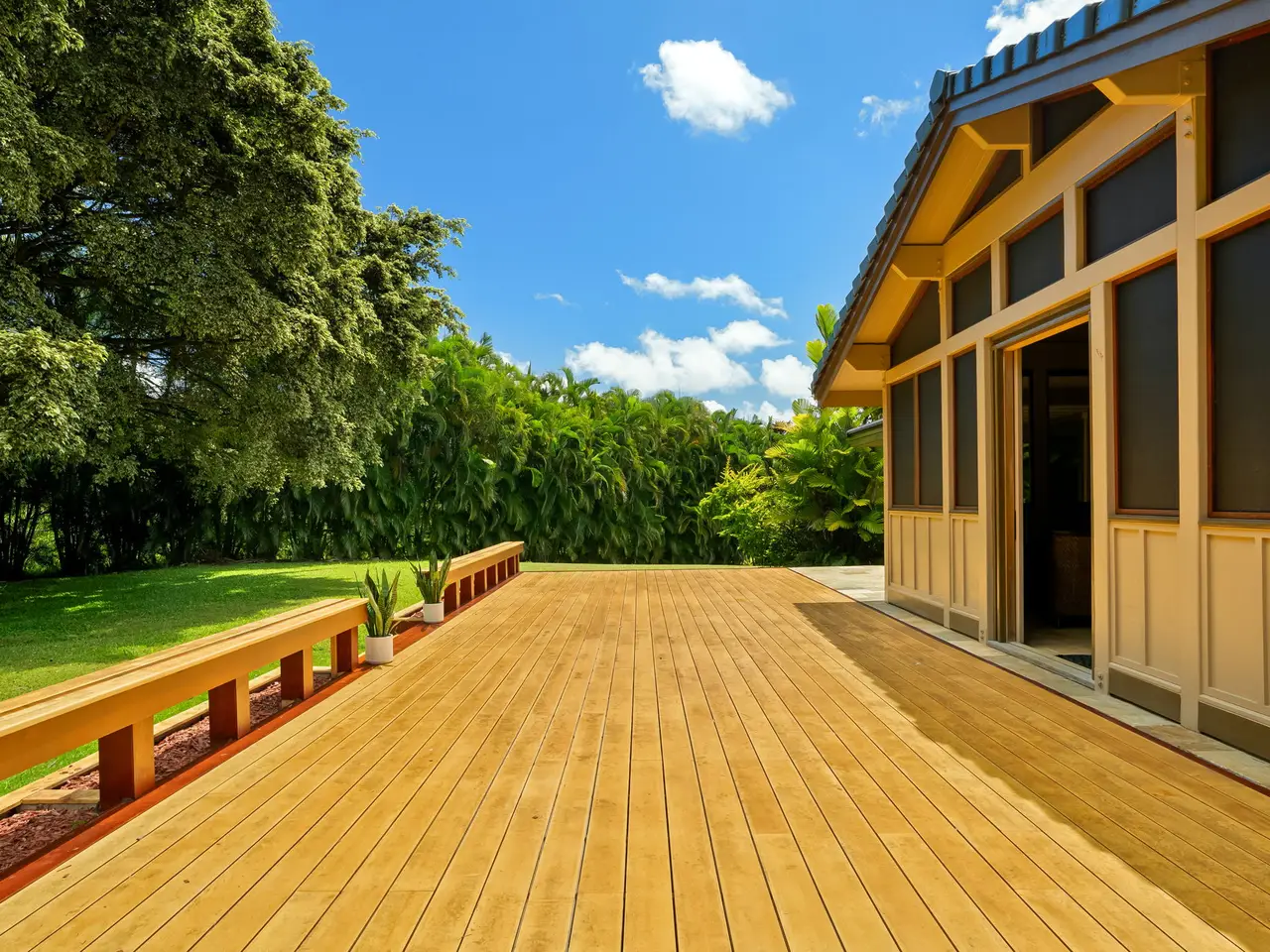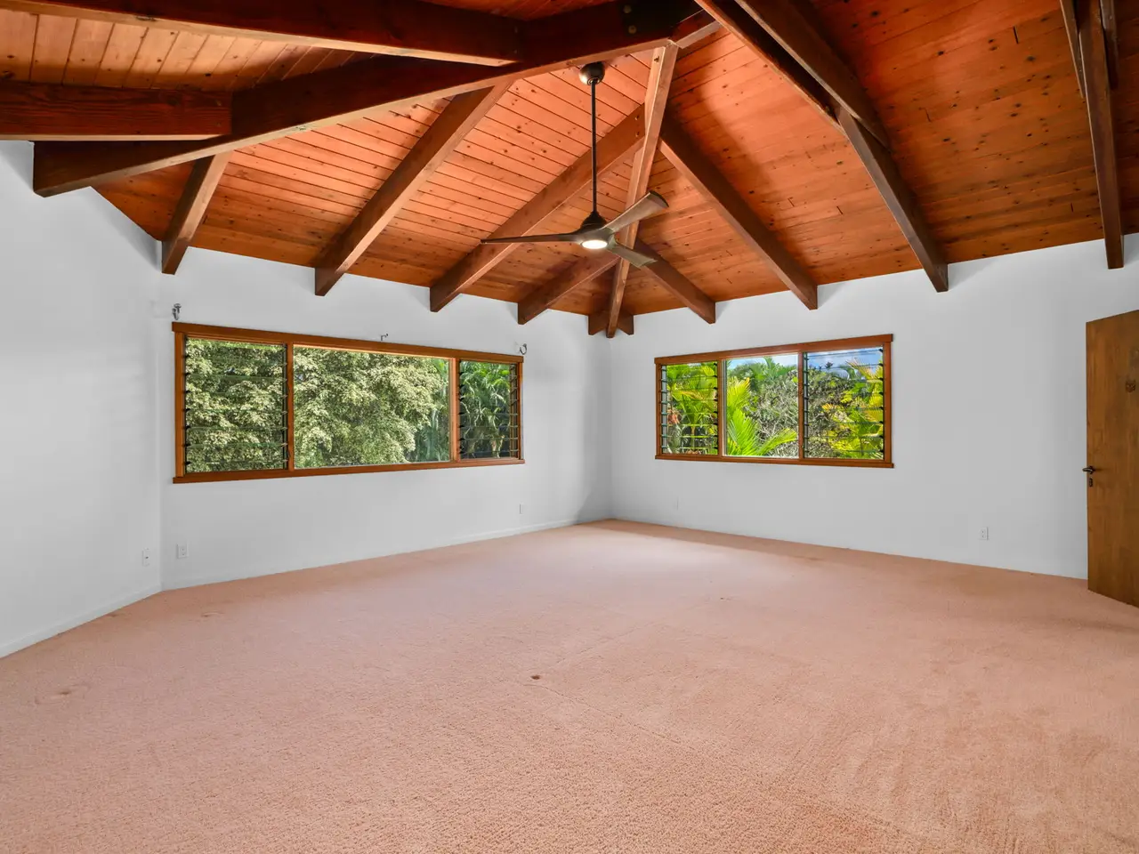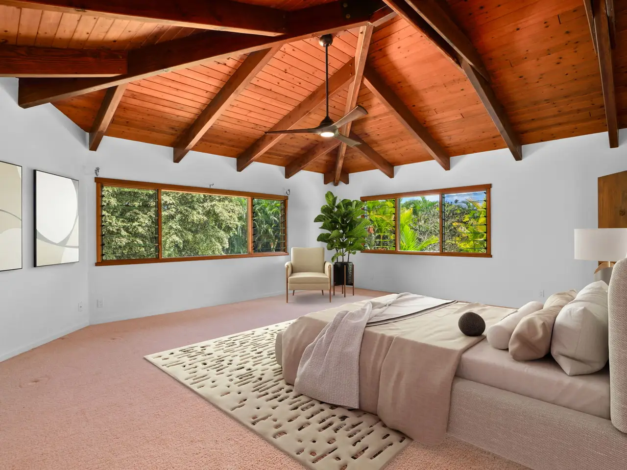Situated down a gated drive, this estate property offers tranquility, privacy and serene views. The home features 4 bedrooms and 3.5 baths, consisting of 3,354 square feet with an open floor plan. All rooms are large and airy with fresh trade wind breezes throughout. The hardwood floors are imported, as are many of the home’s unique “work of art” features, including hammered copper sinks & bathtub, carved doors and the heavy-beamed 15 foot high ceilings. The cabinets throughout are custom made of teak. The upper level consists of a 910 Sq.Ft. primary suite with a sitting area connected to an adjoining room which can be used as an office, gym or studio. The dressing area and walk-in closet give easy access to the spacious primary bath. Luxuriate in the bath while enjoying the garden views or shower in a unique glass-doored shower and enjoy views of the mountains. The separate 728-square foot, oversized, 2-car garage has a half bath. The estate’s 3+ acres are entirely fenced. The grounds are surrounded on one side by acres of Teak and Mahogany trees and the perimeter is planted with bamboo, mock orange and arecia palms affording total privacy. Views of the mountains, a natural, spring-fed pond and a stream running through the property are just a few of the many amenities that enhance this beautiful setting. Harvest plenty of fresh fruit from the mature, exotic tropical orchard. Other notable features include: • New Split A/C Units • Brand New Tile Roof • Imported Hardwood Flooring • Freshly Painted Interior & Exterior • Screened-in Lanais (x 2) • Large walk-in Closet & Dressing Area • Separate Oversized Garage / Workshop • Gated Entry • Fully Fenced • New Rear Deck for Outdoor Entertaining • Open Floor Plan w/ Extra-Large Rooms • Custom Teak Cabinetry Throughout • Hammered Copper Sinks & Bathtub • Carved Hardwood Doors Come and discover this exceptional North Shore property...