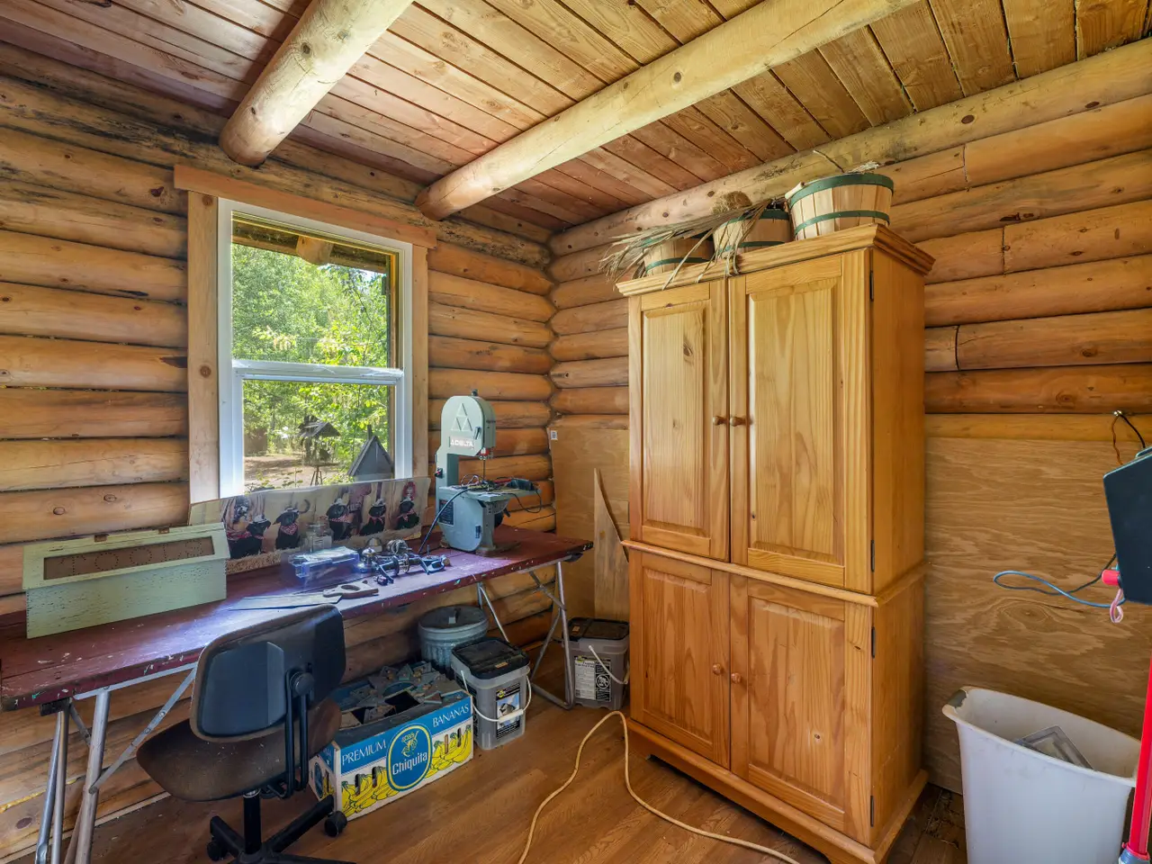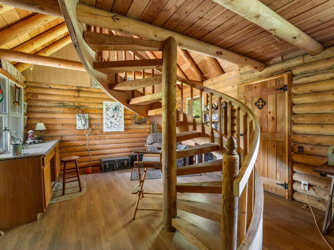Log cabin hobby room with spiral staircase