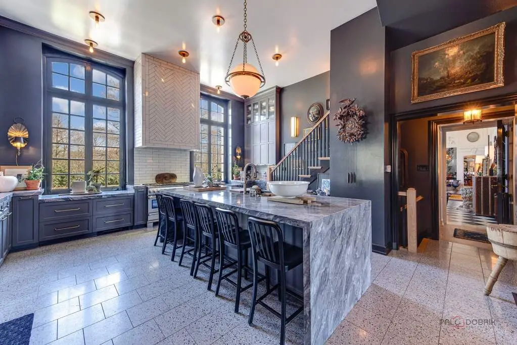- State-of-the-art kitchen with custom cabinets & marble island