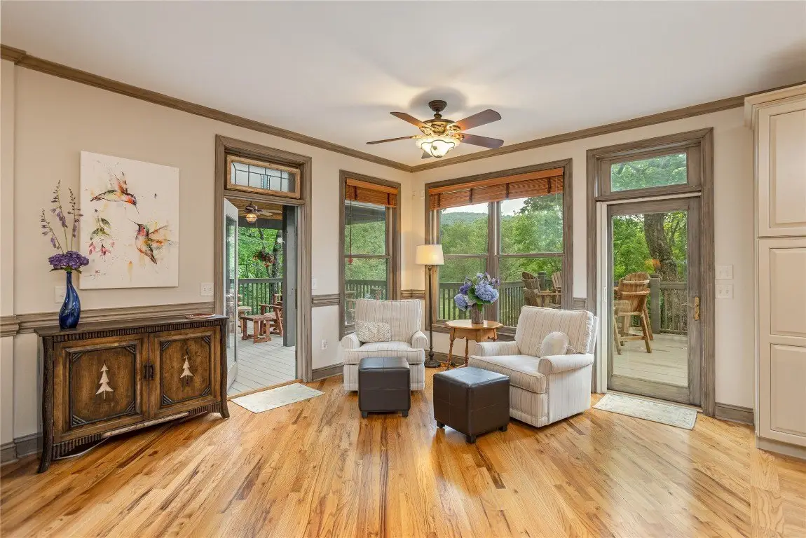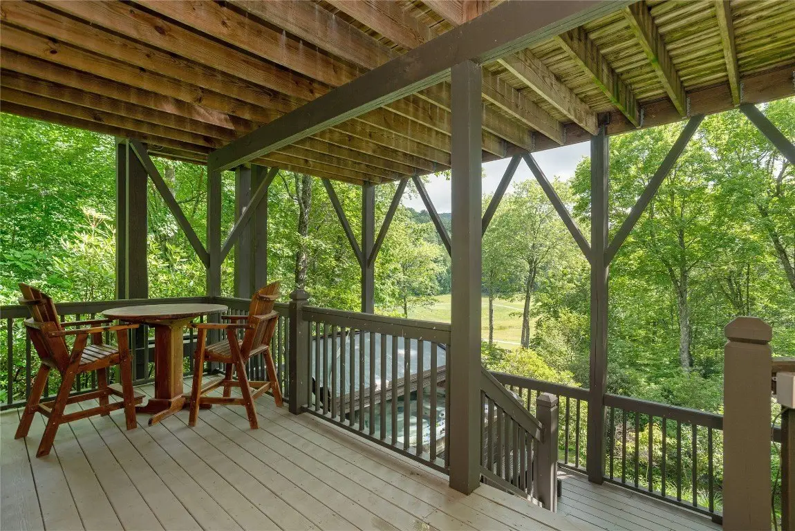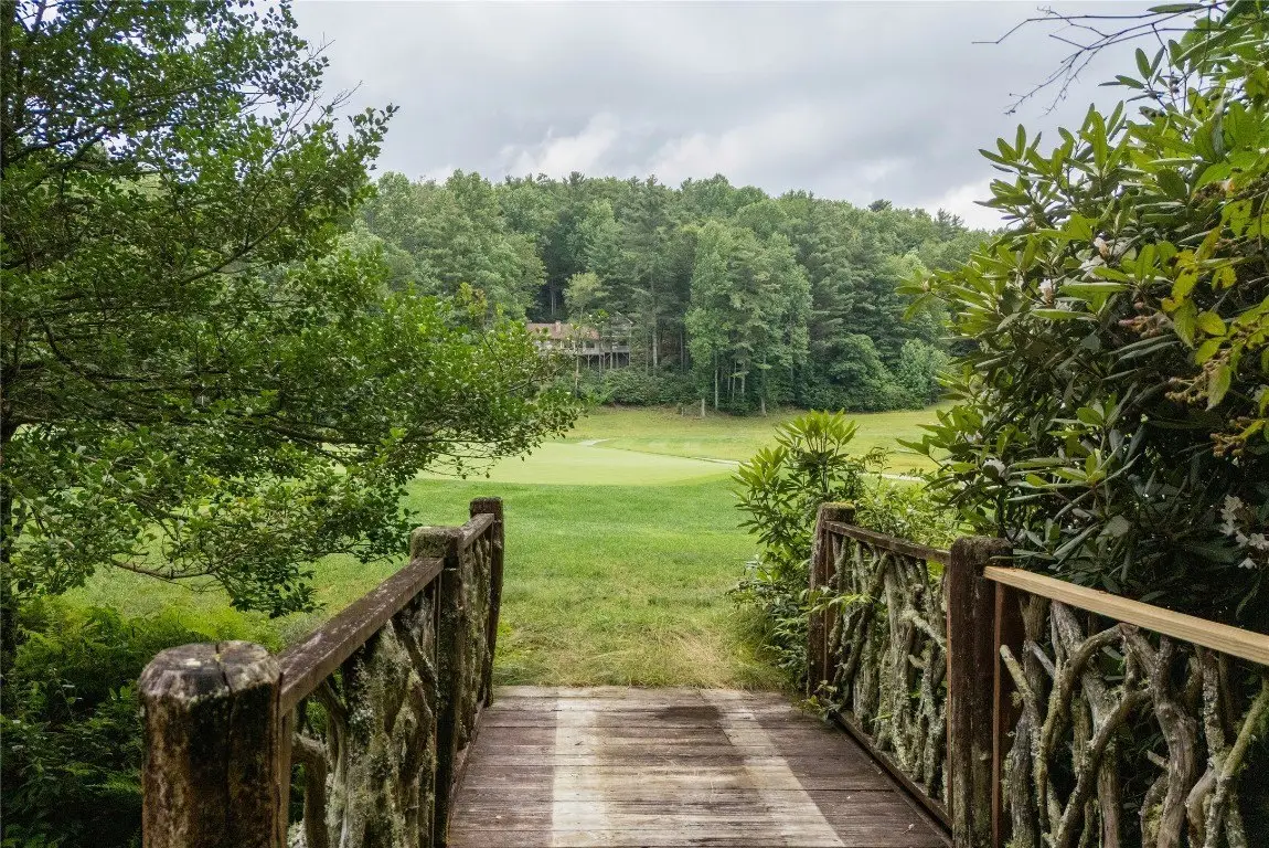 This one-of-a-kind, beautifully maintained four-bedroom, four-bathroom Arts and Crafts mountain retreat combines timeless craftsmanship with refined comfort, offering expansive golf course and mountain views from a prized location along the fifth green of the Lake Toxaway Golf Course. A private winding golf cart path leads from the home across a gentle stream and charming bridge directly onto the fairway, inviting peaceful excursions right from the backyard. The lushly landscaped entry, complete with a tranquil water feature, sets the stage for the serenity that defines this exceptional escape. Inside, custom details and quality finishes abound - a striking locust column and crown moulding as well as slate, oak, and ceramic tile flooring and a heated marble bathroom floor in the primary suite, which blends beauty and comfort. The main level features a vaulted ceiling entryway, a welcoming living room featuring a stone fireplace, an updated chef's kitchen with high-end stainless steel appliances, pot filler, ample counter space, a spacious laundry/mudroom, a comfortable guest suite, and a generous primary suite that opens to a covered Carolina porch with skylights and its own outdoor fireplace - perfect for cool evenings. Upstairs includes a private guest suite, additional living area, and a versatile bonus room. The lower level offers a cozy family room with a kitchenette and free-standing fireplace, a wine cellar, a light-filled flex room, a large guest suite, and a workshop. Outdoor spaces include open decks on both levels, a hot tub under the stars, and ample parking with a double garage - ideal for hosting family and friends. Located less than an hour from Asheville Regional Airport and close to the charming towns of Cashiers, Highlands, Sapphire, and Brevard, this home offers easy access to national forests, hiking trails, waterfalls, and endless adventure. An optional membership at Lake Toxaway Country Club provides golf, tennis, dining, fitness, pool, and private lake access. This exceptional retreat is more than a home - it's a lifestyle.