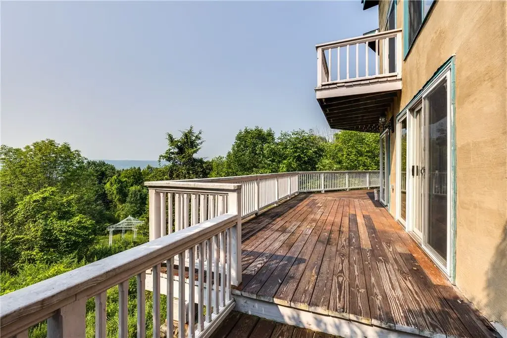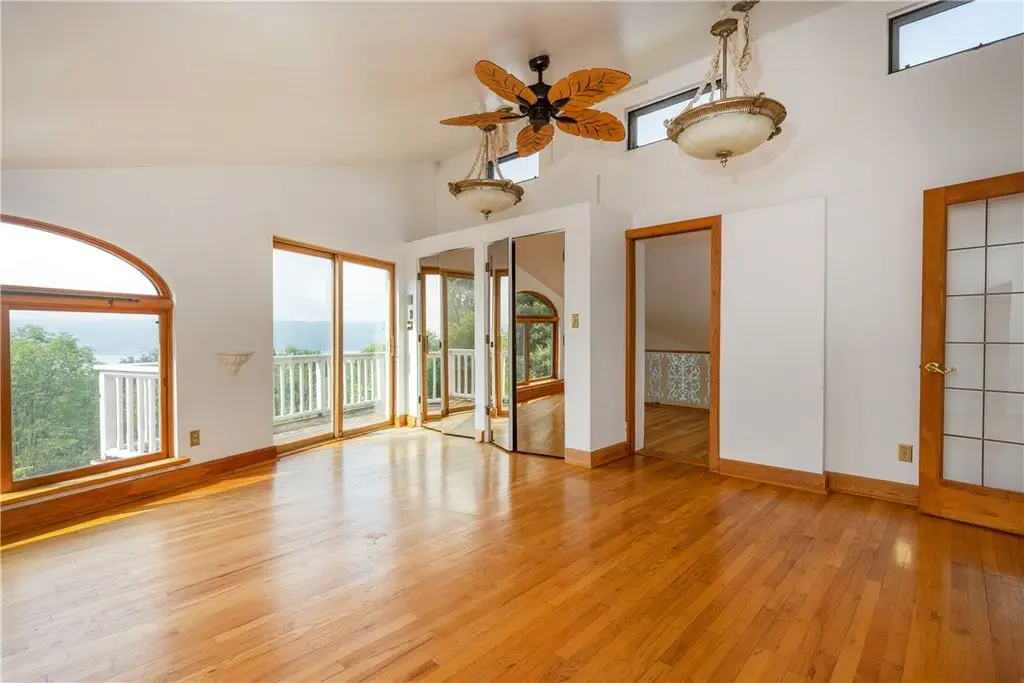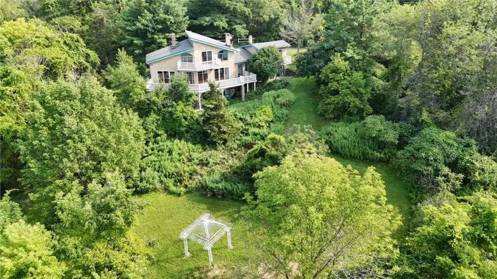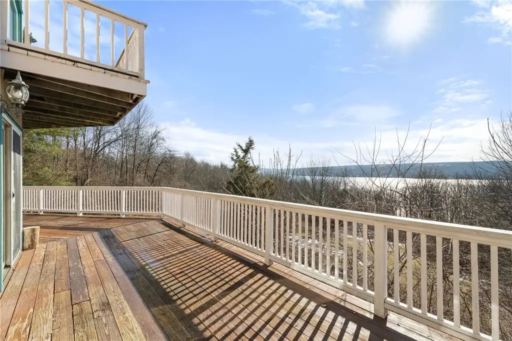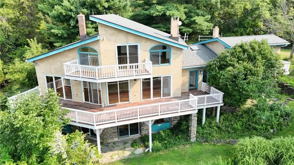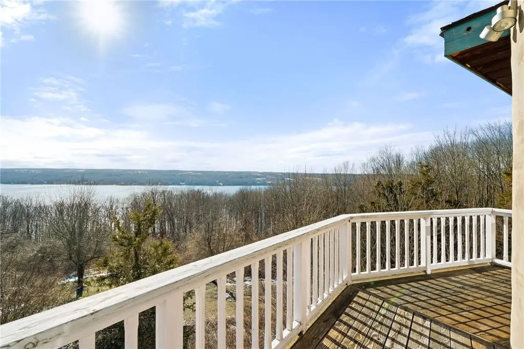 Perched on 1.82 acres with stunning views of Cayuga Lake, this 4-bedroom, 4-bath contemporary home offers space, versatility, and breathtaking scenery. The open-concept main living area features a spacious living/dining room and kitchen, anchored by a cozy wood-burning fireplace and opening to an expansive deck overlooking the lake. Gleaming hardwood floors flow throughout, leading to two distinct private bedroom suites one with a wood stove, full bath, and office space, and the other with its own bath and loft. The lower level offers even more possibilities with a generous walk-out living area, kitchenette, full bath, and gas fireplace. Sliding glass doors open to a separate studio space complete with another full bath ideal for guests, an office, or creative pursuits. Recent updates include a new forced-air furnace. Outside, multiple decks and patios provide the perfect spots to take in the views, while a private hot tub offers the ultimate place to relax and unwind.