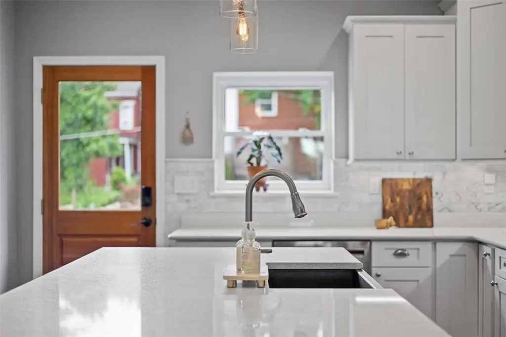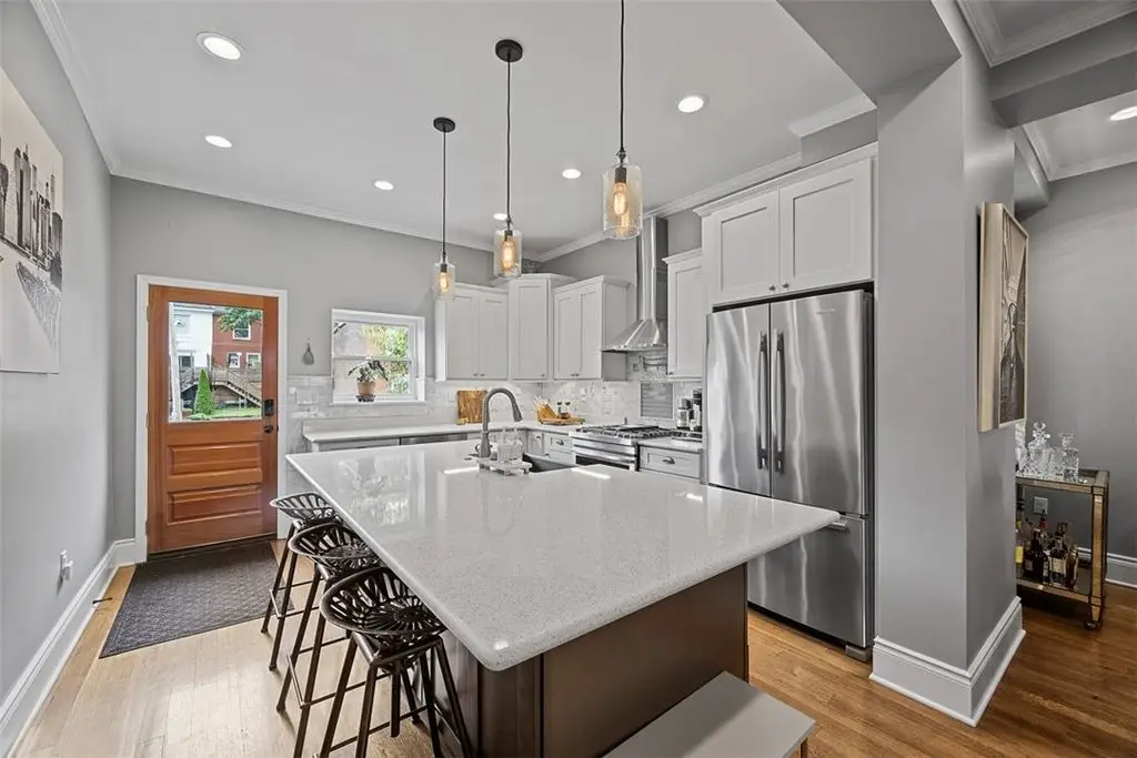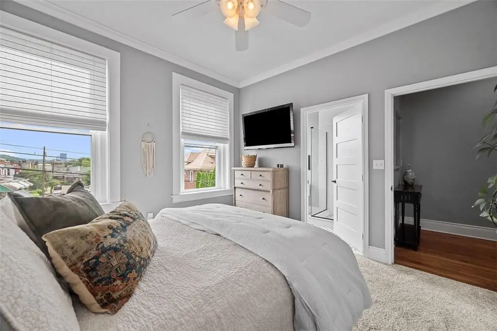 This stunning, fully renovated home blends classic architectural sophistication with top-tier modern upgrades. The open-concept main floor boasts genuine hardwoods, tray ceilings, and premium finishes including a Lutron Smart Lighting System and Vivint Security. The gourmet eat-in kitchen features quartz counters, sleek cabinetry, and ample space to entertain. The second floor offers an ensuite bedroom, two additional bedrooms, a stylish full bath with double vanity. The third-floor primary suite is a retreat with a spa-like bath, soaking tub, dual vanity, and custom walk-in shower. The basement includes a 4th full bath and walk-out access via double metal doors, ideal for indoor-outdoor entertaining or future finishing. Enjoy the fenced yard with maintenance-free turf and 2 off-street parking spaces. Prime location near the Strip, East End, hospitals, universities, and major highways.