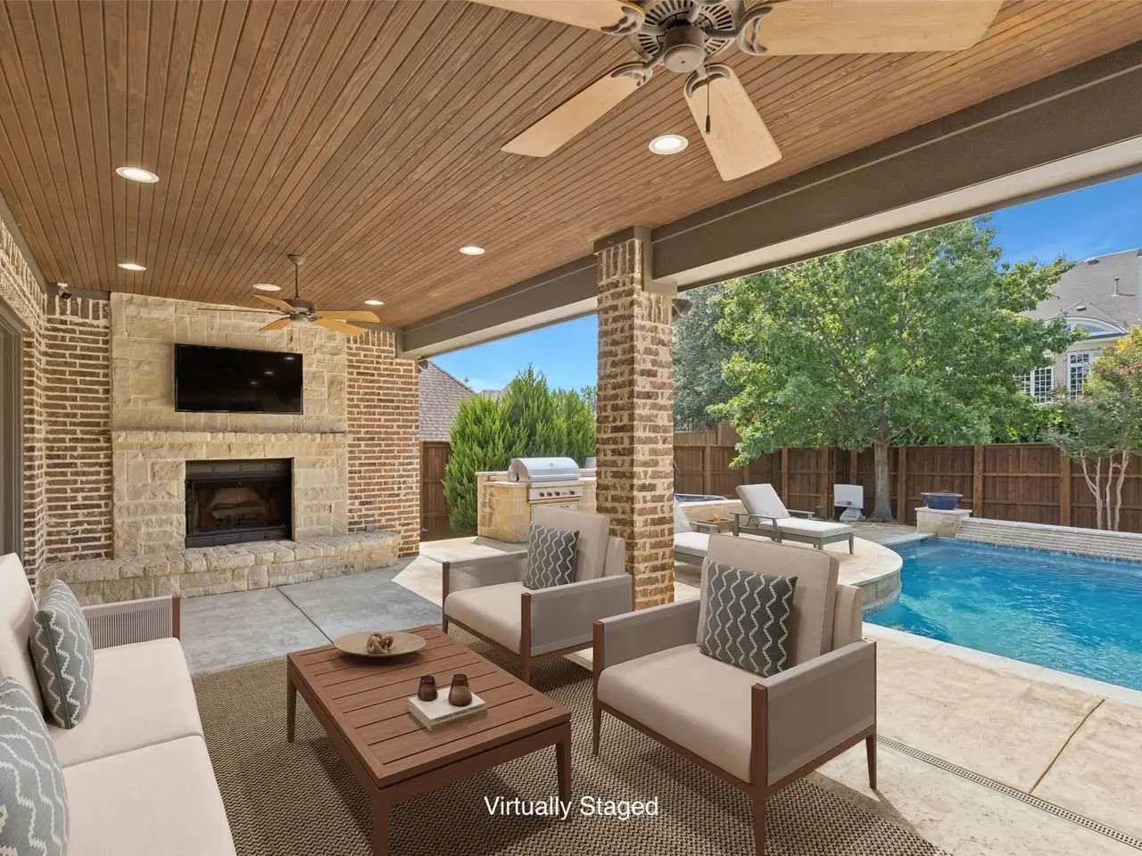 Beautifully designed with remarkable attention to detail, this Castle Hills home offers over 5,300 square feet of living space on a landscaped 0.325-acre lot. The flexible floor plan includes five bedrooms plus a private office, elegant dining areas, a spacious game room, and a fully equipped media room. The gourmet kitchen is the centerpiece of the home with built-in refrigerator, commercial-grade range, double ovens, expansive island, and walk-in pantry. It flows seamlessly into the family room with stone fireplace and views of the backyard. The primary suite on the main level is a private retreat featuring dual vanities, soaking tub, separate shower, and a generous walk-in closets with secondary washer and dryer connections. Highlights include hardwood and stone floors, wainscoting, decorative lighting, granite counters, multiple staircases, and a 3-car garage with alley access. Smart wiring, built-ins, and abundant storage add to the homes functionality. Outdoor living is exceptional with a sparkling pool, outdoor shower, covered patio, built-in grill, and full outdoor living centerperfect for entertaining or relaxing. The landscaped yard offers privacy and plenty of space to enjoy year-round. Located in the desirable Castle Hills community, residents enjoy access to walking trails, lakes, parks, golf, tennis, and a vibrant town center with shops and dining. Zoned to Lewisville ISD schools, this property combines luxury, comfort, and convenience in one of North Texas premier neighborhoods.