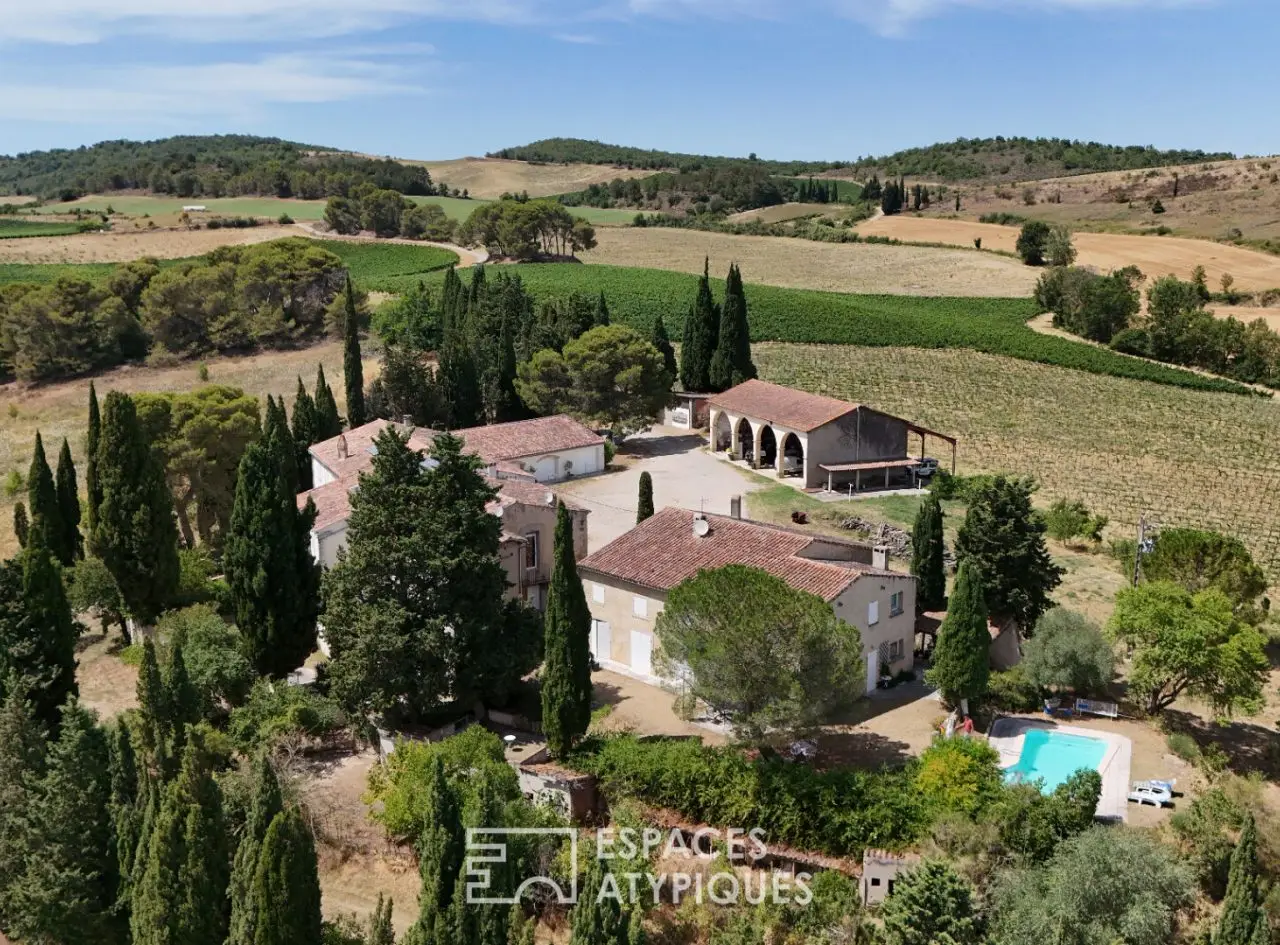 Nestled in the heart of the Limoux hills, this prestigious wine estate spans over 17 hectares, including 10 hectares of vineyards, and offers a built-up area of over 1,000 m2 (1,080 sq ft) spread across three characterful residences. A true haven of peace and rare charm, offering breathtaking views of the surrounding countryside, with no overlooked views.The interior space consists of three independent dwellings: a former late 19th-century stable, elegantly renovated by architect Henri Castella, featuring a cathedral ceiling, travertine floors, four bedrooms, a swimming pool, and a summer kitchen; a family mansion dating from 1848 with five bedrooms, antique terracotta floors, and a large fireplace; and finally, a farmhouse, renovated in 2011, measuring over 400 m2 (4,300 sq ft), with an open-plan kitchen, a large living room, a games room, a panoramic glass roof, five bedrooms, and the potential for conversion into a gym or private cinema.In addition, there is a separate 53 m2 apartment and a 500 m2 wine cellar on two levels, fully equipped (stainless steel and concrete vats, air-conditioned storage), allowing for a production of 800 hl per year. A 200 m2 hangar and a metal awning complete the complex.The natural park, composed of vineyards, meadows, woods, and scrubland, guarantees tranquility and biodiversity. Ideal for a B&B project, an event venue, or an ambitious winery.Nearby amenities: shops, schools, Limoux train station (10 minutes away), Carcassonne airport (30 minutes away).Energy Performance Certificate (DPE): C / Climate Performance Certificate (GES): C. Estimated annual expenditure: between €2,800 and €3,850.Information on the risks to which this property is exposed is available on the Georisques website.A rare property for heritage and nature lovers, to be discovered without delay.REF. 11754LCAdditional information* 18 rooms* 14 bedrooms* Floor : 2* 2 floors in the building* Outdoor space : 230000 SQM* Property tax : 7 549 €Energy Performance CertificateEPC : 98 kWhEP/m2.year* A 450GHG : 28 kgeqCO2/m2.year* A 80Agency feesThe fees include VAT and are payable by the vendorMediatorMediation Franchise-Consommateurswww.mediation-franchise.com29 Boulevard de Courcelles 75008 ParisInformation on the risks to which this property is exposed is available on the Geohazards website : www.georisques.gouv.fr