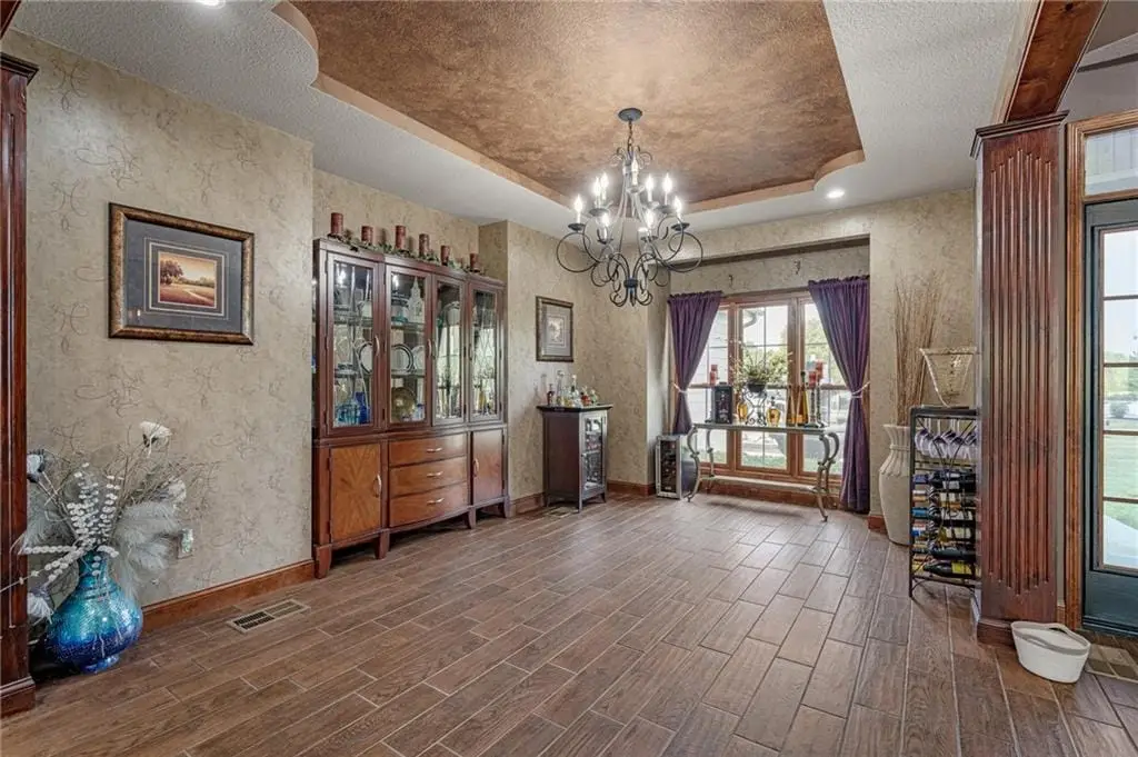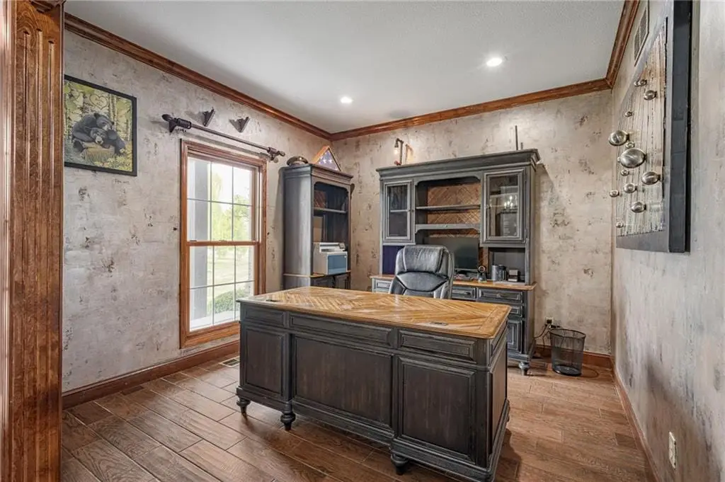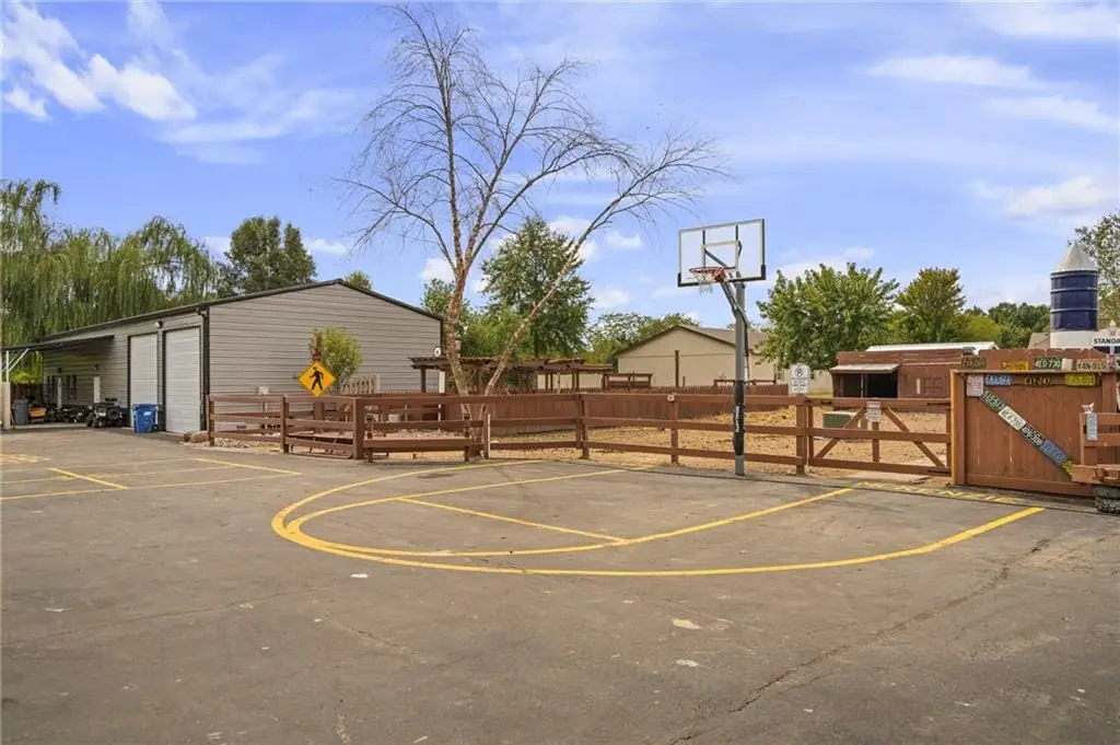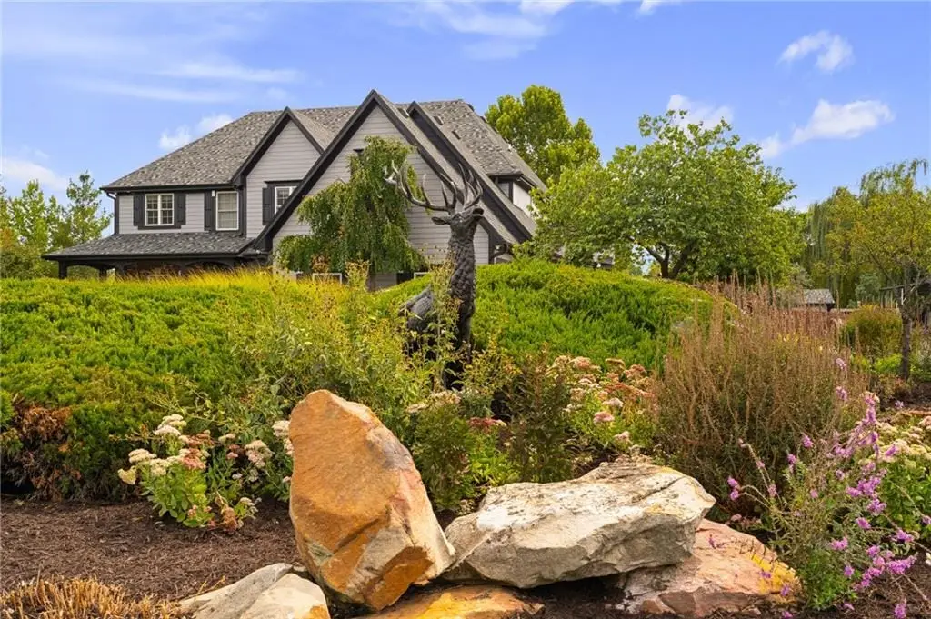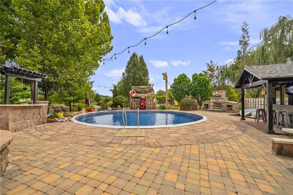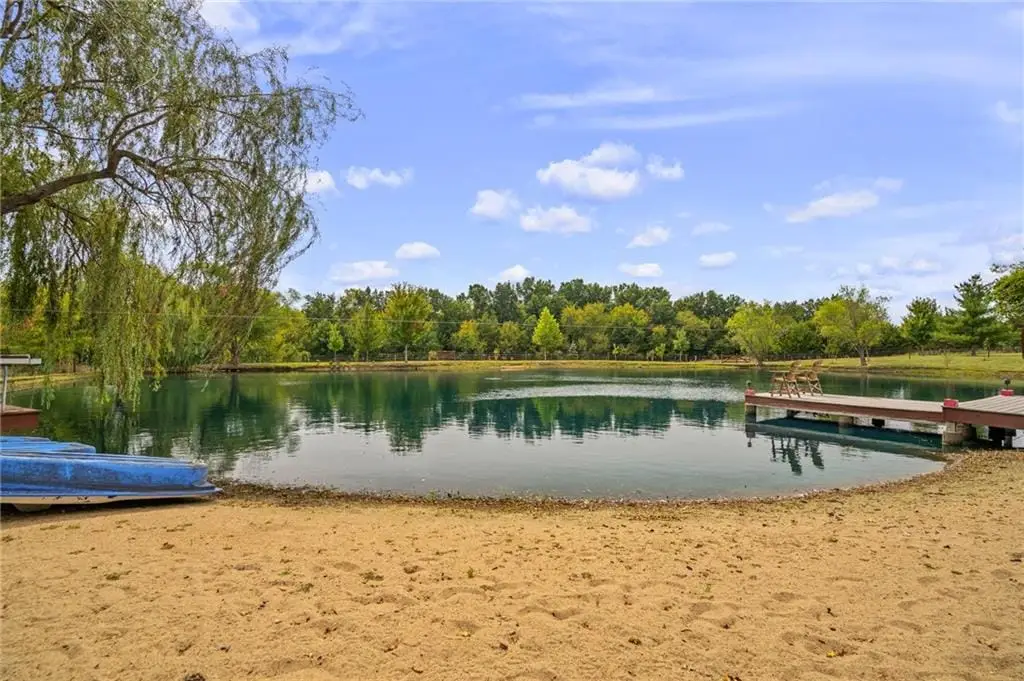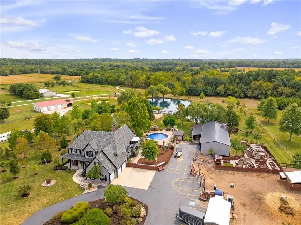 Unmatched in character and amenities, this gated 5-acre Lone Jack property is designed for those who love to entertain, live outdoors, and need space for a home-based business. The grounds are extraordinary, with two large ponds - one offering a sandy beach, dock, playhouse with hurricane deck, and zip line, the other showcasing a dramatic 12-foot stone waterfall. Multiple weeping willows surround the water, creating a picturesque, park-like setting. Outdoor living is unbelievable with a swimming pool, outdoor shower, festive poolside bar, basketball court, striped parking for nine cars, multiple firepits, fountains, and extensive landscaping and unique trees. A huge raised-bed garden with drip irrigation and automatic watering, vintage 1950s merry-go-round, playground and pergola framed with wisteria over the water complete the retreat. The 2006-built two-story home offers quality and comfort with hard surface flooring throughout the main level, five fireplaces, formal dining, office, and a hearth room/kitchen with island seating for five, Viking six-burner cooktop. French doors open to a fenced dog yard with pergola and hibachi grill. Upstairs, four bedrooms each enjoy private baths; the oversized primary suite boasts a fireplace, sitting area, private covered balcony with mini split, and a massive walk-in closet. The walkout lower level is built for gathering, with a theater, arcade, full bar, non-conforming fifth bedroom, full bath, and access to a saloon-style patio with hot tub and firepit. Complete set up for livestock and farm animals with fenced pen, multiple shelters and duck pond. The property also includes a new outbuilding with concrete floor, two large overhead doors, built-in compressor, and plumbing for living quarters - ideal for equipment storage, hobbies, or running a business. Meticulously maintained and set on blacktop, this one-of-a-kind estate combines resort-style living with everyday functionality - an entertainer’s paradise inside and out.