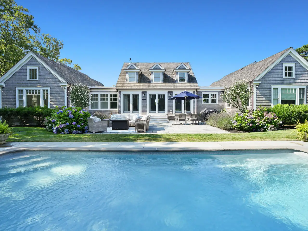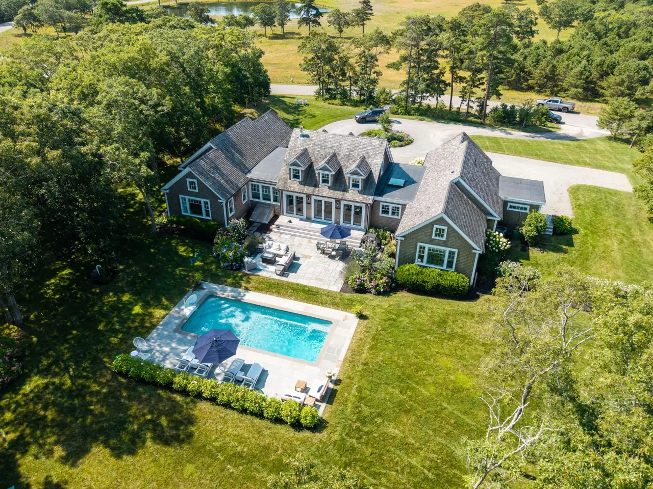 Refined Vineyard Living in The Preserve - Set gracefully on a knoll with sweeping views of a tranquil pond and surrounding grasslands, this beautiful residence offers a masterful blend of traditional coastal architecture and modern luxury. Located in the prestigious enclave of The Preserve, this sprawling home is designed for effortless elegance, privacy, and indoor-outdoor living. At the heart of the home lies an expansive great room with soaring cathedral ceilings, rich paneling, and detailed millwork. Flooded with natural light from an array of dormers and oversized windows, the space is warm and welcoming. Three sets of French doors open to a bluestone terrace, complete with multiple seating areas and a heated, saltwater pool-an idyllic setting for al fresco dining, entertaining and lounging. The chef's kitchen overlooks both the dining area and the great room, creating a seamless flow for everyday living and hosting. Each wing of the home is thoughtfully arranged: one side features a cozy secondary living room or study and a luxurious primary suite with a spa-like bath and custom walk-in closet. The opposite wing houses three generously sized guest bedrooms, each with cathedral ceilings, walk-in closets, and ensuite baths. Additional highlights include a welcoming side entrance with a well-designed mudroom and a separate laundry room, and a finished lower level offering a media room, full bath, and ample storage. Custom built-ins, refined finishes, and architectural details are found throughout, enhancing the home's timeless character and sophistication. Surrounded by beautifully landscaped grounds and mature plantings, the property offers a rare sense of seclusion. The Preserve is a highly sought-after neighborhood with walking trails that connect to conservation land, and easy access to the bike path, Farm Neck Golf & Tennis, and all down-island towns.