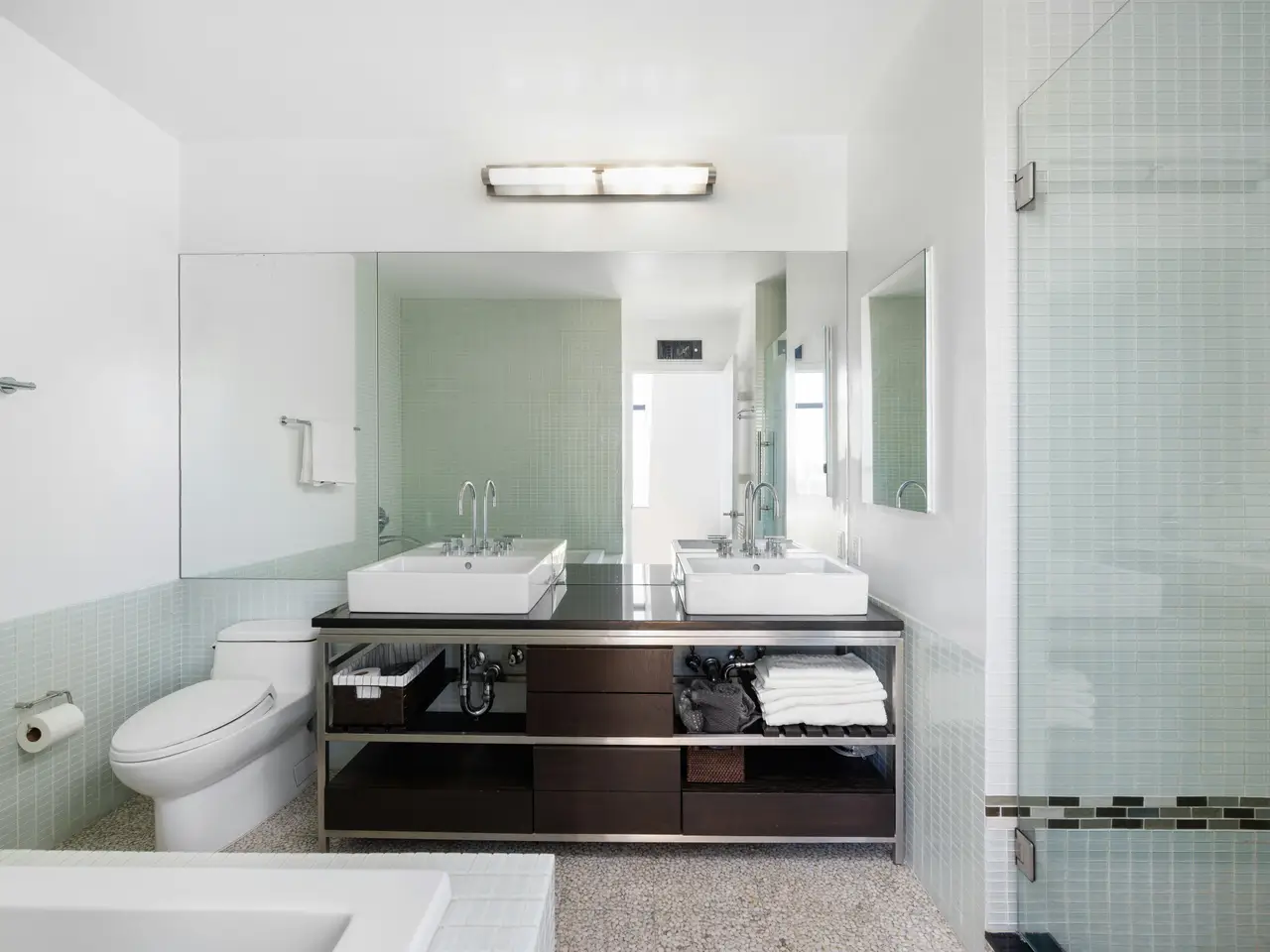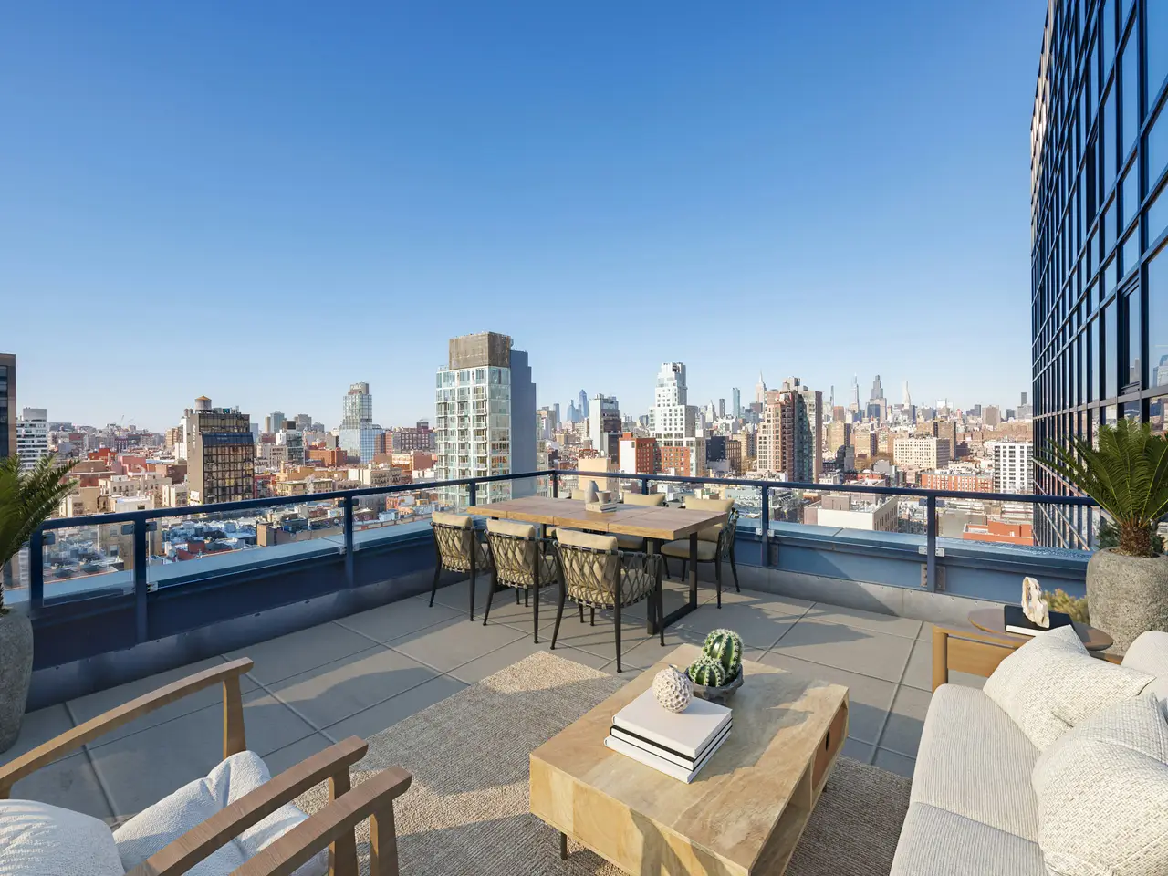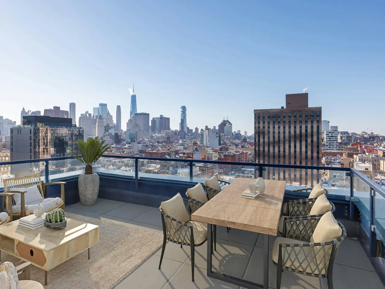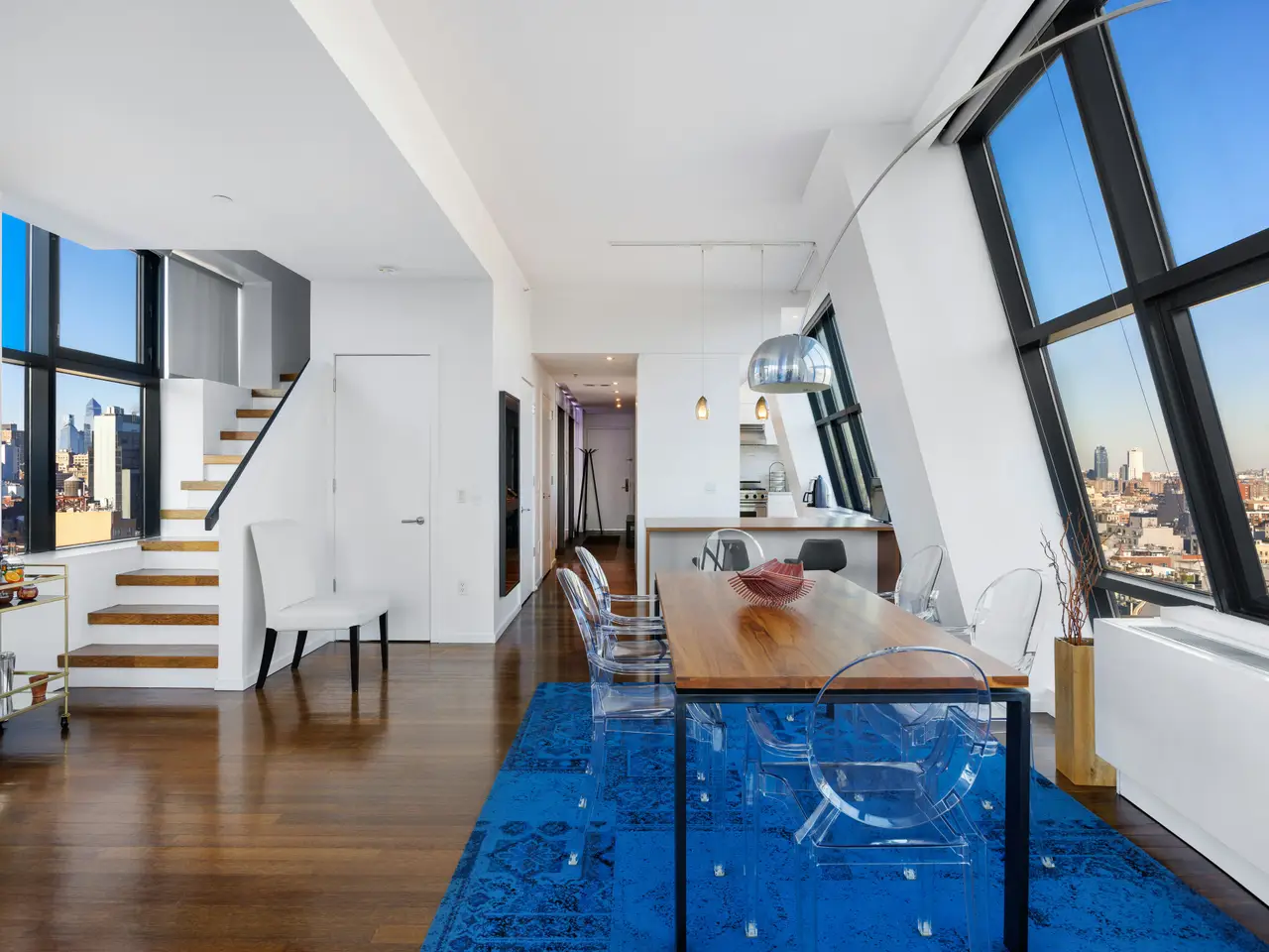 True Duplex penthouse condos (no one living above you) are rare; there are currently only 12 listed. Not only is this the least expensive, but the average cost of the other 11 is almost double that of this listing. This is not because this one is a slouch-quite the opposite. To begin with, it has the best view of all of them, but there is so much more because, at 2,500 sf, this true penthouse with two bedrooms, three baths, and an oversized Direct Living terrace is a perfect home. The lower floor is completely dedicated to the public spaces, while the upstairs is for the private areas, and the two are seamlessly separated by a windowed staircase. The key-locked elevators open on the public floor, so let's begin here. The first thing you notice is the clever flow created by opening the wall between the foyer and the kitchen. This improved both rooms. The vestibule is now a bright area with ingenious storage spaces and display shelves, ensuring that this often-forgotten spot is fully integrated, it even has a full bathroom on the north end. This bathroom's noteworthy feature is a widowed shower. (don't worry no neighboring building is high enough). The living spaces on the south side of the gallery are striking with their panoramic views (not hyperbole here. However, they need to be seen in person to be fully appreciated because the 10+ft ceiling height, full-height glass on three sides, and a slant on the east side make the room appear smaller in pictures. However, the floor plan does not lie, at 17x32, this is a very large room. One standout feature of this penthouse is the perfectly proportioned Direct Living terrace. At an almost square configuration, this terrace is perfect for entertaining. With nearly 300 degrees of open views, you have plenty to gawk at, but with no building blocking your view North, your vista of midtown is among the best I have ever seen. The kitchen is truly a study in clever design, and what you end up with is a very practical space with stunning views, plenty of storage, and commercial-grade appliancestruly a chef's dream. The aforementioned opening to the vestibule makes the kitchen feel much larger and creates a super cool dining counter. While the low storage cabinets on the slanted east wall are so clever, you can see the next owner continuing them everywhere this wall is exposed. Up the windowed staircase are two bedrooms, each with an ensuite bathroom, the smaller bedroom has a wall of windows facing east, awarding you perfect sunrise views framed by the Williamsburg Bridge, which is quite unique. The primary is a complete suite with a walk-in closet, a five-fixture bathroom, and three exposures. Regardless of the open feel these windows provide, privacy is ensured throughout, with no building on your elevation within reach. To round out the offering on the table here, the apartment has a washer and dryer. And this unit comes complete with a private storage space with its own electricity, making it a perfect wine storage. The Condo building is called BLUE; it was built in 2007 by the acclaimed architect Bernard Tschumi. It offers 8000 square feet of terraces along with Fios internet, refrigerated storage, a bike room, a full-time doorman, and concierge services. Conveniently situated fifty feet from the F-J-M-Z trains, BLUE is nestled within the vibrant heart of New York's bustling Lower East Side, with all of your favorite amenities, including the famed Essex Market, Katz' Delicatessen, Russ & Daughters, the New Museum and so much more.