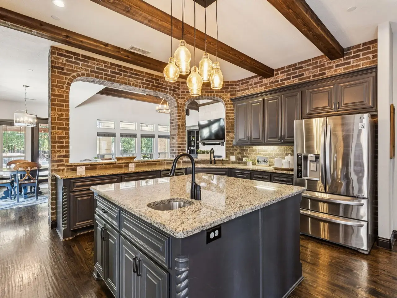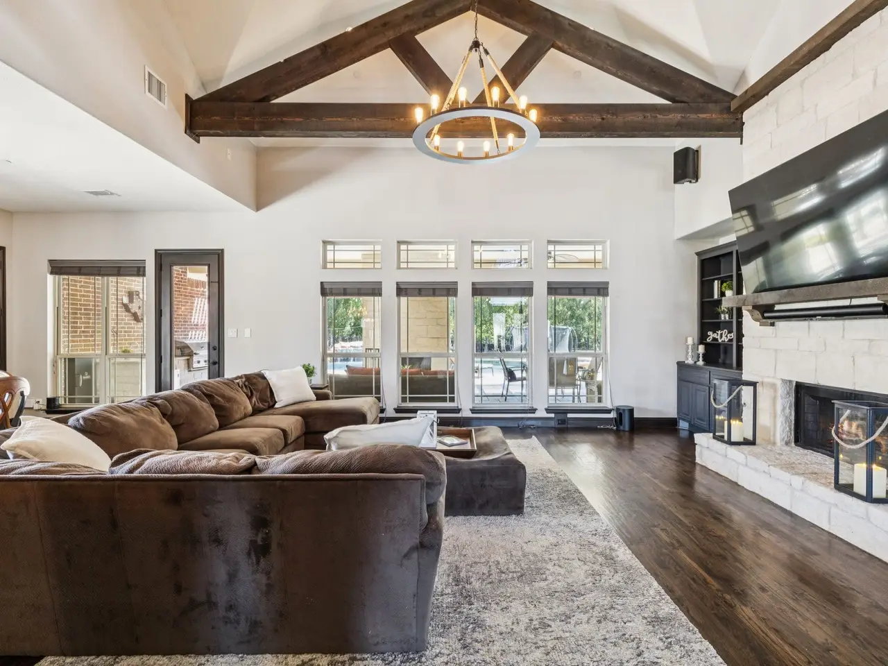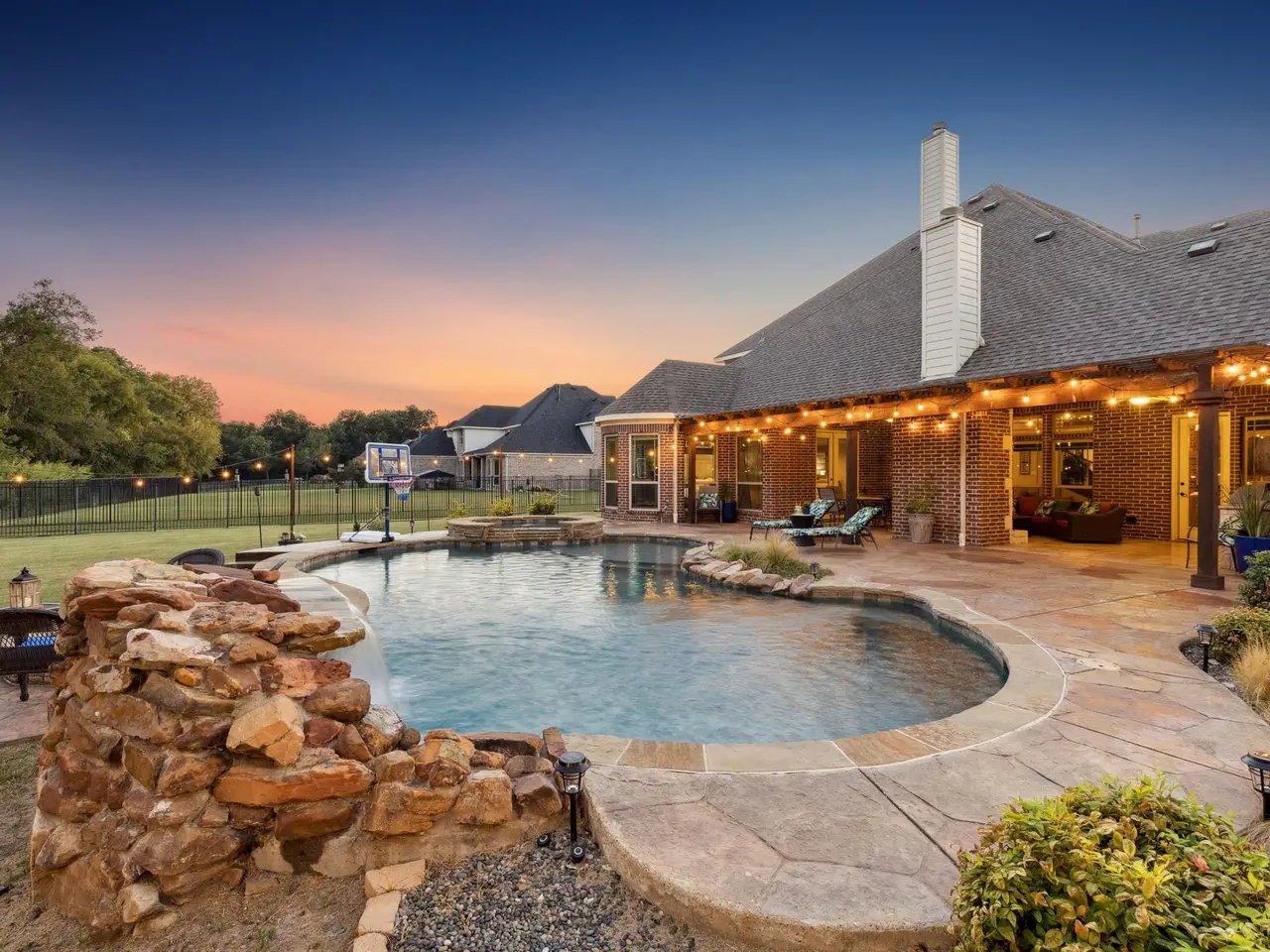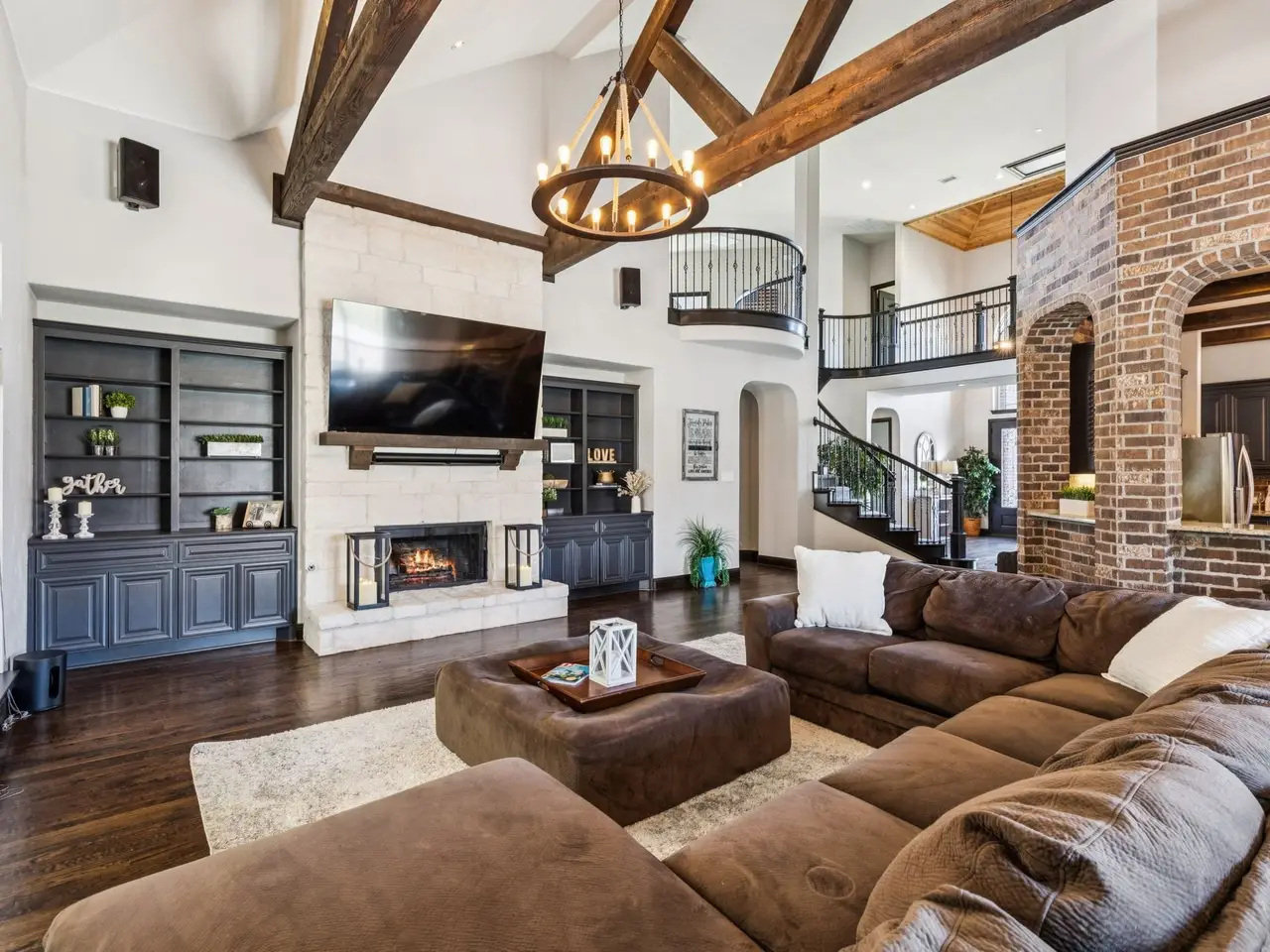 Welcome to your private retreat - an EXTRAORDINARY FAMILY ESTATE OFFERING NEARLY 8000sqft OF COMBINED LIVING SPACE which incl the primary residence plus GUEST HOUSE & ULTIMATE MAN CAVE all nestled on 2.65 acres backing to a serene wooded creek. From the moment you arrive, the striking brick and stone architecture, turret detail, and expansive landscaping set the tone for something truly special. Step inside to soaring vaulted ceilings with wood beams, warm wood floors and brick wall accents. The chef's kitchen is a dream with Electrolux appliances, dbl ovens, granite counters, prep sink, RO water system and abundant cabinetry. Entertain with ease in the oversized living areas, game room & media room with Sony projector, speakers, wet bar and wine fridge. Every detail has been carefully planned from the whole-home water softener and filtration system to the thoughtful layout. Downstairs, the luxurious primary suite awaitsfeaturing a sitting area, spa-inspired bath with stone walls, earthy textures and a multi-head rain shower. The private downstairs in-law suite with full bath is perfect for guests. Upstairs the secondary bedrooms are generously sized. Don't miss the closets that can double as study or hang out spaces! Outdoor resort-style living can be enjoyed year-round amidst twinkling Edison lights. The covered patio and pergola feature a built-in kitchen and FP with plenty of room for dining and lounging. The sparkling pool incl a spa and waterfalls with firepit nearby for cool evenings. The separate guest house not only features a fitness and sports enthusiasts ideal man cave complete with industrial finishes, but also a home office and private guest suite. Amenities include a bar, island, home gym, hardwiring for media and CAT7 for hi-speed network. Parking is abundant with two 2-car garages and porte cochere. This property blends comfort, sophistication, and functionality in a way that's rare to find. Don't miss the chance to experience all it has to offer.
