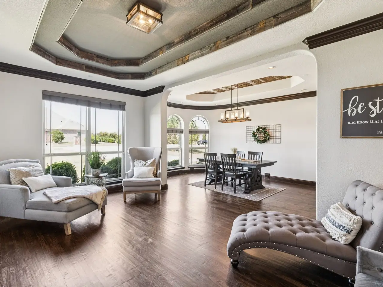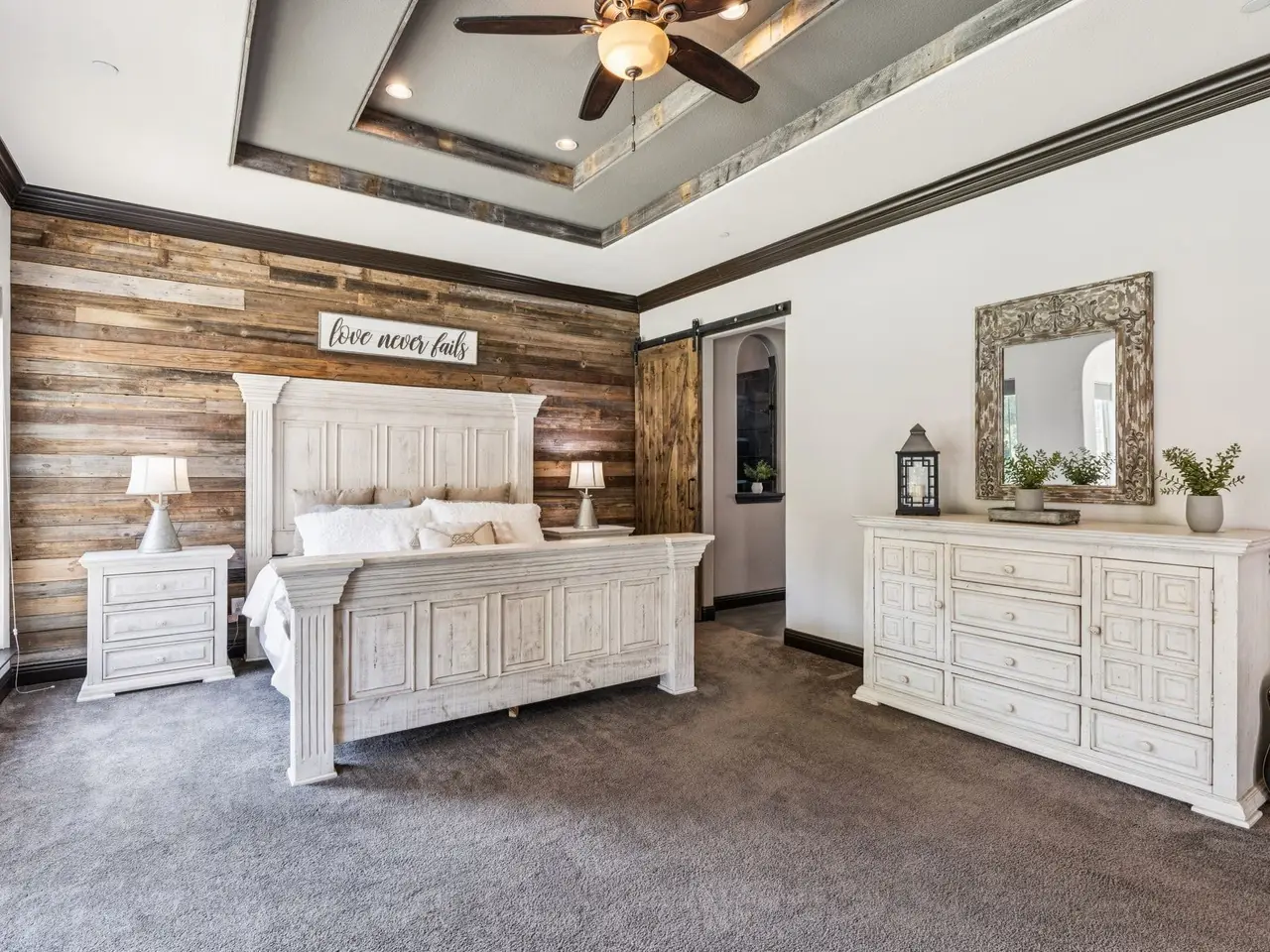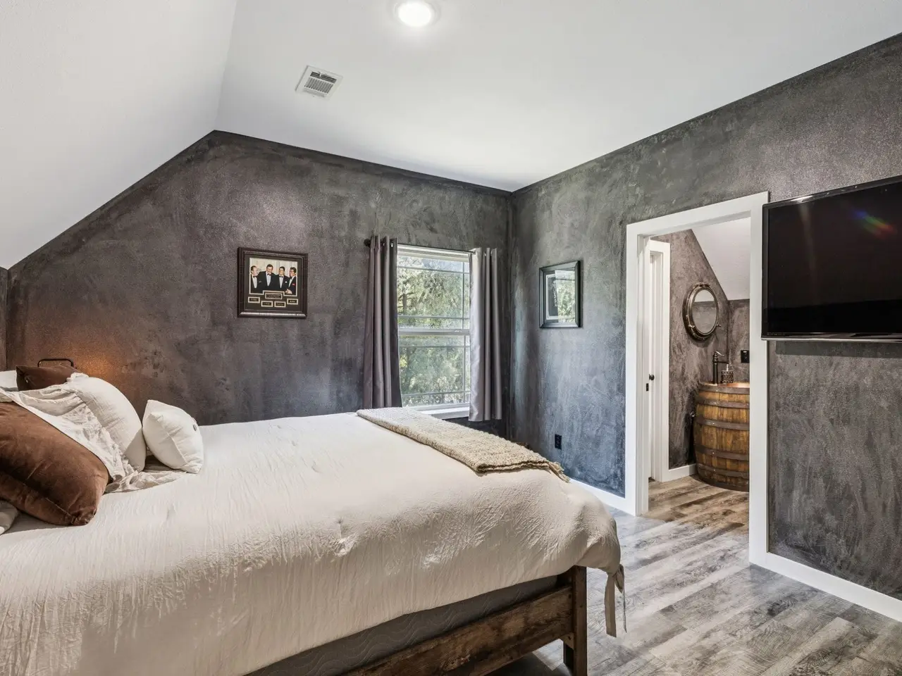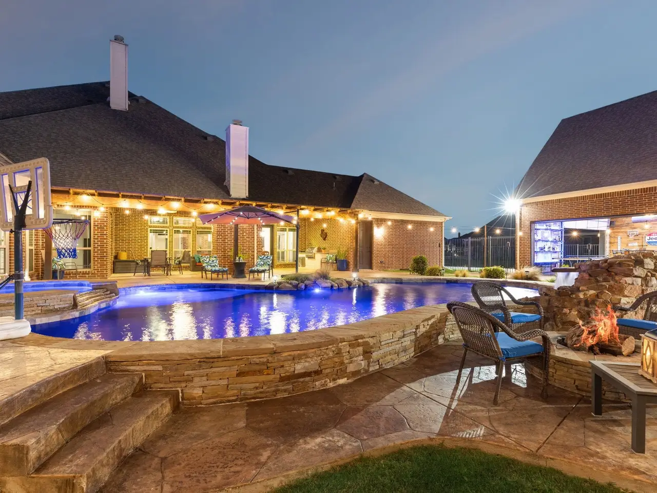 Welcome to your private retreat - an EXTRAORDINARY FAMILY ESTATE OFFERING NEARLY 8000sqft OF COMBINED LIVING SPACE which incl the primary residence plus GUEST HOUSE & ULTIMATE MAN CAVE all nestled on 2.65 acres backing to a serene wooded creek. From the moment you arrive, the striking brick and stone architecture, turret detail, and expansive landscaping set the tone for something truly special. Step inside to soaring vaulted ceilings with wood beams, warm wood floors and brick wall accents. The chef's kitchen is a dream with Electrolux appliances, dbl ovens, granite counters, prep sink, RO water system and abundant cabinetry. Entertain with ease in the oversized living areas, game room & media room with Sony projector, speakers, wet bar and wine fridge. Every detail has been carefully planned from the whole-home water softener and filtration system to the thoughtful layout. Downstairs, the luxurious primary suite awaitsfeaturing a sitting area, spa-inspired bath with stone walls, earthy textures and a multi-head rain shower. The private downstairs in-law suite with full bath is perfect for guests. Upstairs the secondary bedrooms are generously sized. Don't miss the closets that can double as study or hang out spaces! Outdoor resort-style living can be enjoyed year-round amidst twinkling Edison lights. The covered patio and pergola feature a built-in kitchen and FP with plenty of room for dining and lounging. The sparkling pool incl a spa and waterfalls with firepit nearby for cool evenings. The separate guest house not only features a fitness and sports enthusiasts ideal man cave complete with industrial finishes, but also a home office and private guest suite. Amenities include a bar, island, home gym, hardwiring for media and CAT7 for hi-speed network. Parking is abundant with two 2-car garages and porte cochere. This property blends comfort, sophistication, and functionality in a way that's rare to find. Don't miss the chance to experience all it has to offer.