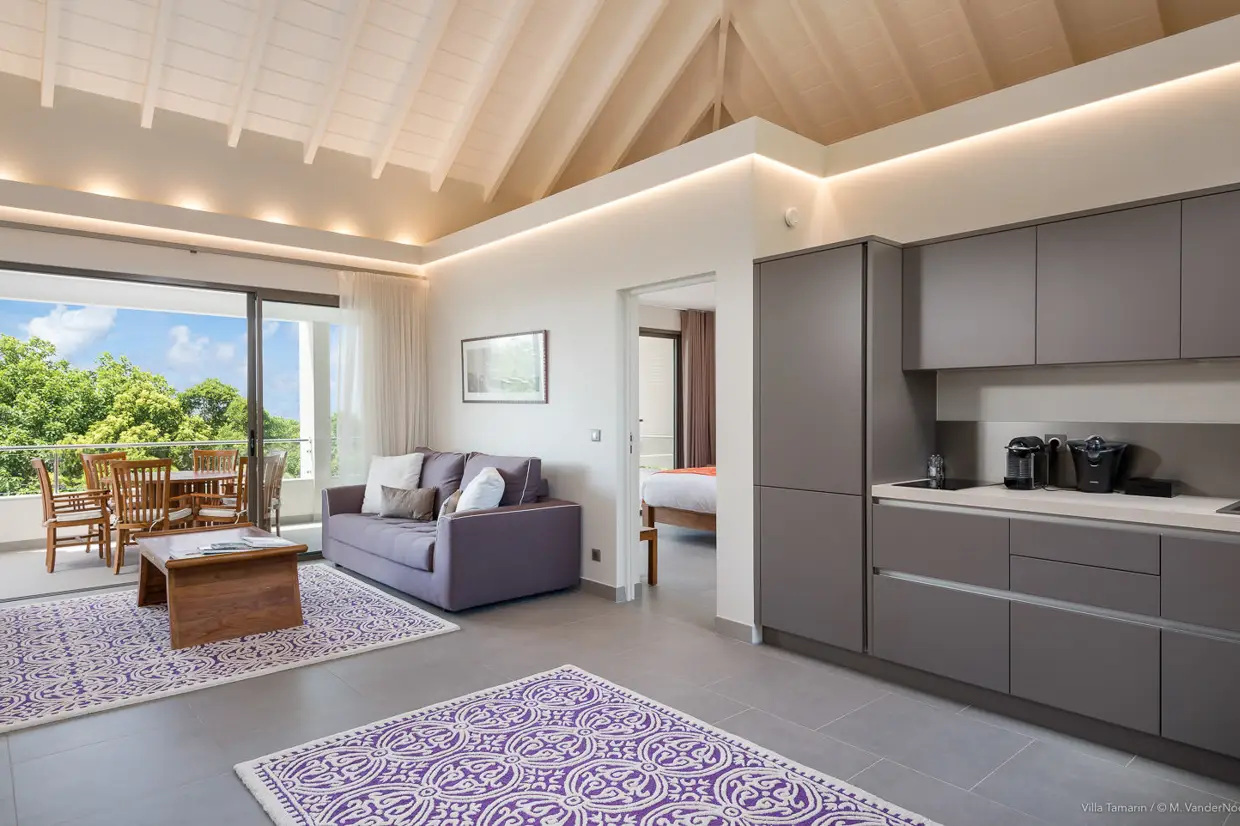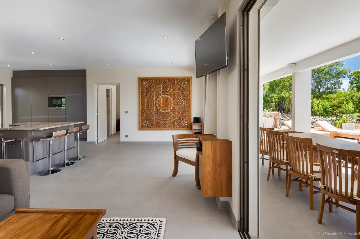 Villa Tamarin is a contemporary-style property located in the hills of Lurin, just a few minutes’ drive from the shops of Gustavia and the beaches of Gouverneur and Saint-Jean. Spread over two levels, the villa offers a warm and welcoming atmosphere, with a décor that combines wood elements with vibrant touches of color. The bright living room opens onto a fully equipped open-plan kitchen. This space leads out to a large terrace with a heated pool and sun loungers. A covered section of the terrace allows for outdoor dining at any time of day, in a peaceful setting surrounded by lush vegetation. The primary bedroom is just a few steps from the pool. An exterior staircase leads to the upper level, which features two comfortable bedrooms separated by a second living area with a kitchen corner. Each room opens onto a covered terrace with nice views of the sea and the surrounding islets. ‍