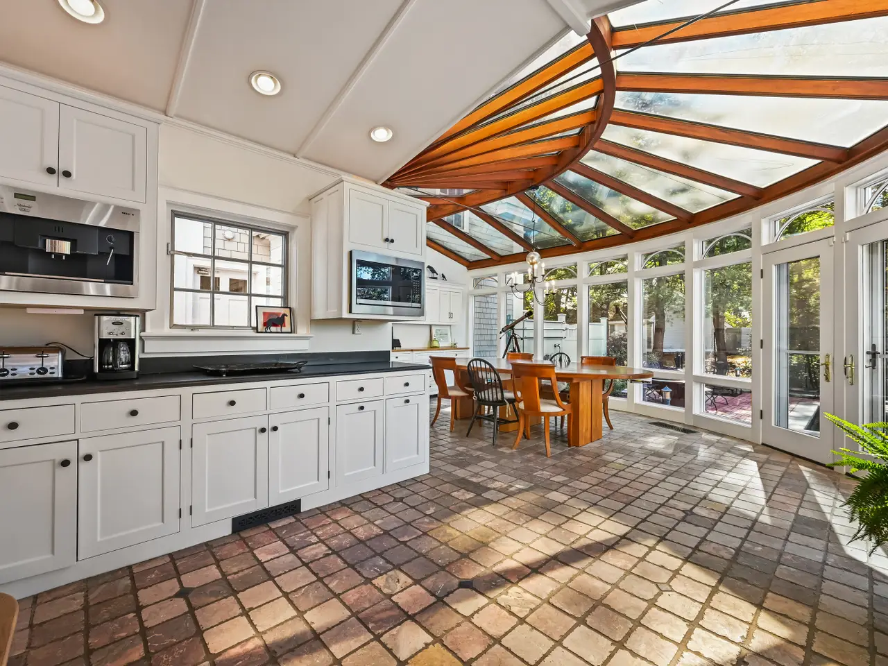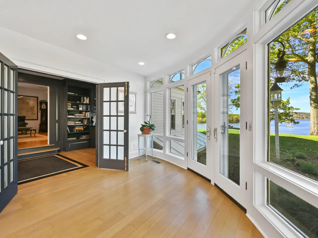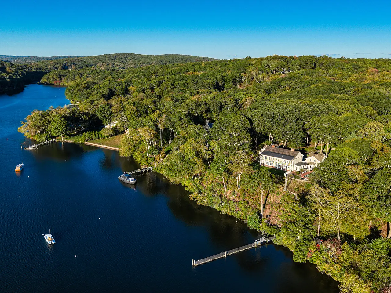 Architect-designed and inspired by Palladio's symmetry and Mount Vernon's timeless colonial grace, the essence of classic balance, symmetry, and luxury. A center-columned portico anchors the perfect proportion between two grand wings, while the interiors reveal artistry at every turn-gleaming wood floors, custom millwork, and walls of windows framing Hamburg Cove's deep-water yacht basin-where sails and yachts drift across shimmering water lusters reflecting a symphony of mystical moorings that capture what is widely considered the most breathtaking panorama on the Cove. Two magnificent semi-rotunda sunrooms at each end bathe the space in natural light, blending formal entertaining and cozy private havens that are elegant yet casual and comfortable. The chef's kitchen features a large center island and commercial-grade appliances. Two primary suites-one on each level. A large guest apartment rests over three of the six garages. The finished lower level includes a gym, billiards, and a kitchen. Landscaped grounds embrace a hardscape-wrapped pool, private expansive lawns, and stone walls-all overlooking a nightly display of fiery sunsets. The property includes one of the deepest private docks in this area-and beyond-with direct access to the Connecticut River and Long Island Sound. This remarkable waterfront residence combines architectural elegance, coastal serenity, and a setting of rare natural beauty-an extraordinary lifestyle between Boston and New York.