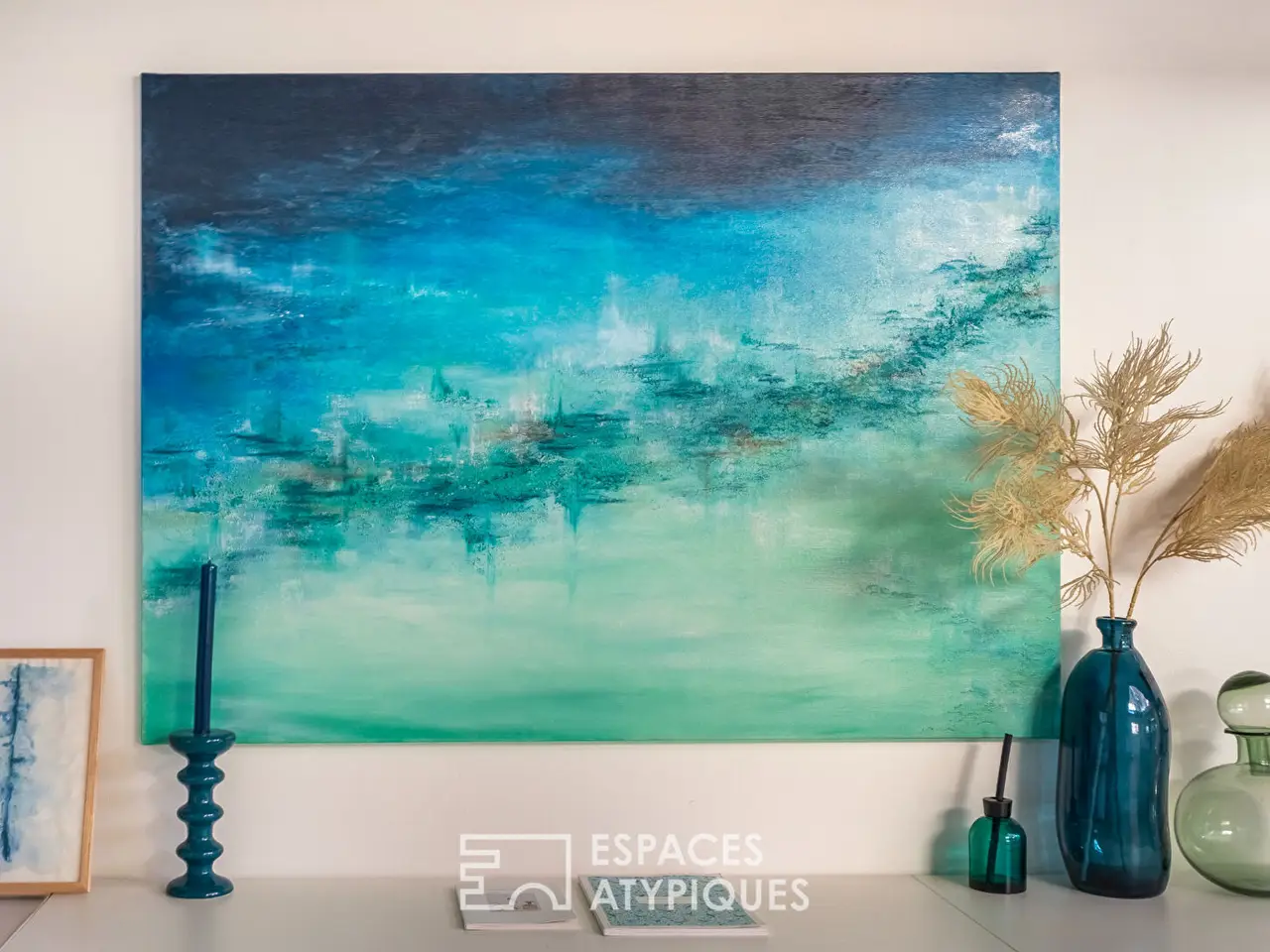 The kitchen, measuring over 11 m2, fully equipped and featuring numerous built-in units, opens onto the dining room, the true heart of the loft. This room impresses with its 6-meter ceiling height thanks to an extraordinary ceiling opening.
